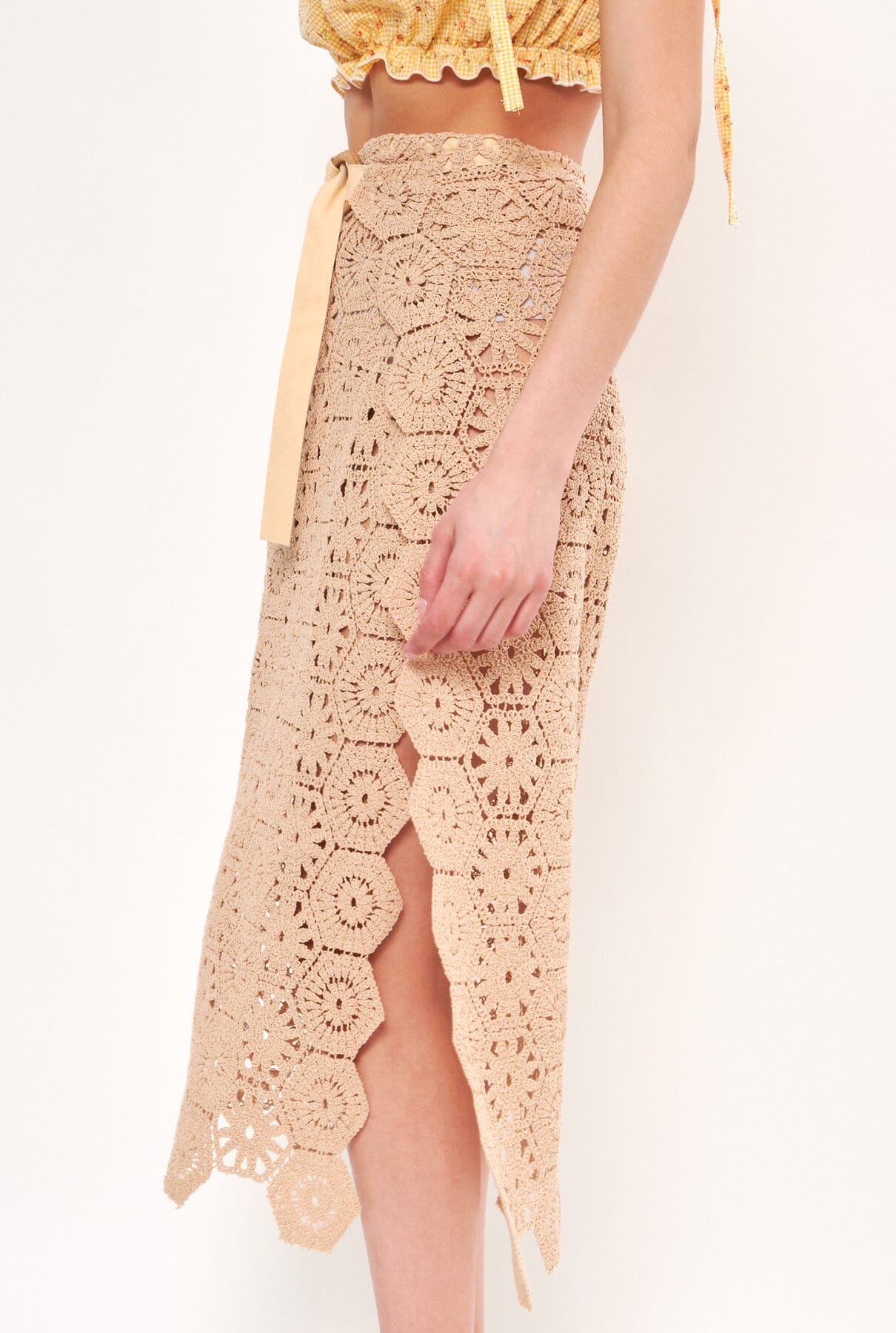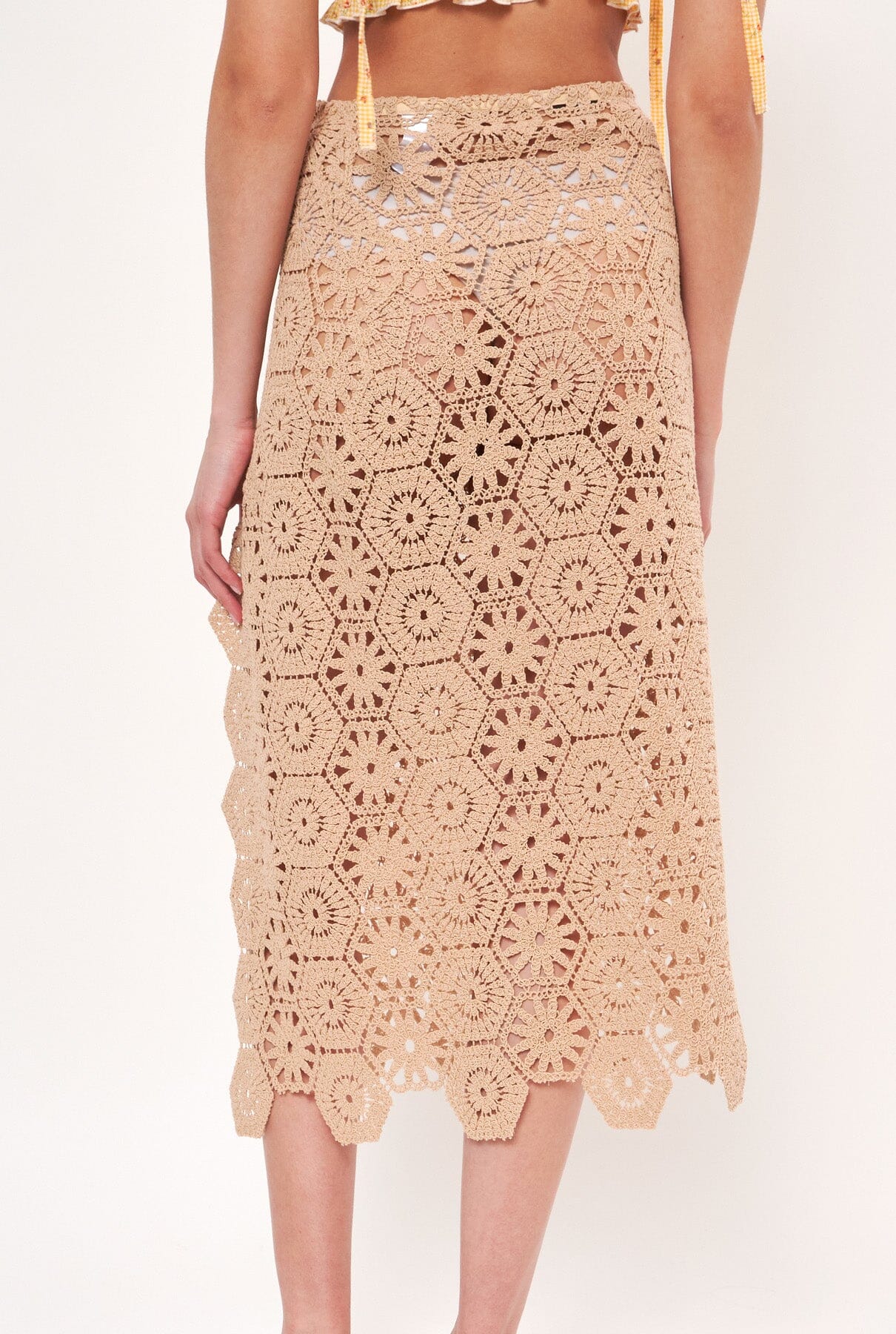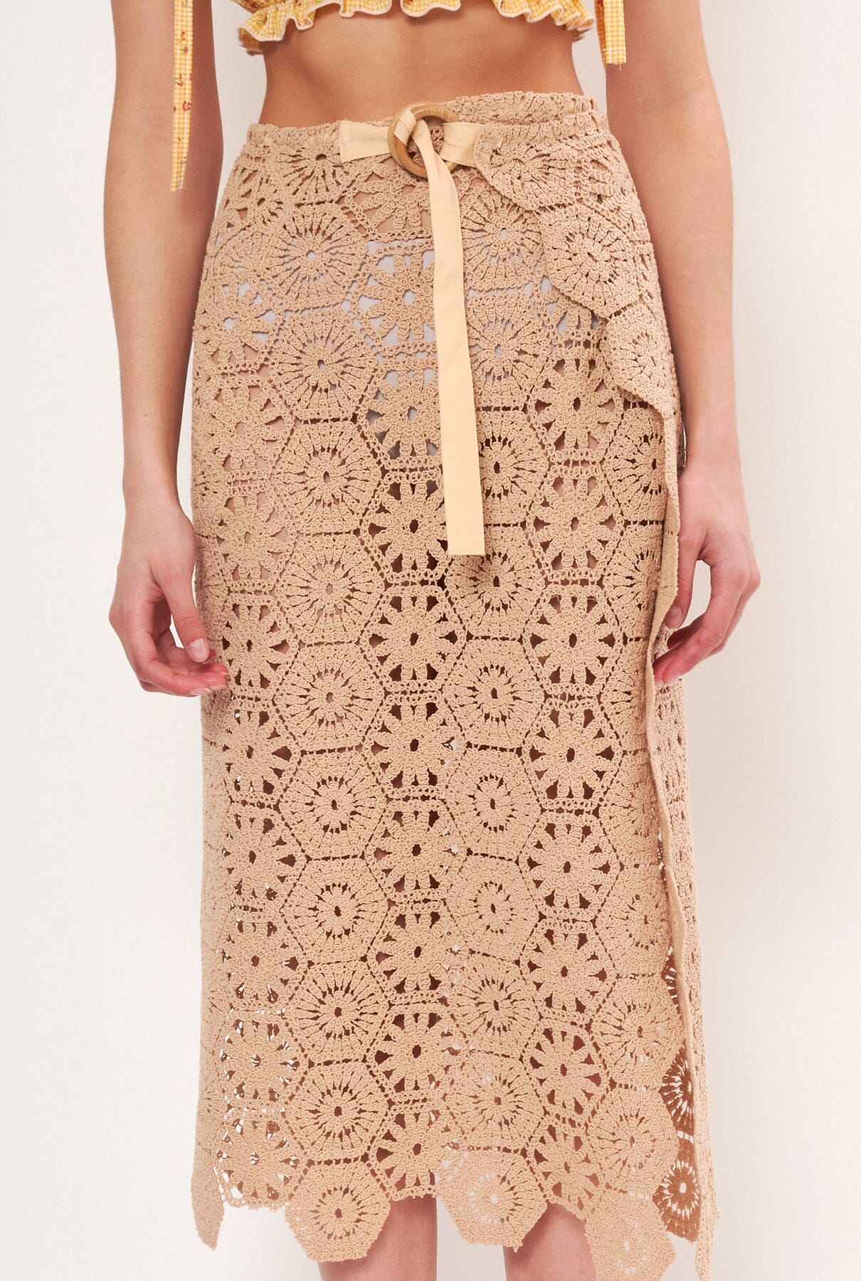 Falda pareo en tejido de crochet. Original cierre lateral con anillas de madera y cinta de algodón. Te sugerimos usarlo sobre tu traje de baño o bikini para la piscina o la playa;