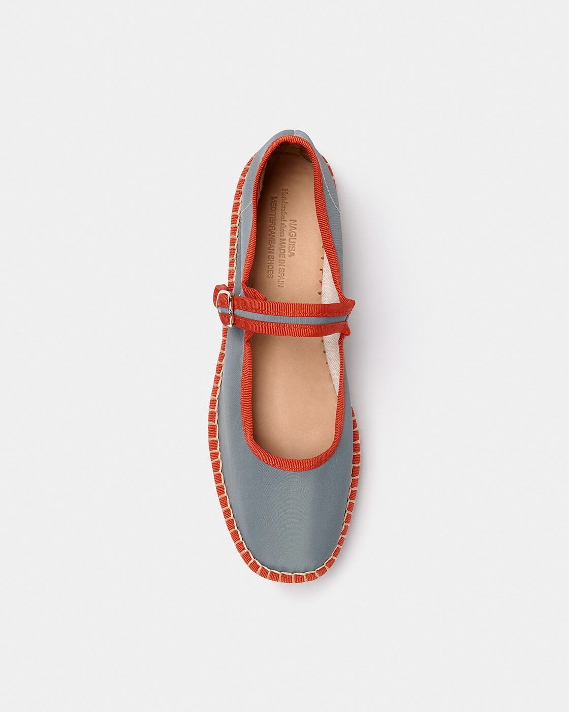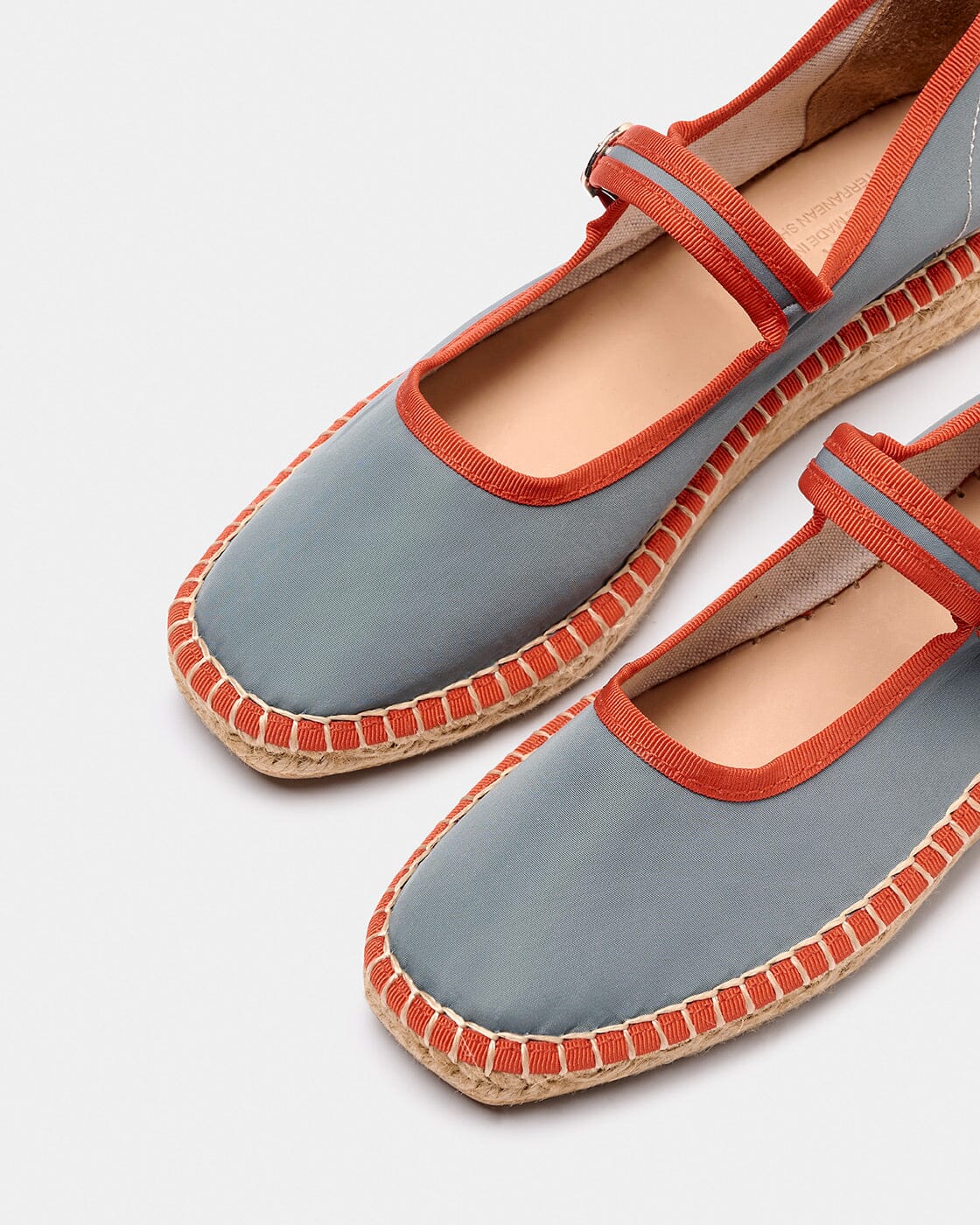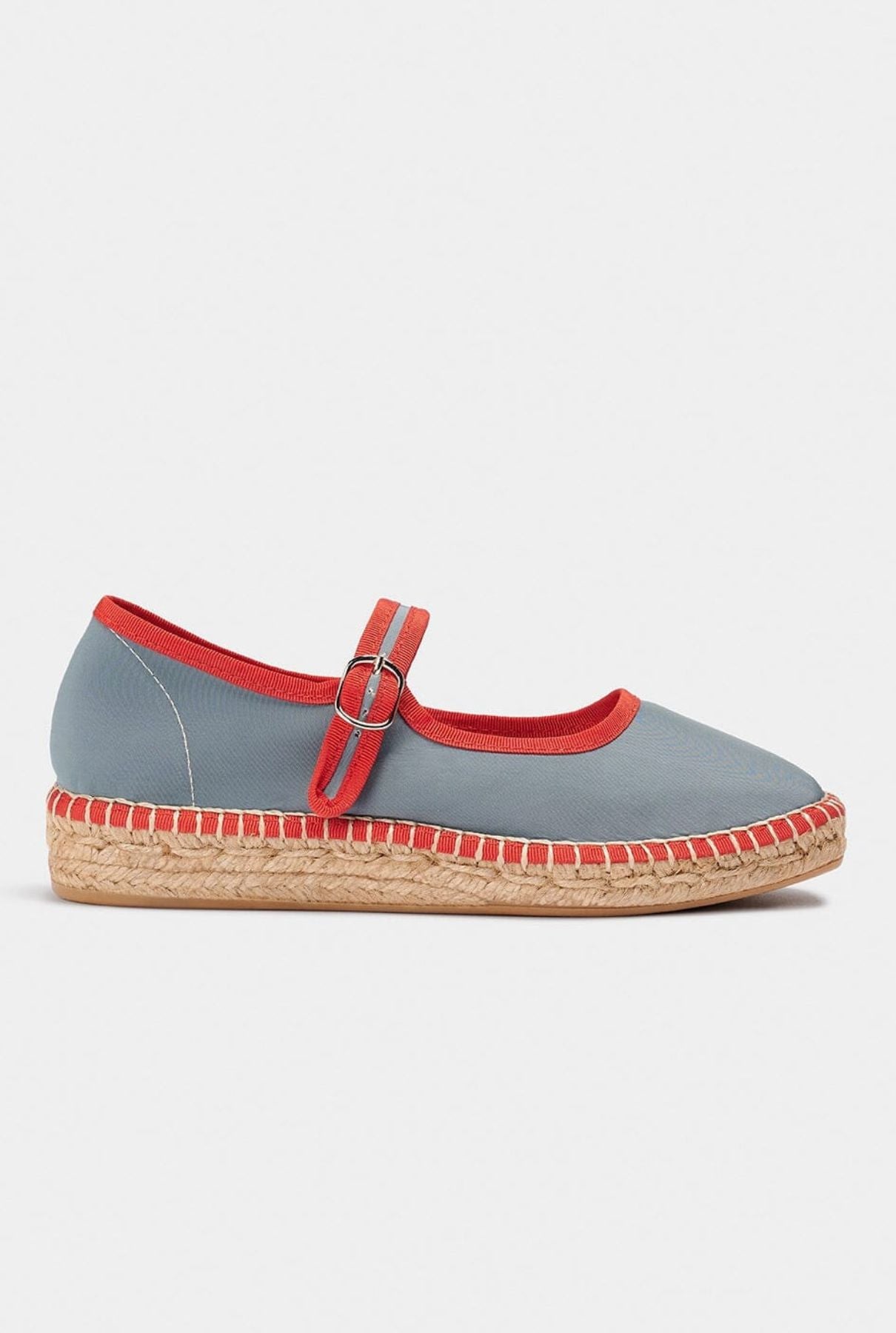 Peonia es una alpargata estilo esparto con ribete en contraste. La parte superior está hecha de tela de algodón y forro. La suela está acolchada con espuma y forrada con piel de vacuno natural para que los pies respiren. La suela, con puntera cuadrada, está hecha con un sencillo trenzado de yute, una pequeña cuña para mayor comodidad y una suela de goma antideslizante. La altura total es de 3 cm.