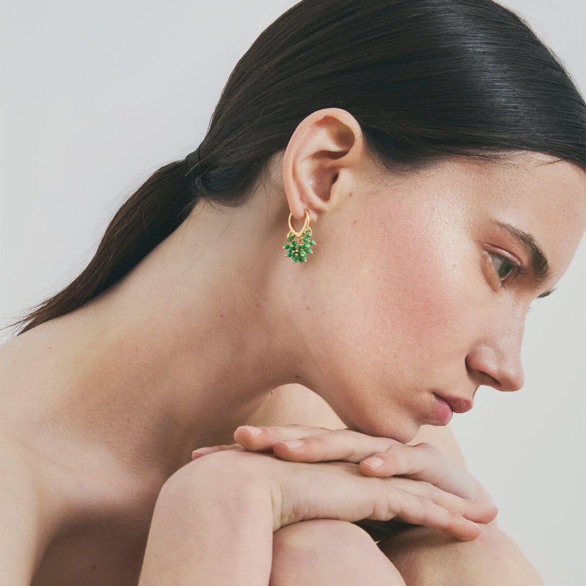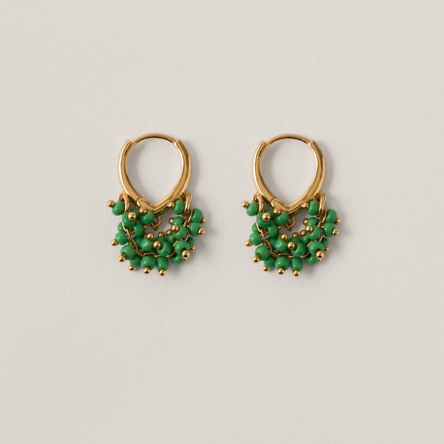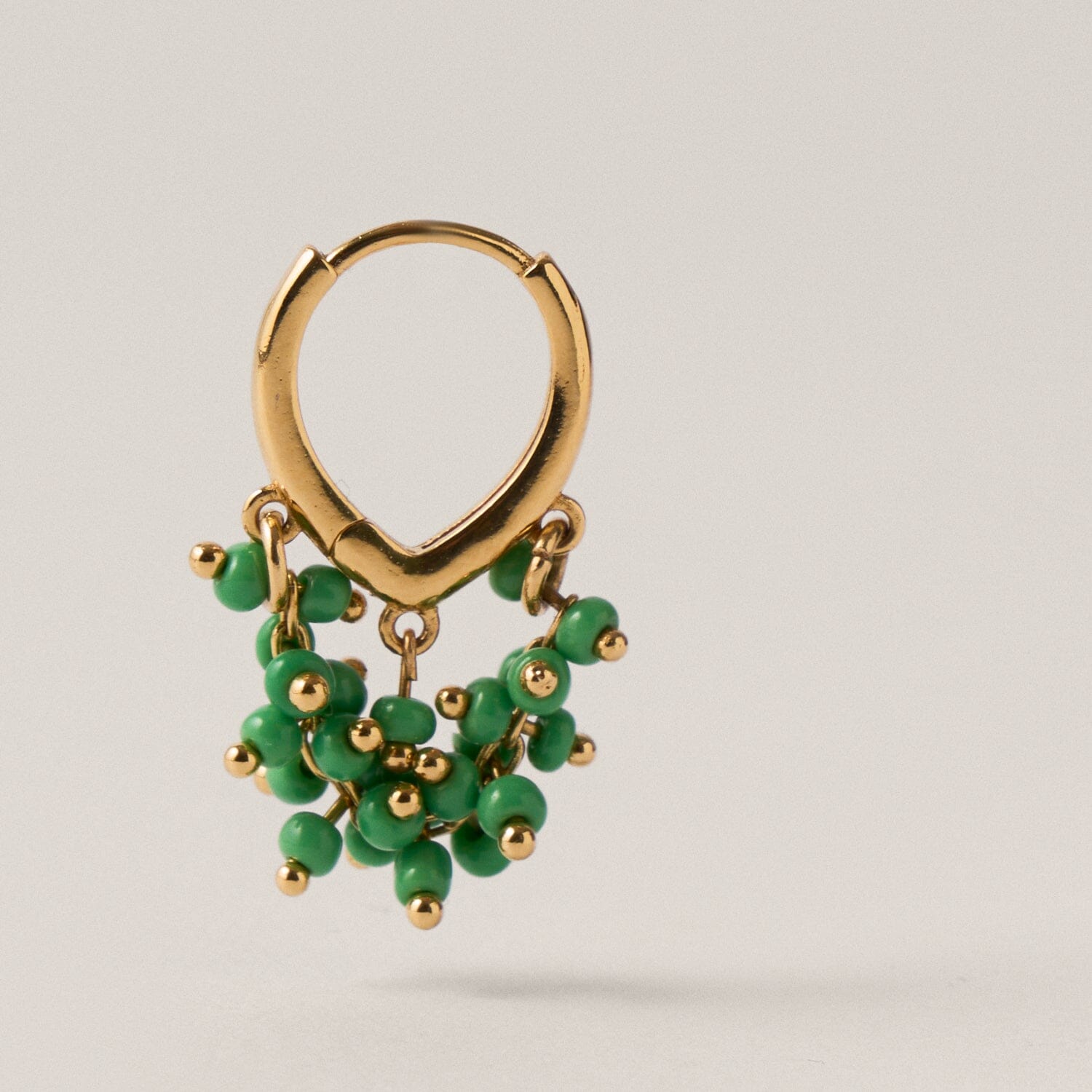 Colgante con detalle de racimo de cuentas de colores, muy ligero, colgando de la pieza, realizado en latón y bañado en 3 micras de oro de 18kt.