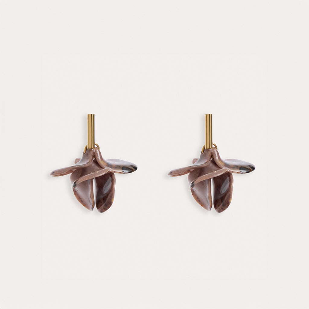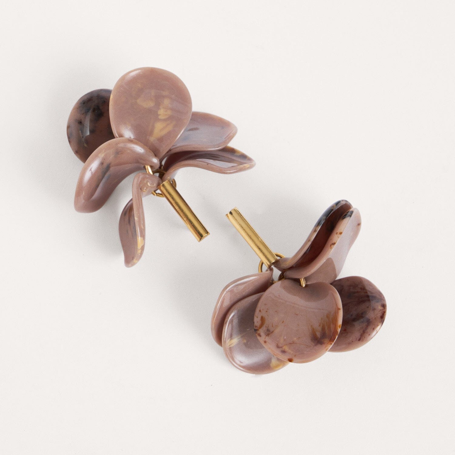 Pendientes cortos con motivos de pétalos de colores realizados en metacrilato, muy ligeros, colgados de un cierre en forma de barra fabricado en latón y bañado en oro de 3 micras de 18kt.