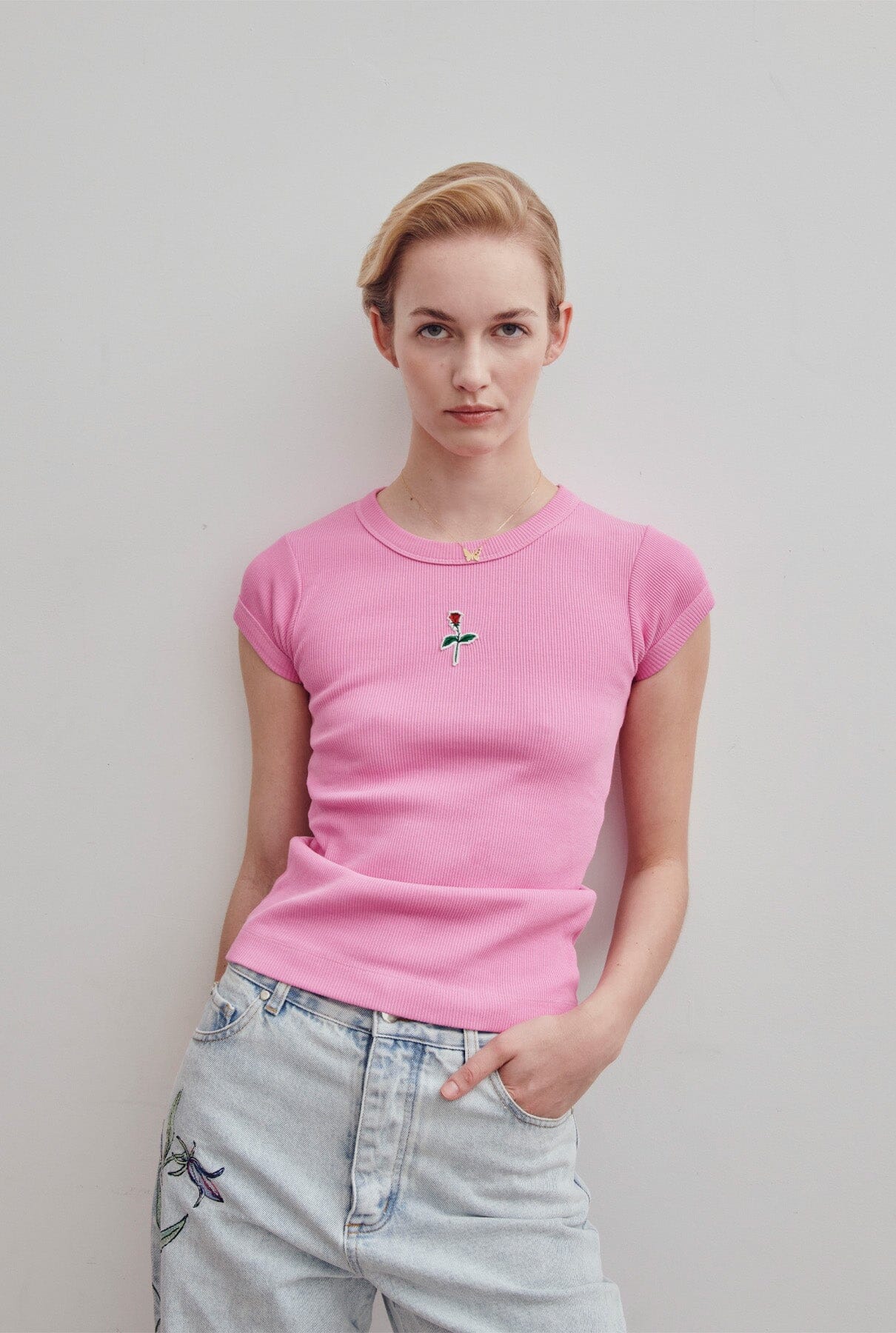 Camiseta corta de canalé Yconic en color rosa. Parche con el logo de Ynesuelves Rose bordado en la parte delantera. Ajustado.
