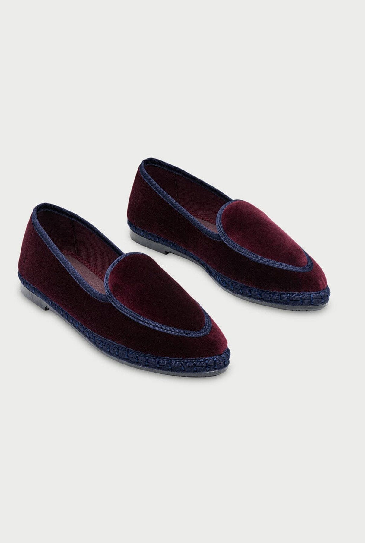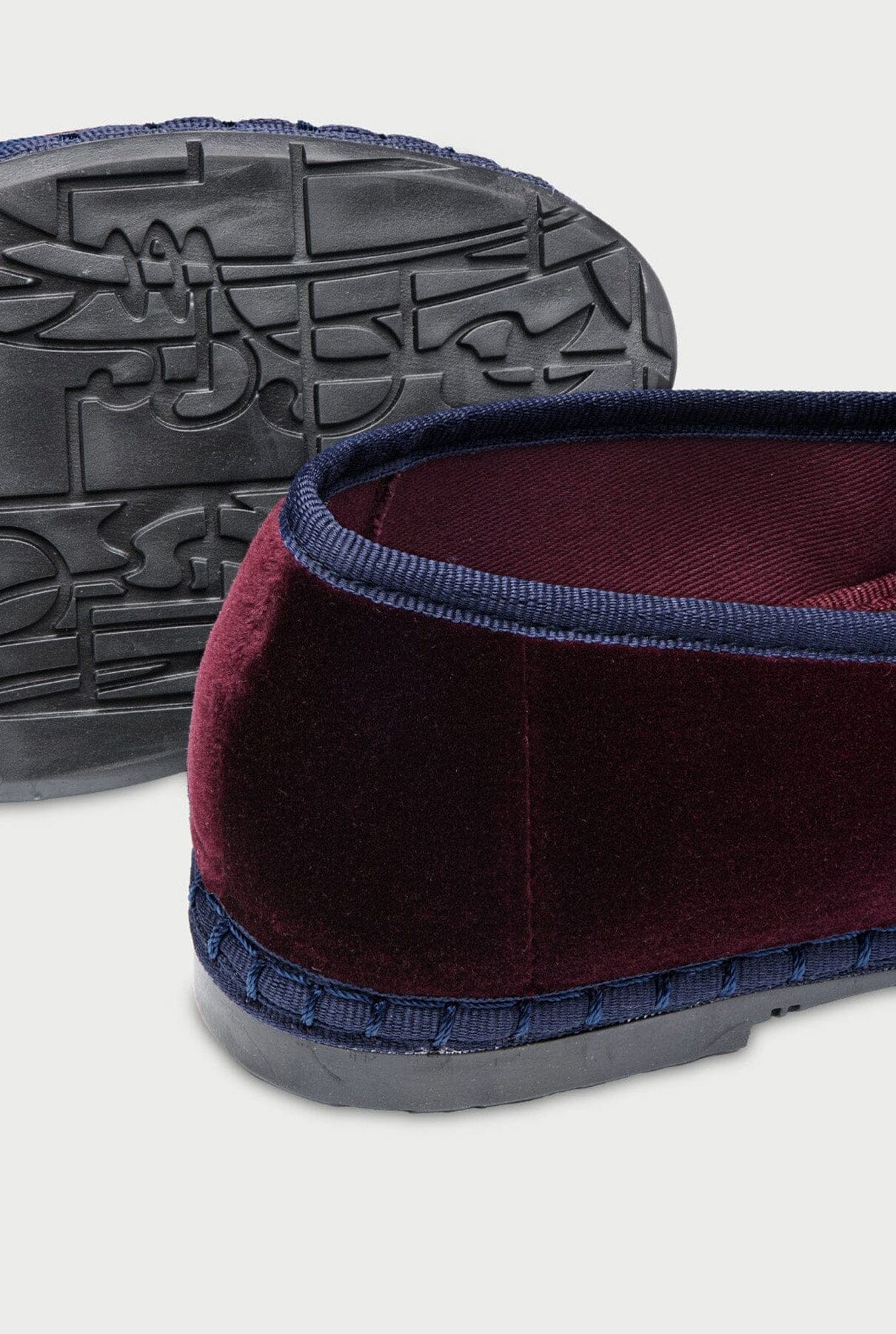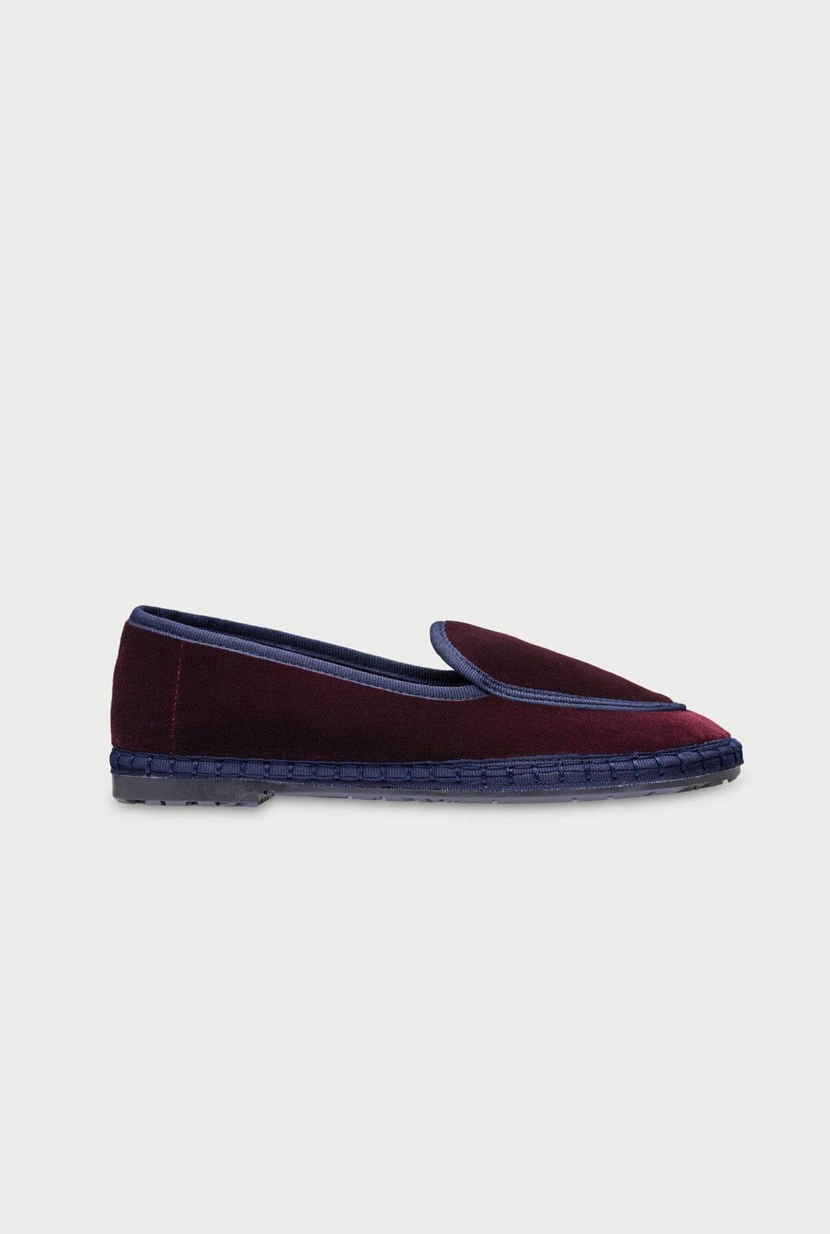 Belga de terciopelo en color berenjena con empeine berenjena y ribete azul marino.