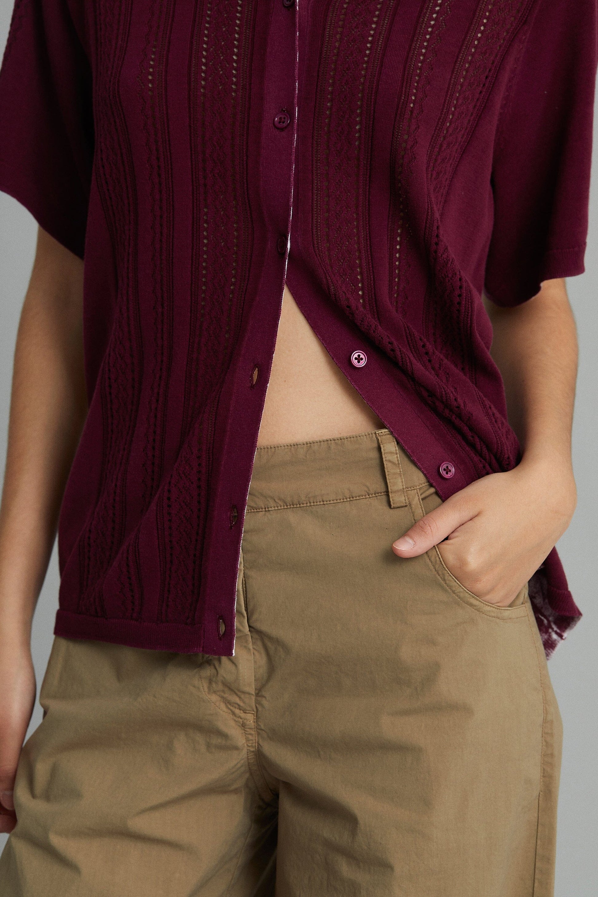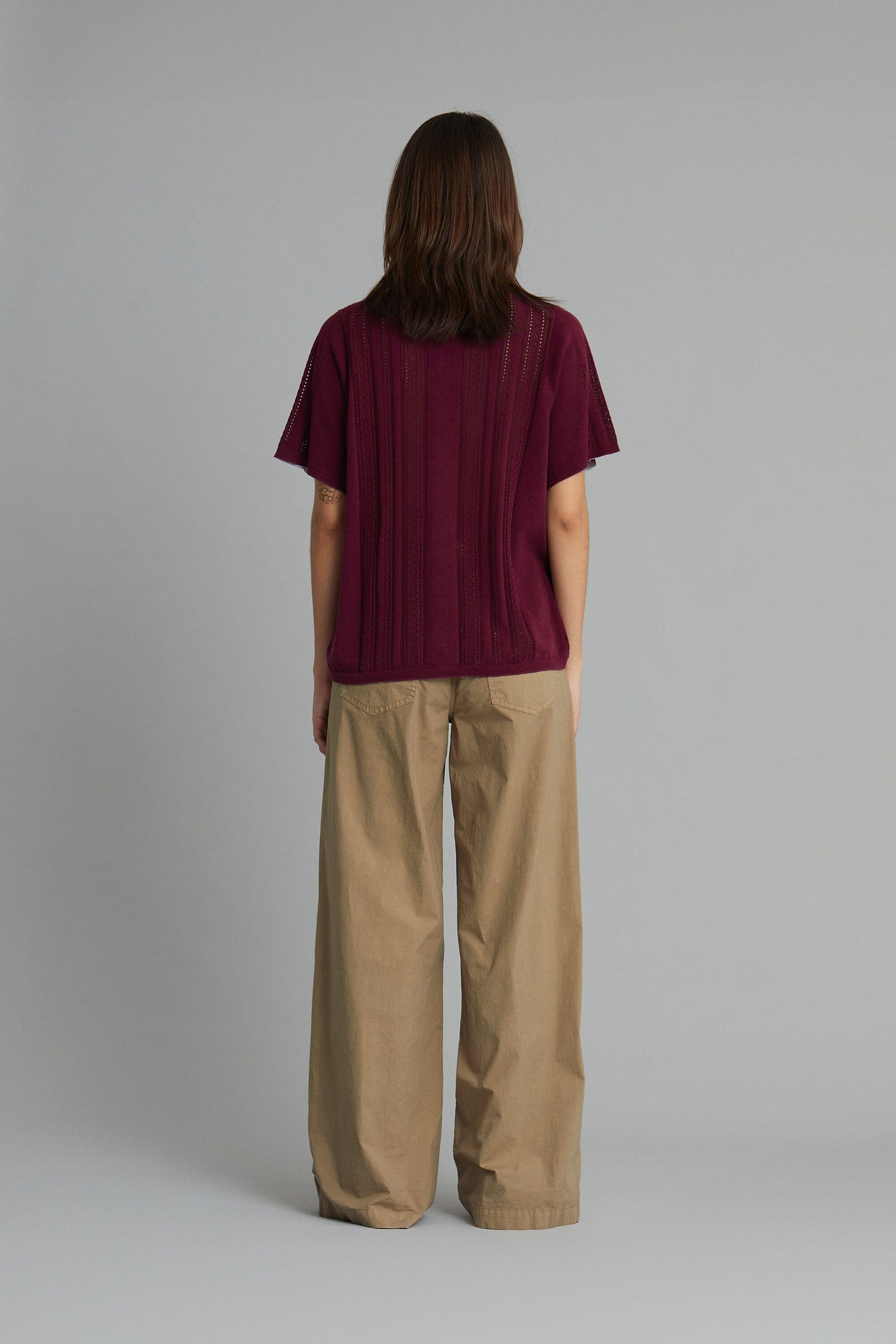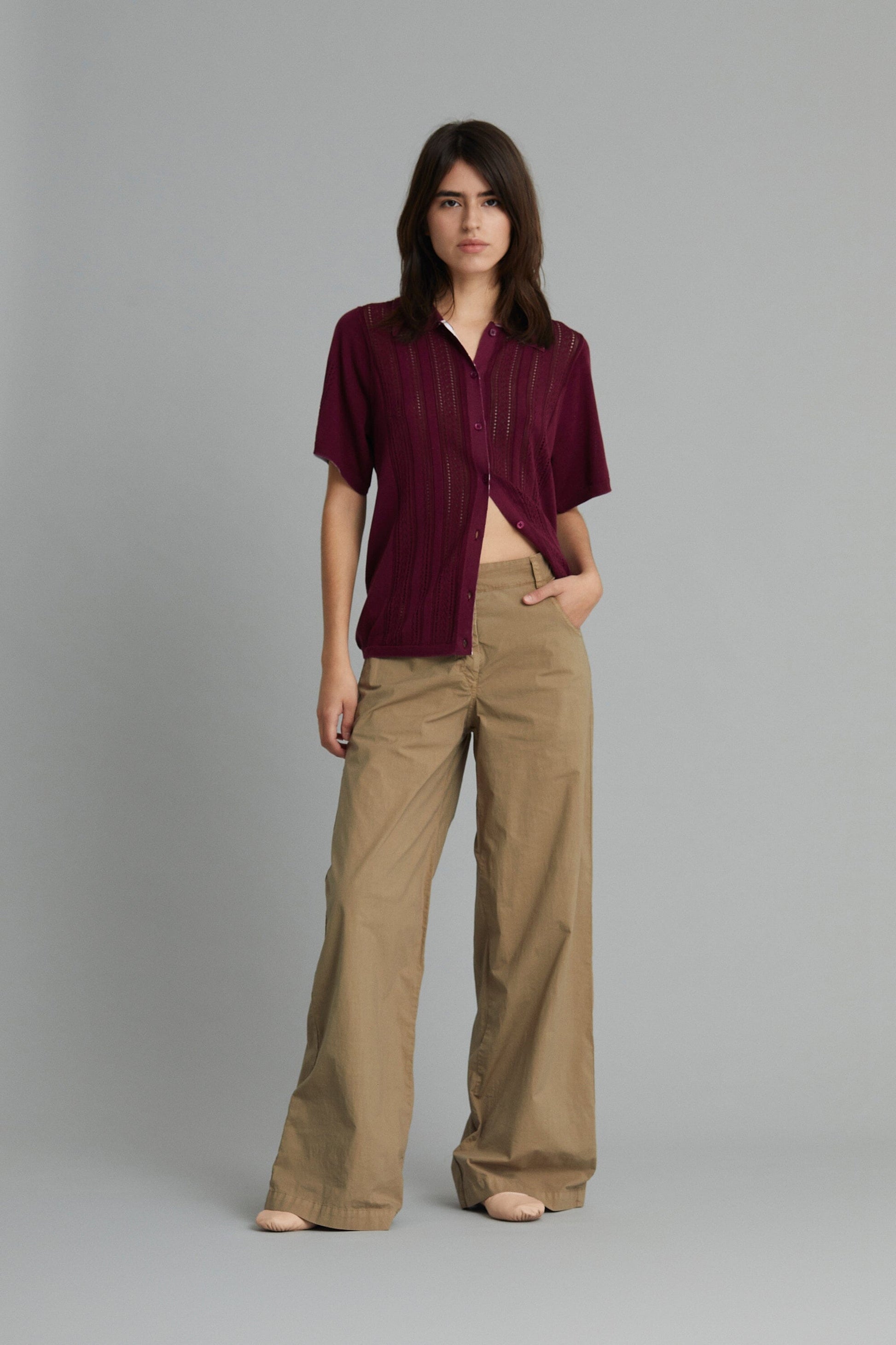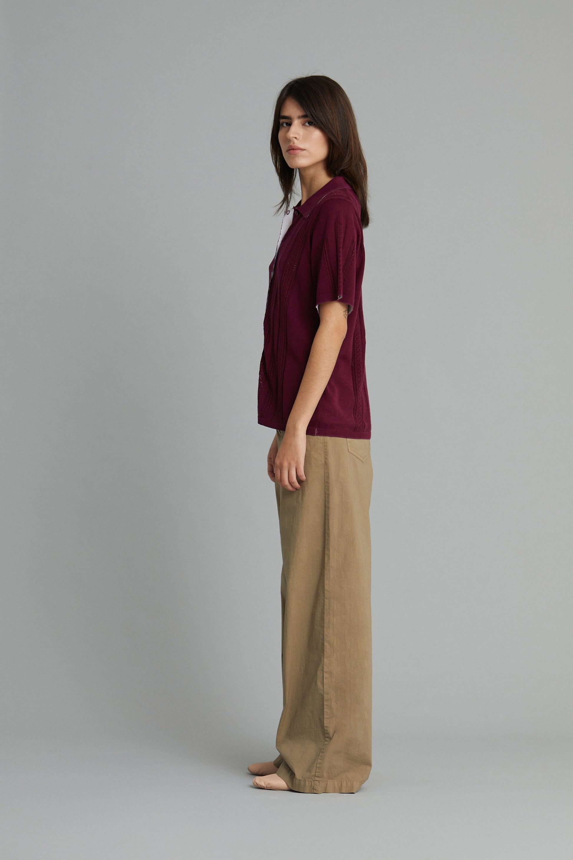 Pantalón de cinco bolsillos. Pernera ancha y recta. Cierre frontal con cremallera y botón. Tiro bajo.