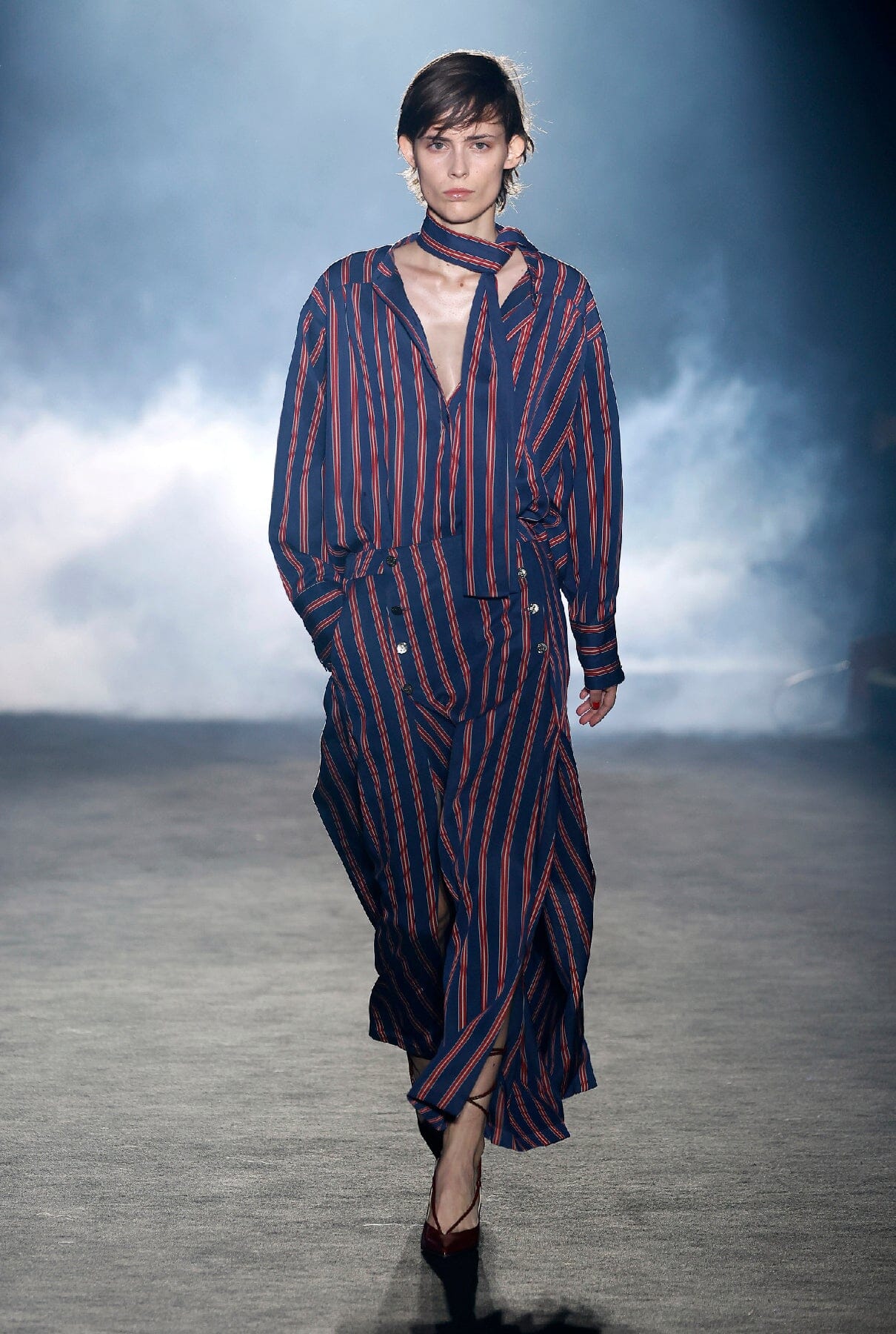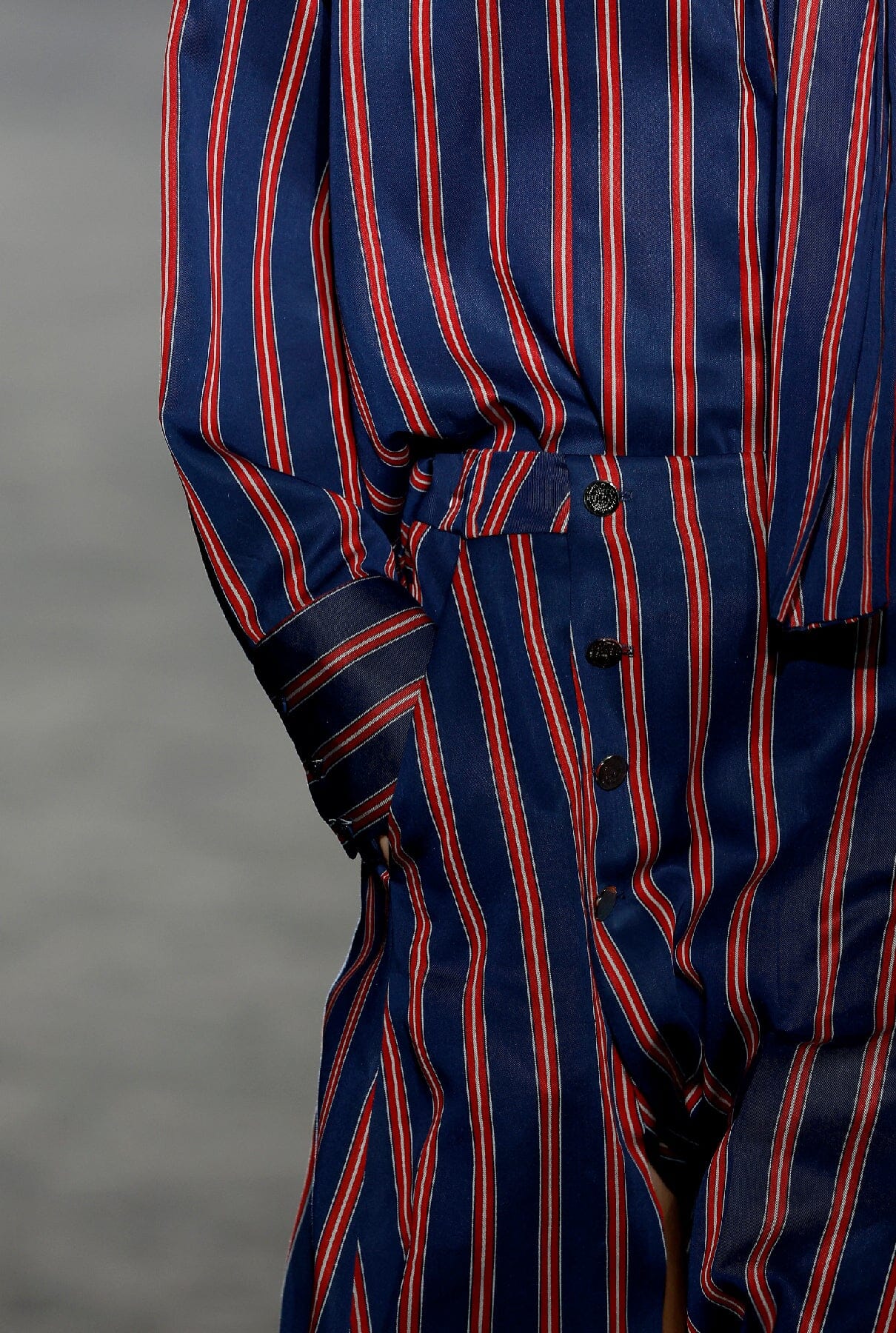 Esta falda, adornada con botones dorados, está confeccionada en tencel a rayas en azul marino y rojo. Diseñada con aberturas laterales y pliegues, que permiten un flujo natural que resaltará tu lado femenino y elegante. Una prenda imprescindible para tu guardarropa.