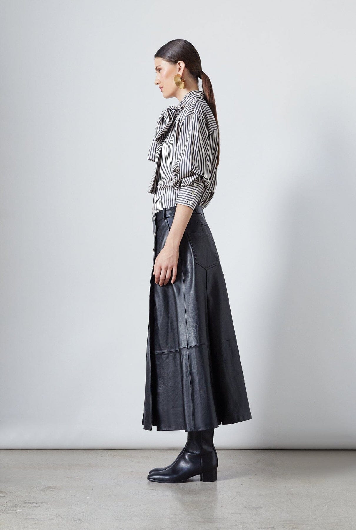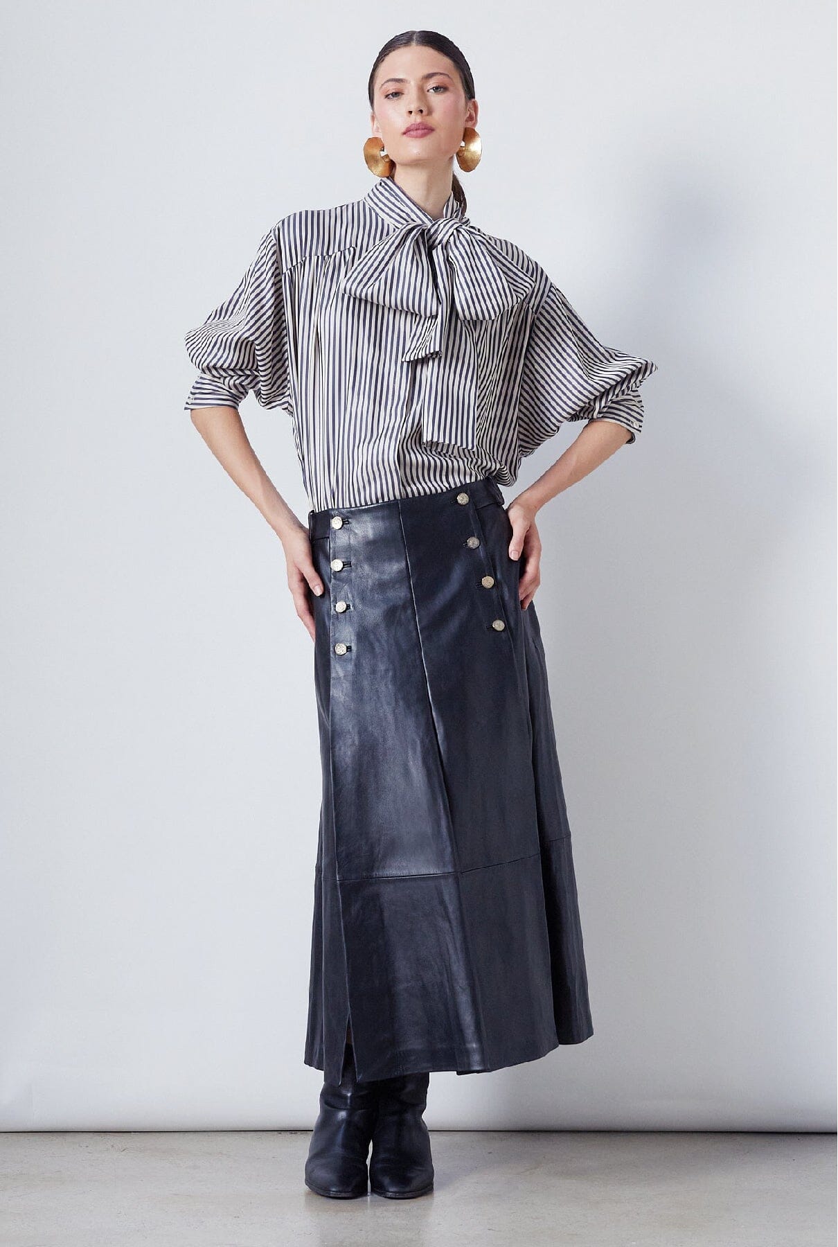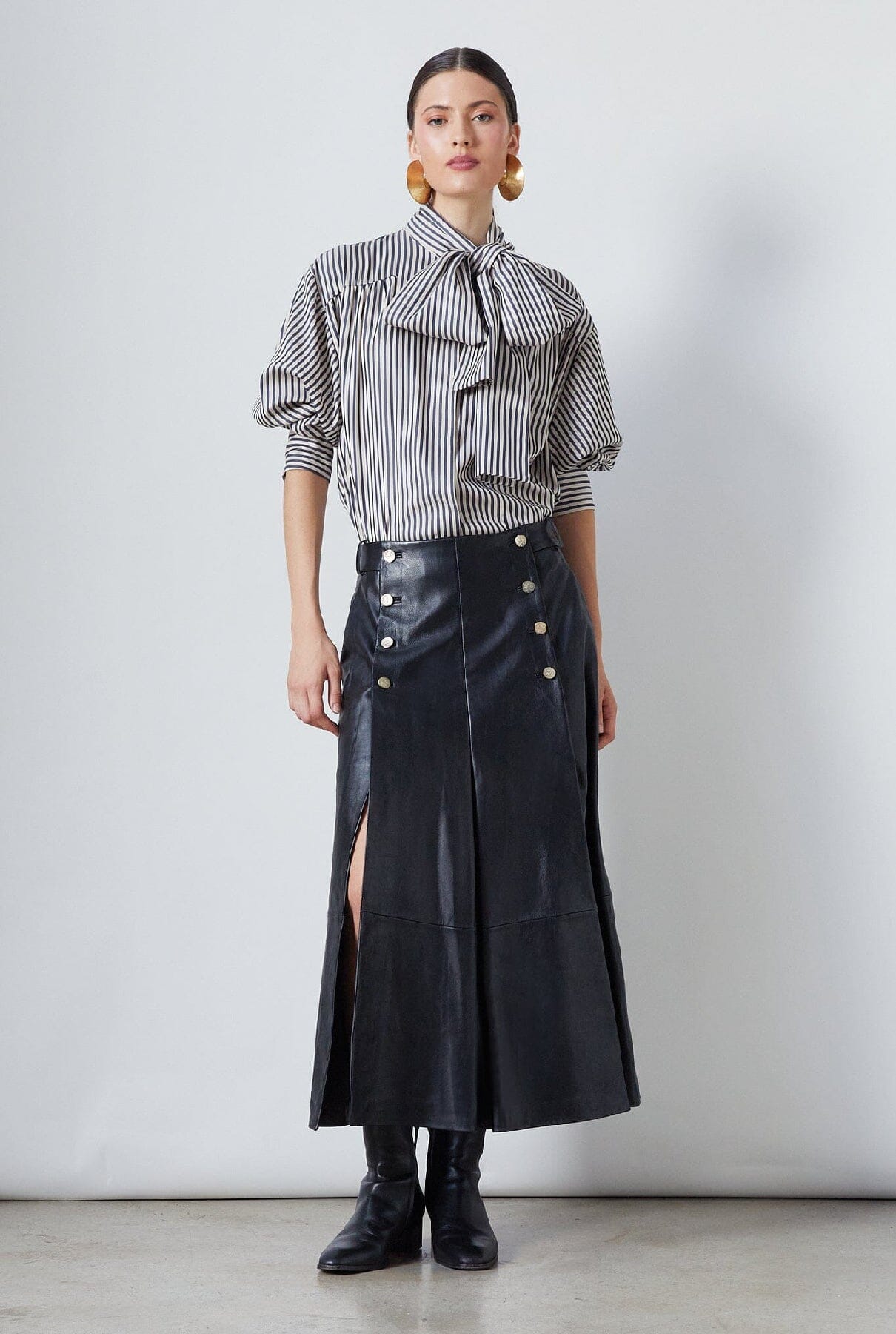 Esta falda, adornada con botones dorados, está confeccionada en cuero negro de primera calidad. Diseñada con aberturas laterales y pliegues, lo que permite un flujo natural que resaltará tu lado femenino y elegante. Una prenda imprescindible para tu guardarropa.