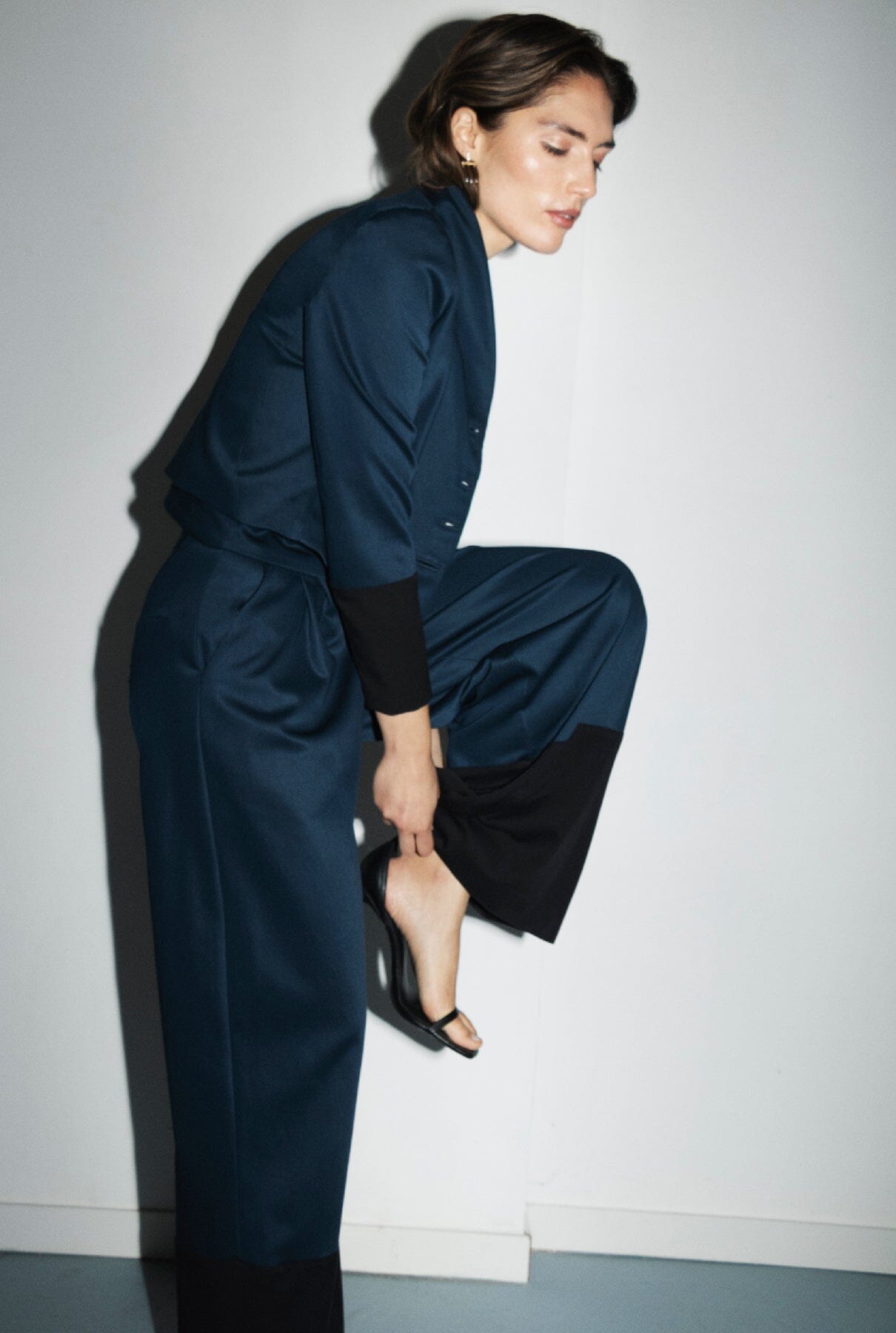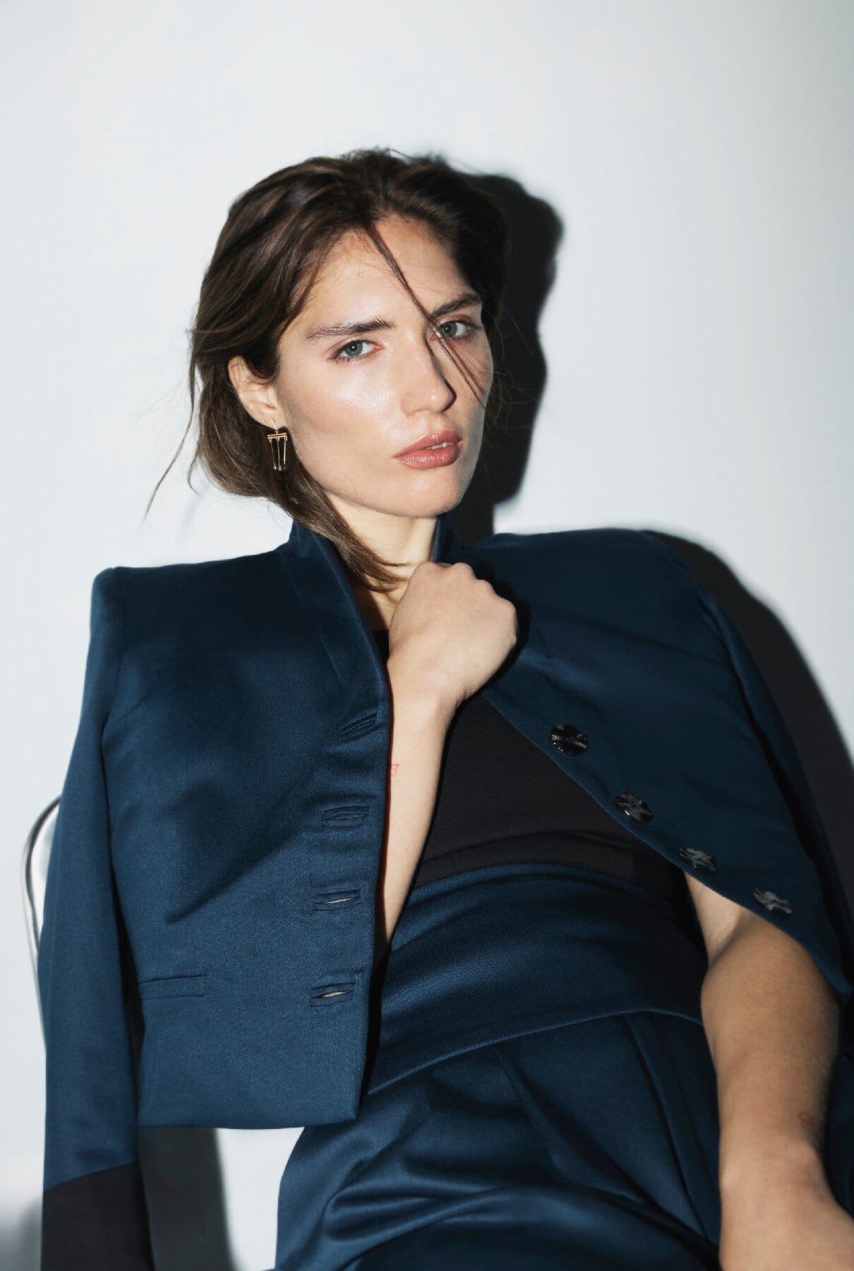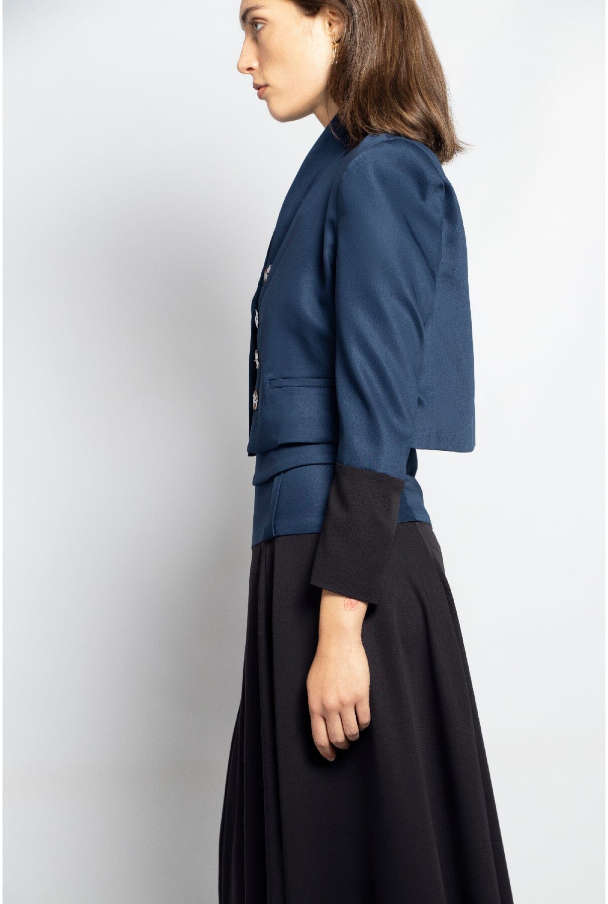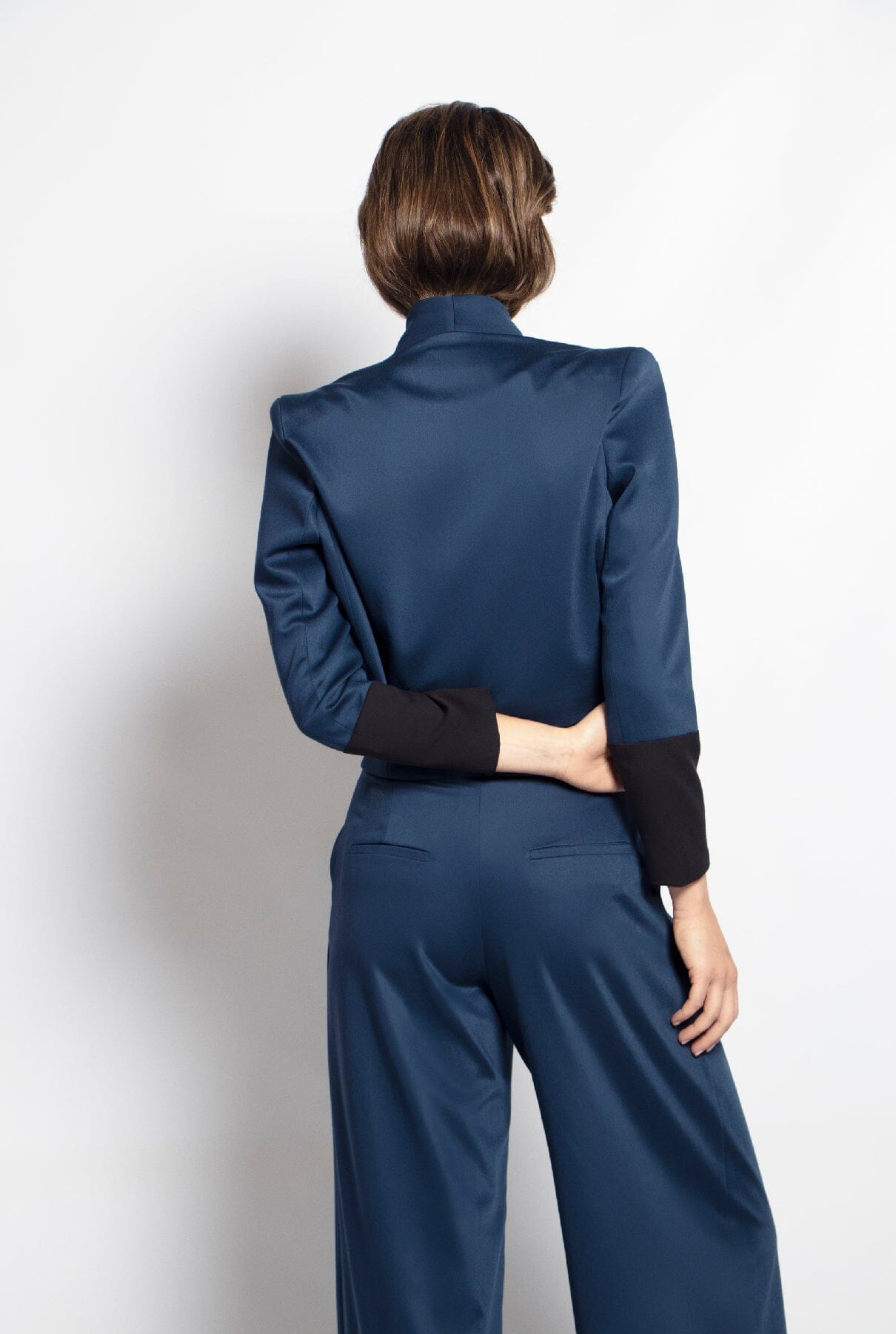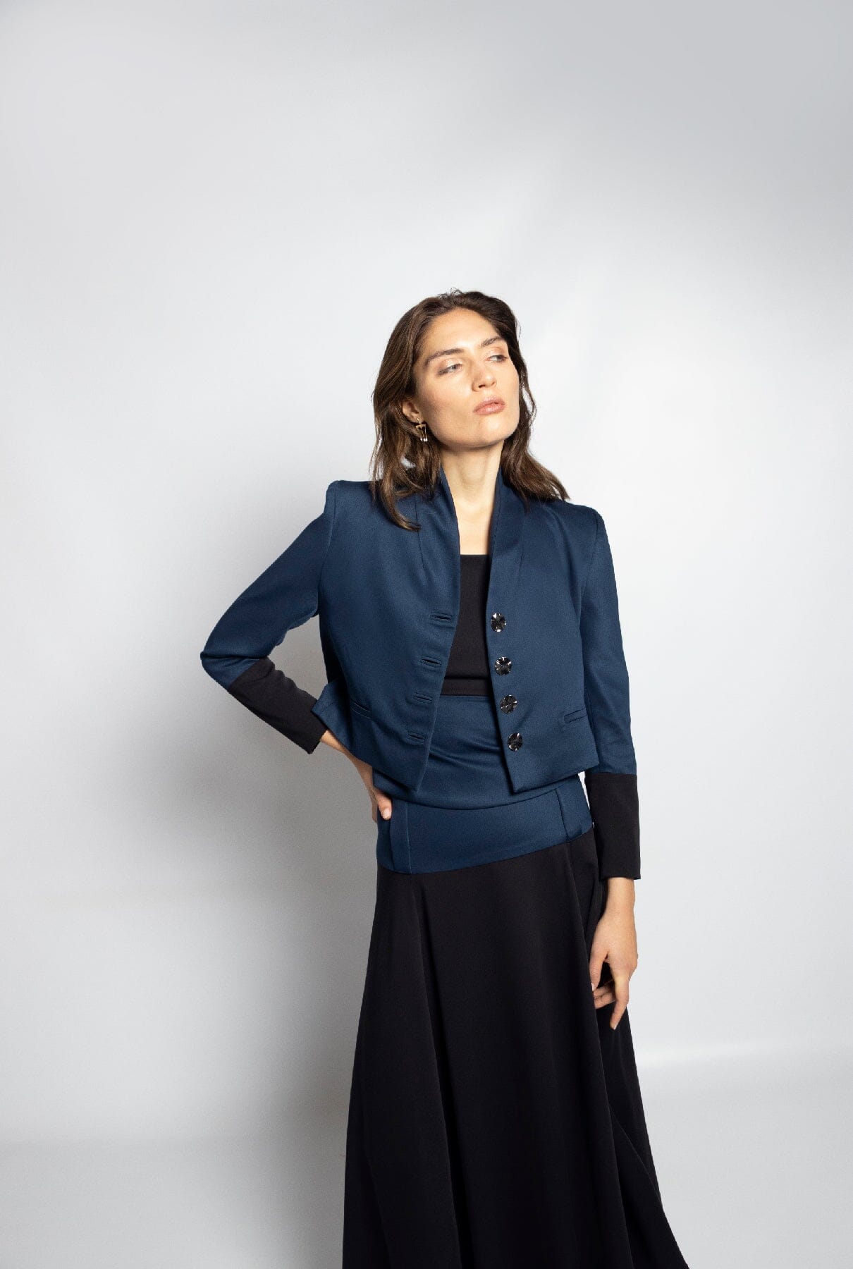Carmen es una chaqueta que sigue nuestro patrón icónico de cuello alto, corte crop un poco por debajo de la cintura y bolsillos con solapa. Sigue el juego bicolor con un corte a media manga en negro. Está confeccionada en un tejido de rayón-lyocel-snx ligeramente satinado.