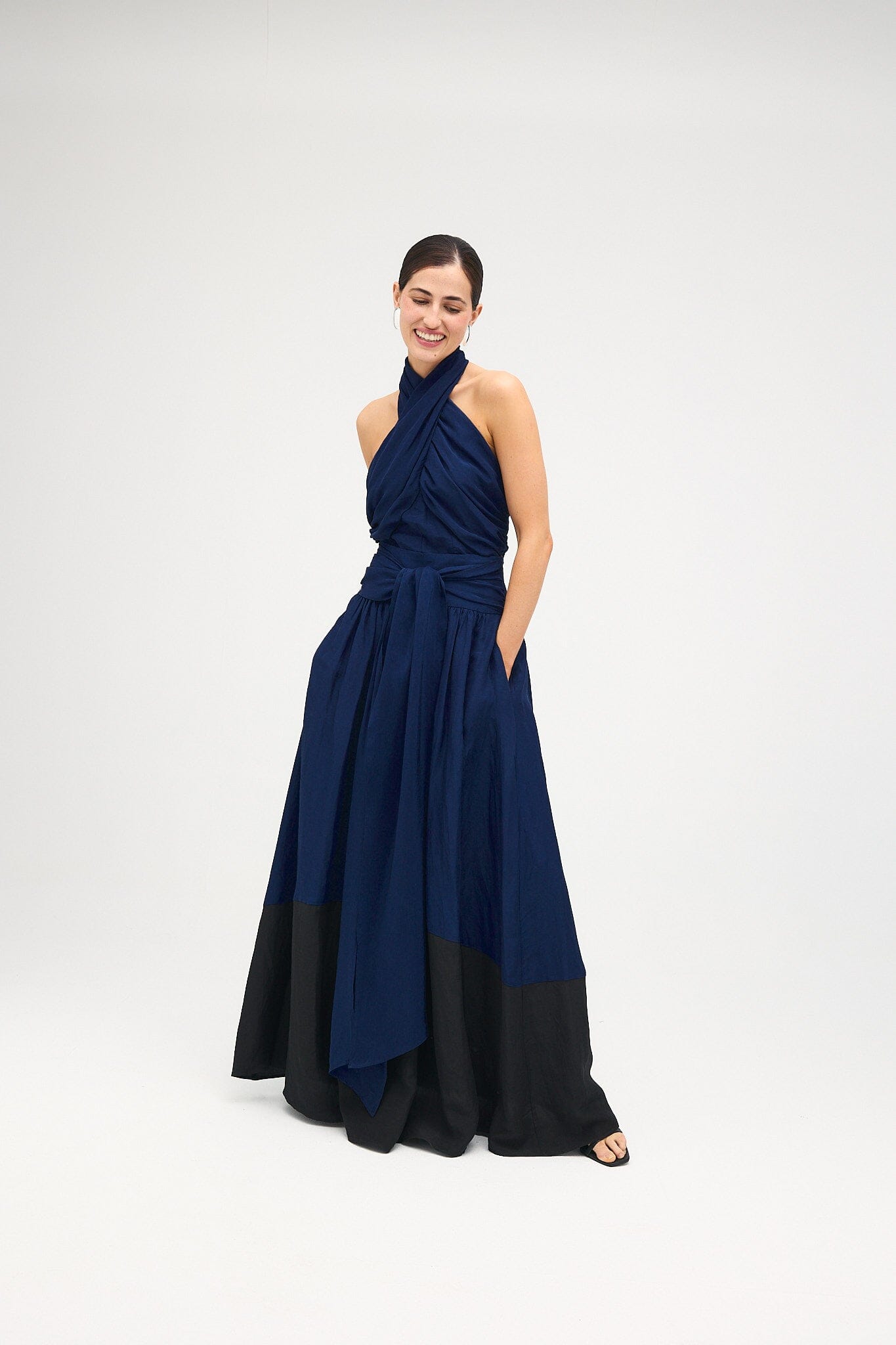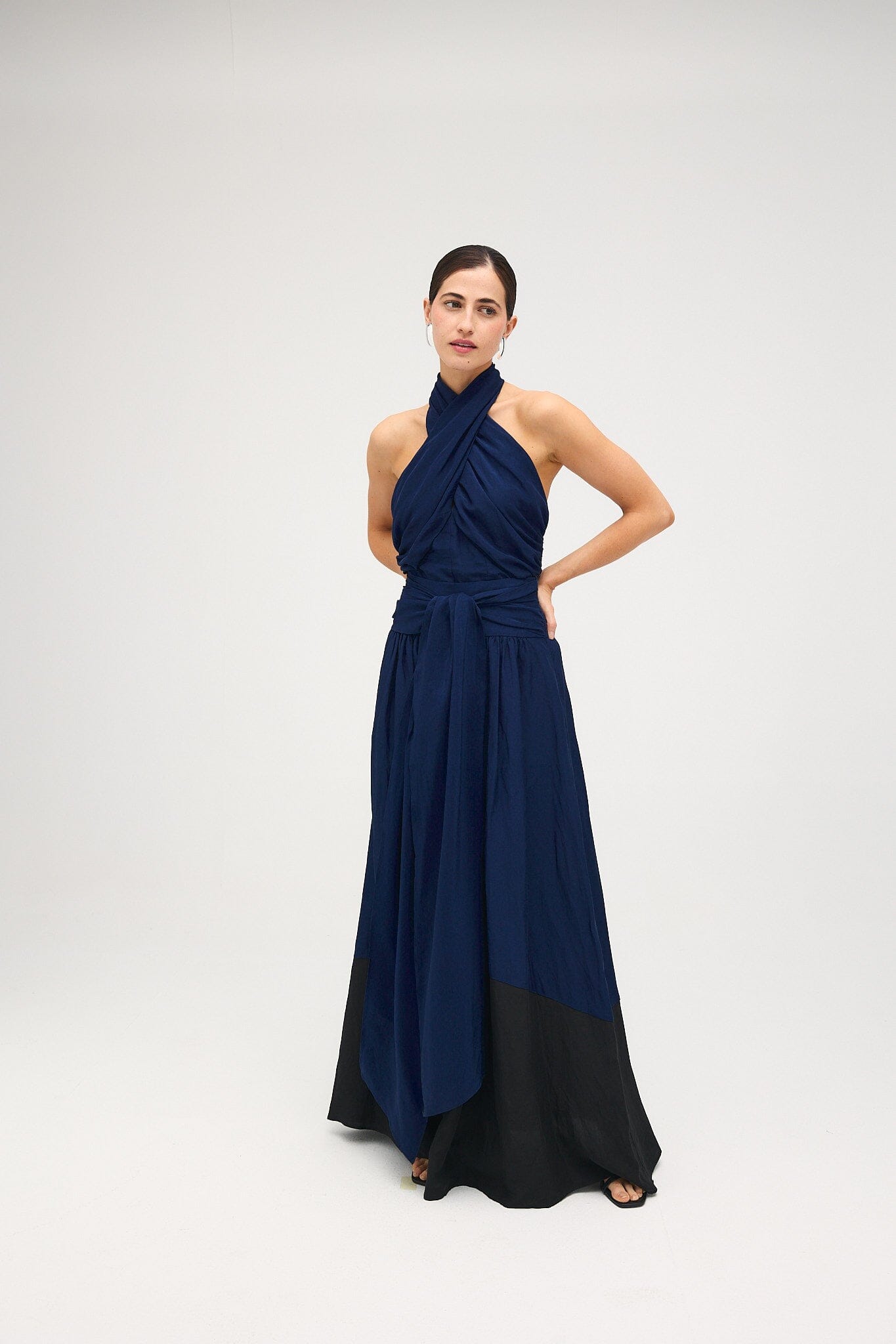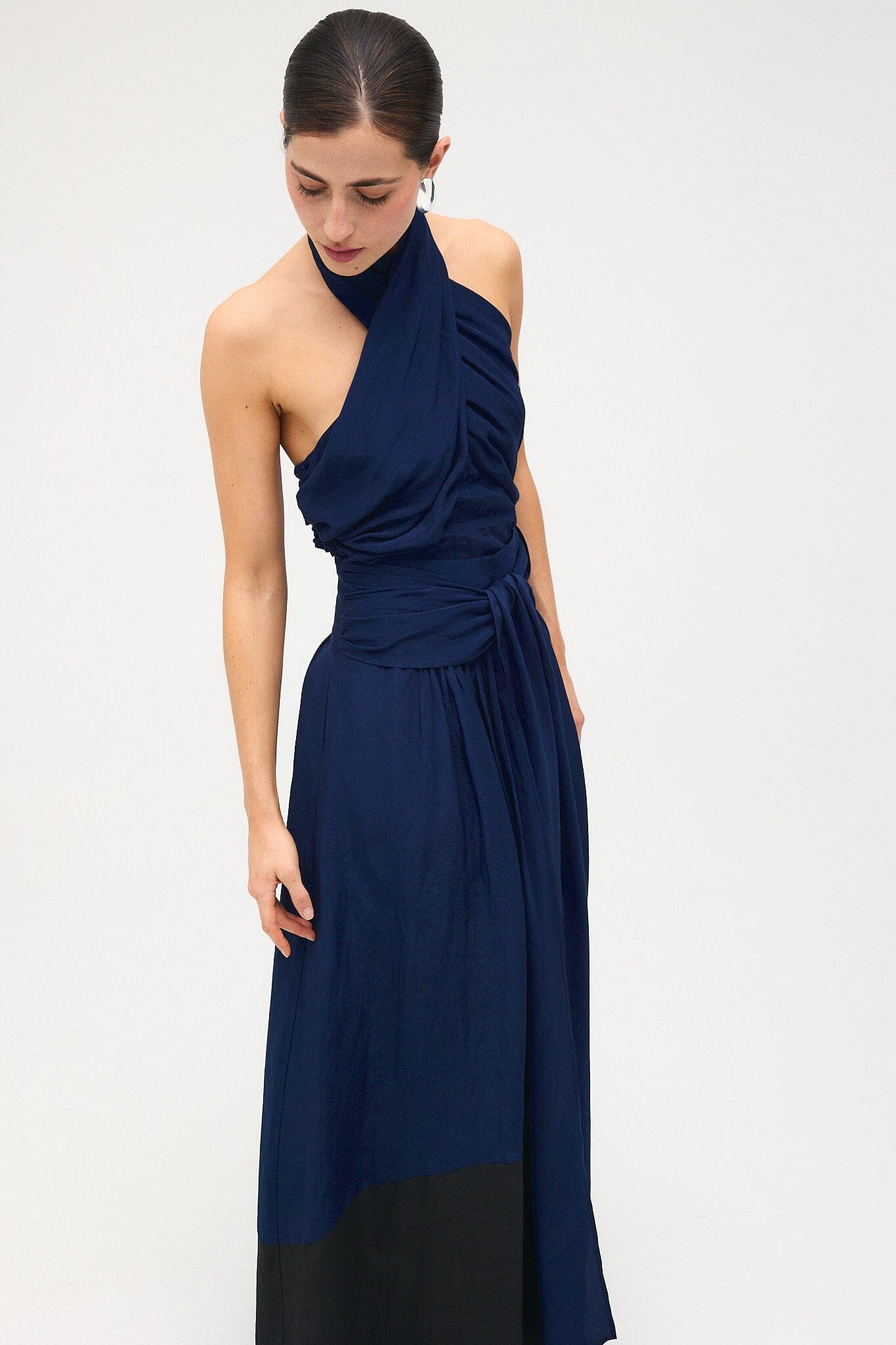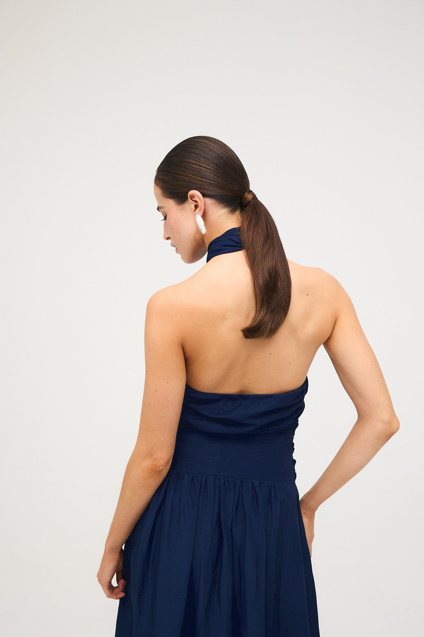 Top drapeado con escote halter. Cruzado por delante y abotonado por detrás.
