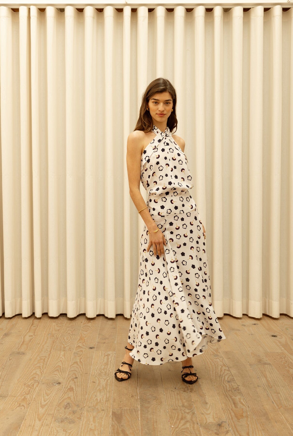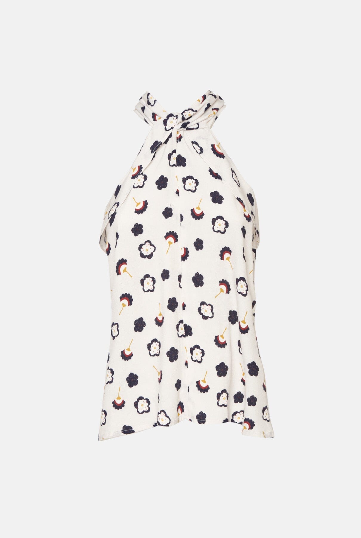 Top de escote halter con solapas en los laterales, se abrocha en el cuello con botón forrado y es ligeramente evasé.