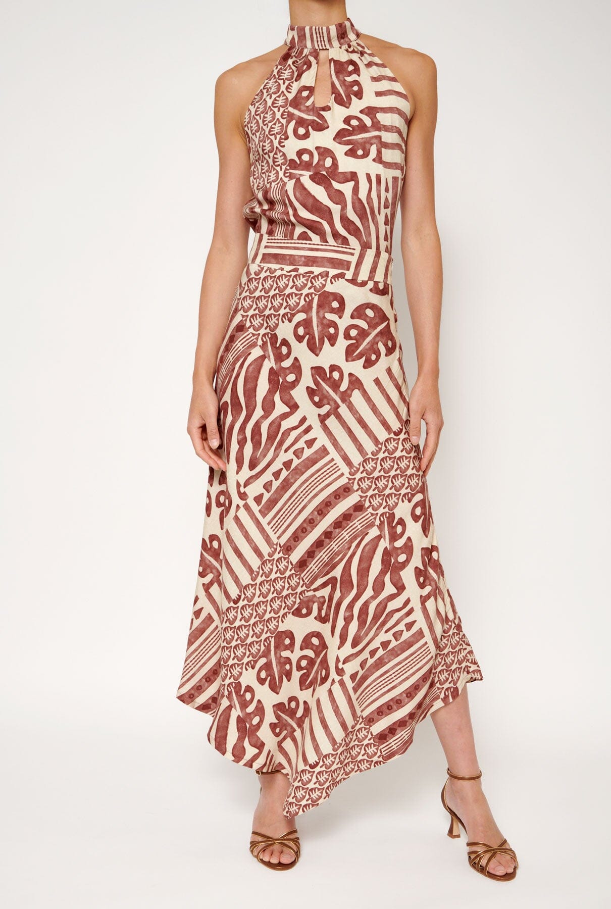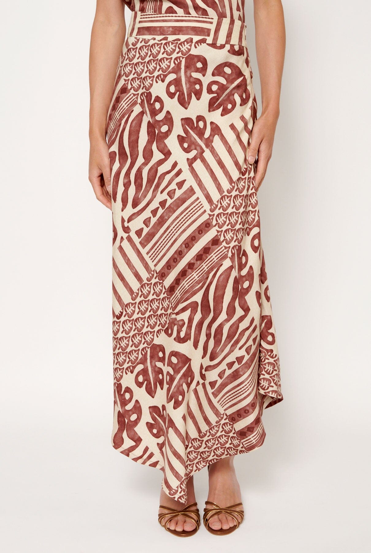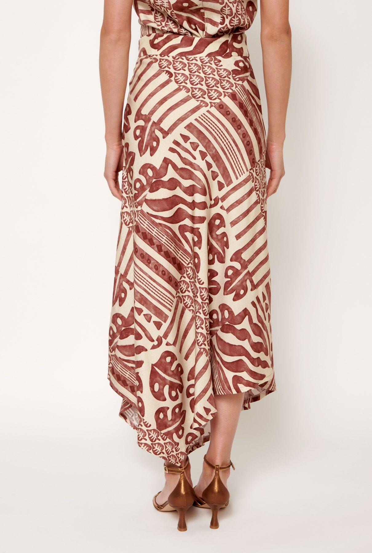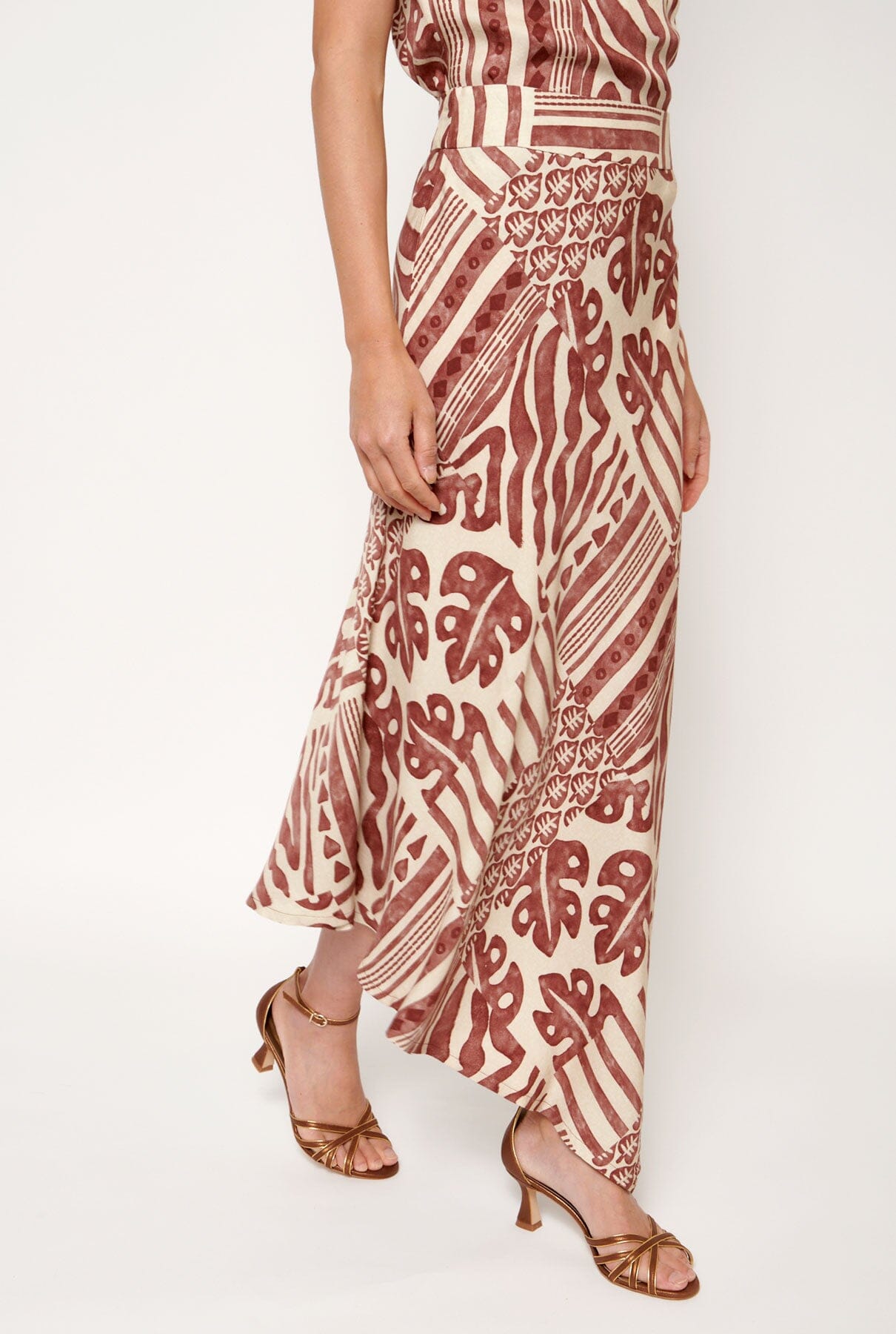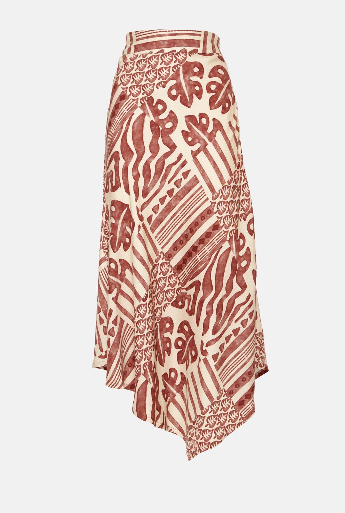 Falda midi en tejido estampado rojo y beige, parte inferior asimétrica. Cierre con cremallera.