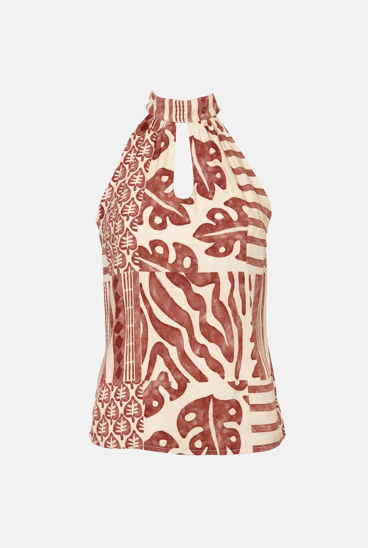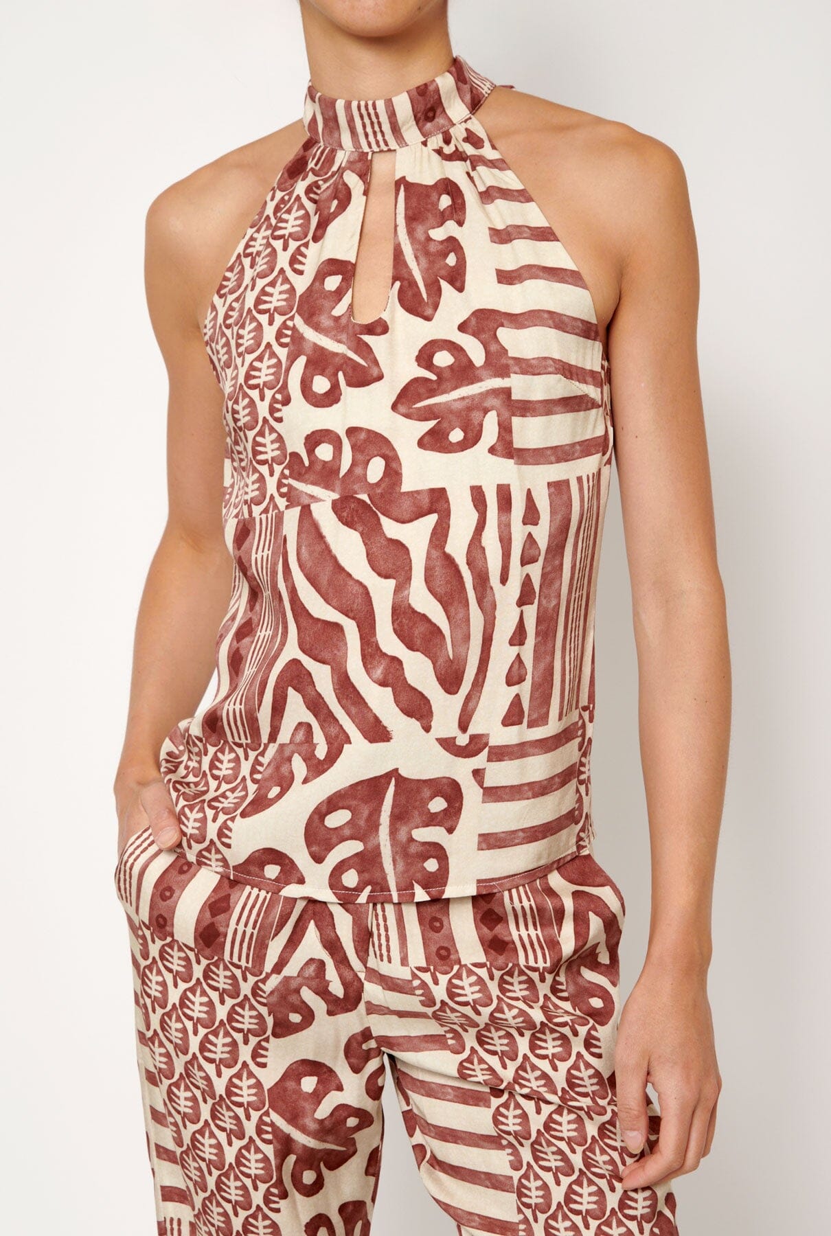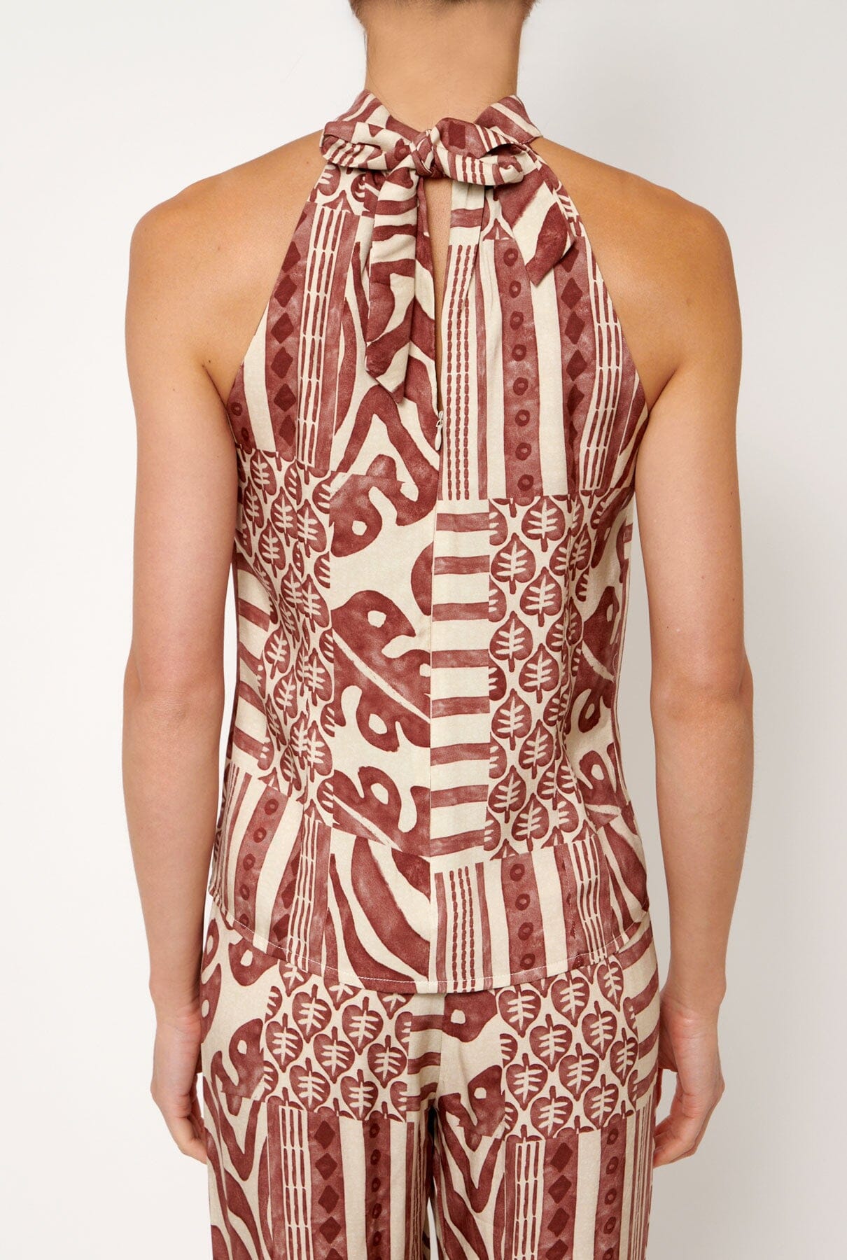 Top halter en tejido estampado en rojo y beige. Escote halter con abertura delantera. Cierre en espalda con cremallera y lazo que nace del cuello.
