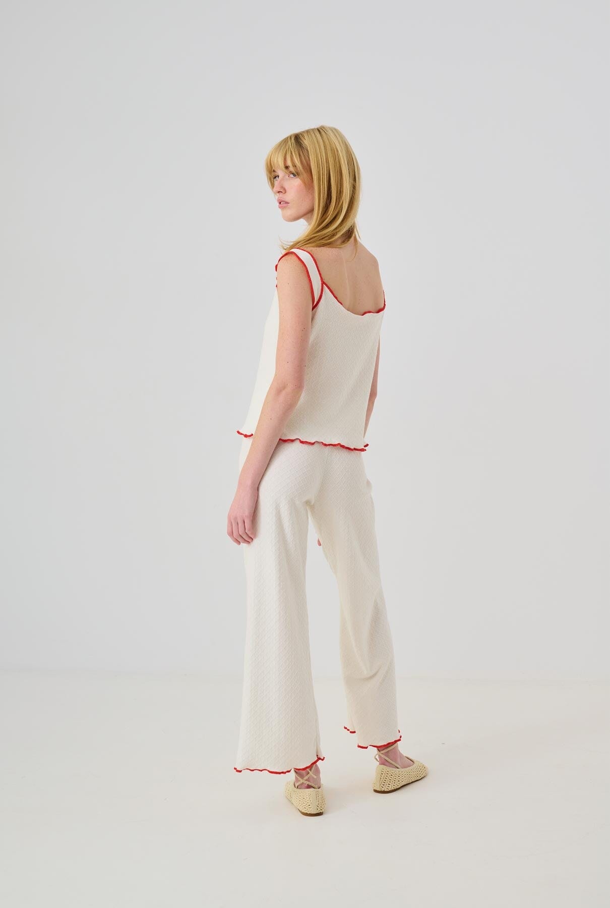 - Pantalón blanco de pierna recta con patrón de tejido