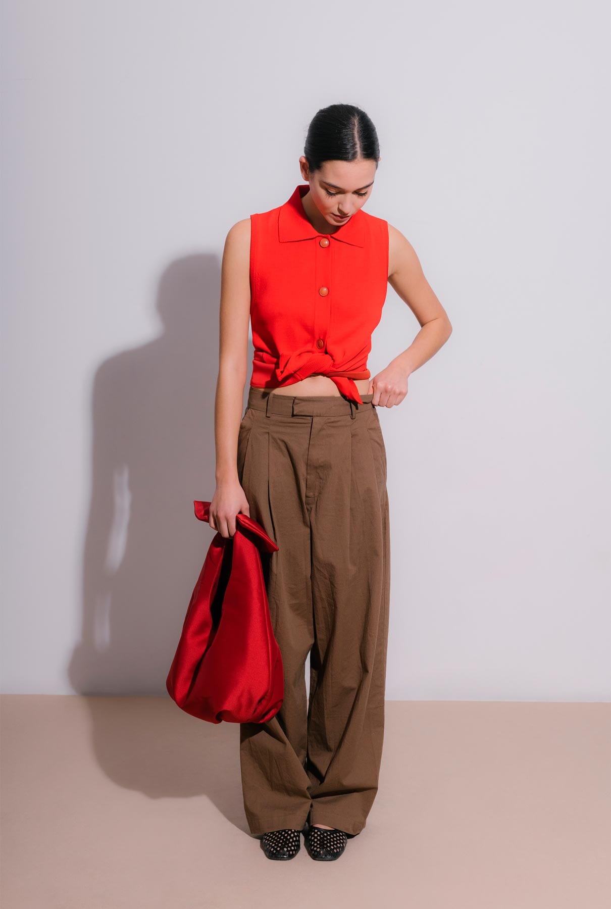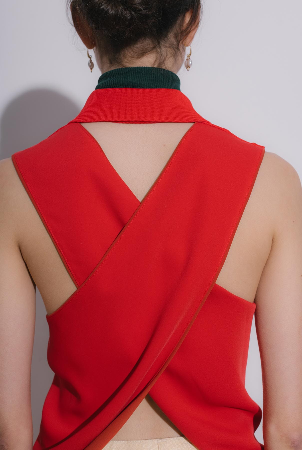 Tiene un corte de polo de punto sin mangas en la parte delantera y un tejido de crepé drapeado en la espalda, que le da un toque femenino único. El color del interior del tejido drapeado contrasta con el exterior.