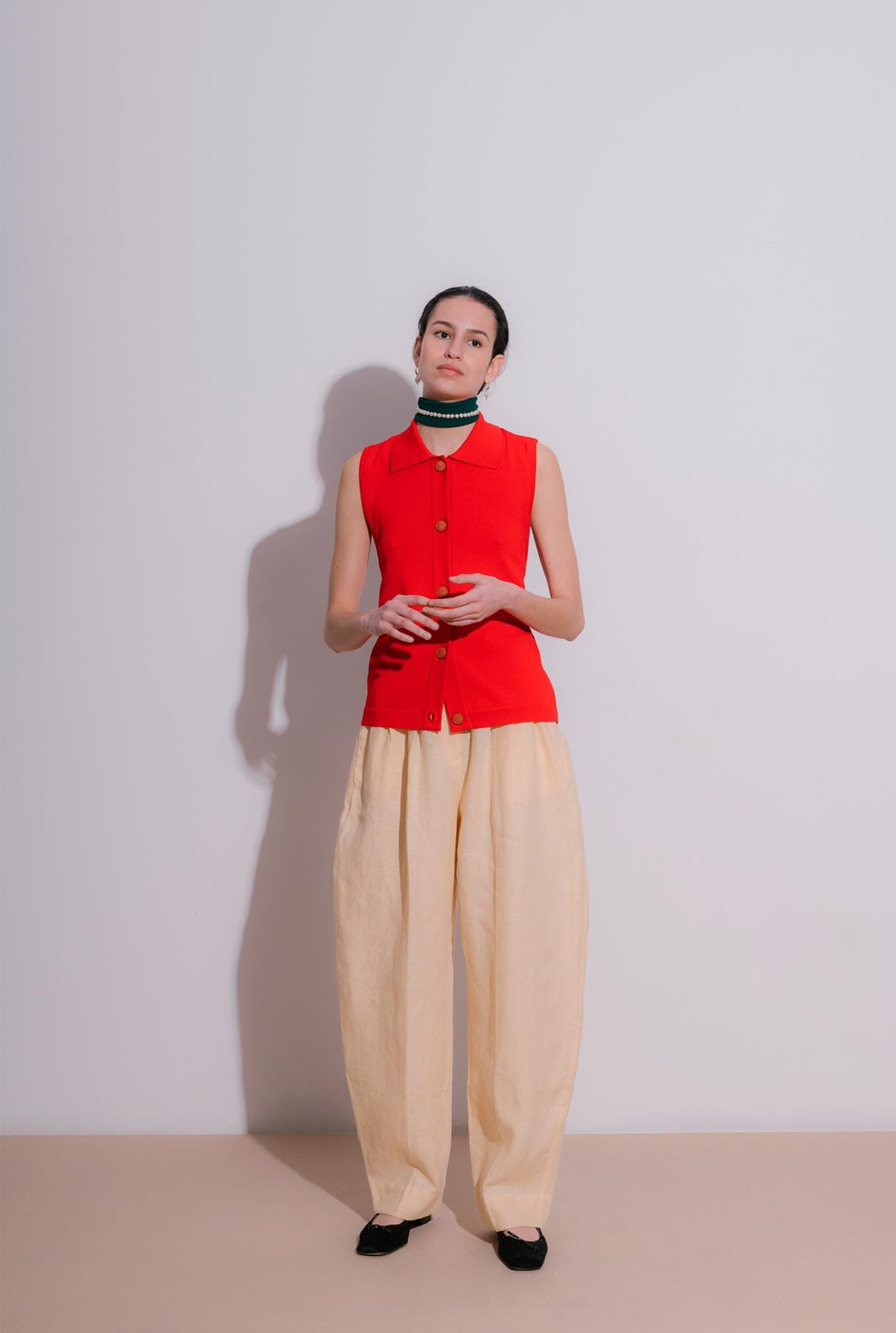 Confeccionada en una mezcla de viscosa y crepé, esta blusa sin mangas tiene un corte regular. Presenta una textura suave y botones tipo polo en la parte delantera. Para completar el conjunto, llévala con el pantalón Margarita a juego, pero también te recomendamos combinarla con pantalones de noche o incluso vaqueros.
