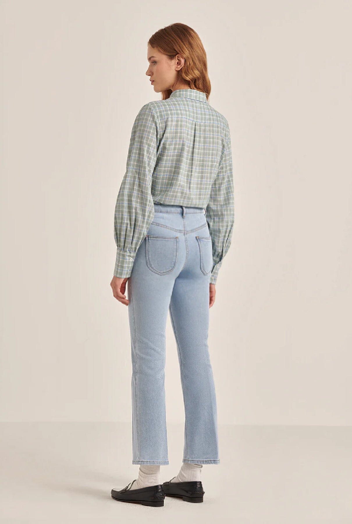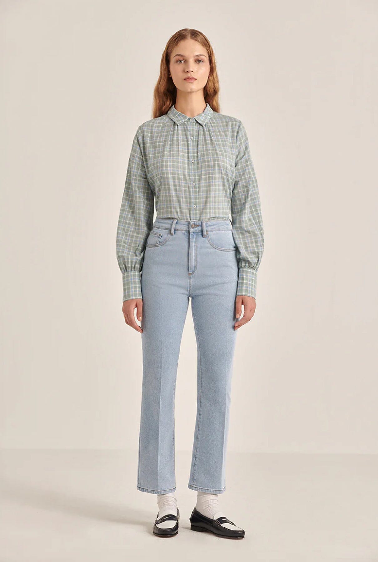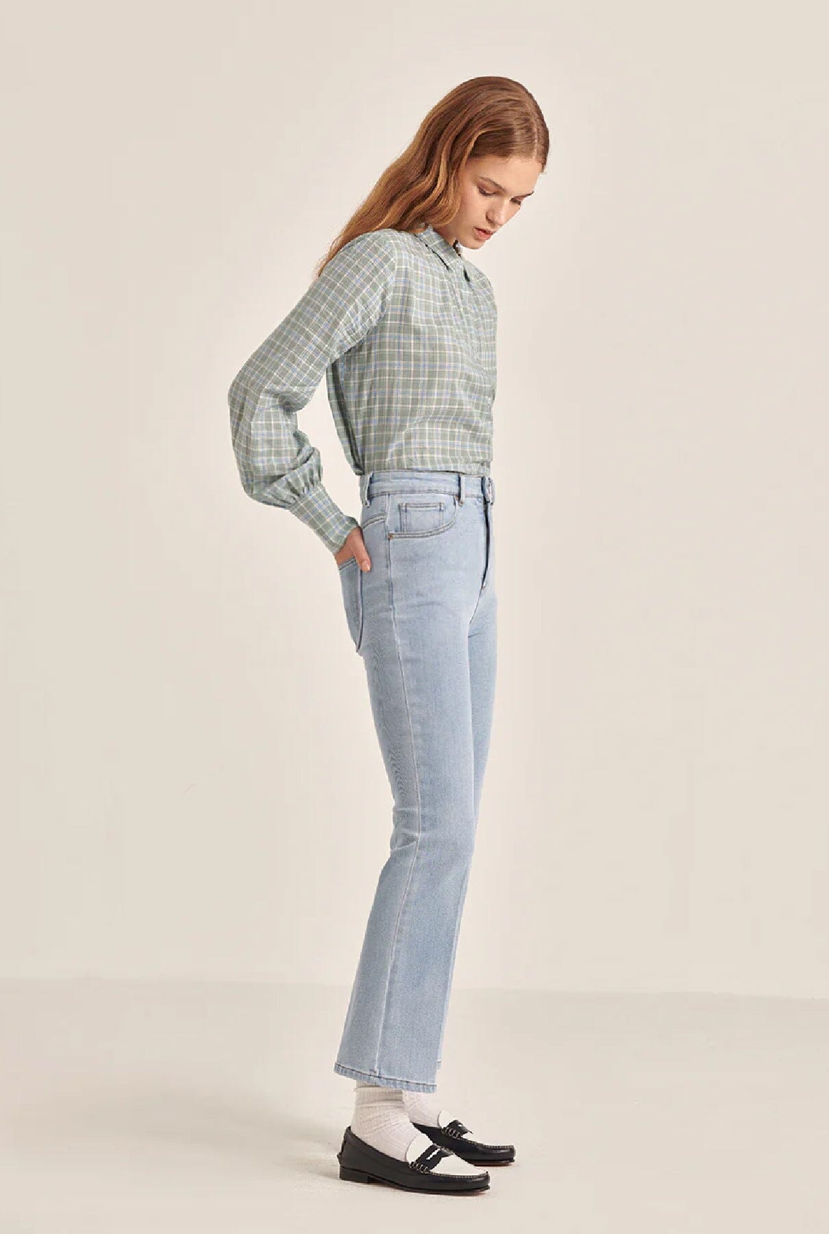 Pantalón vaquero azul claro, cintura alta y pierna recta.