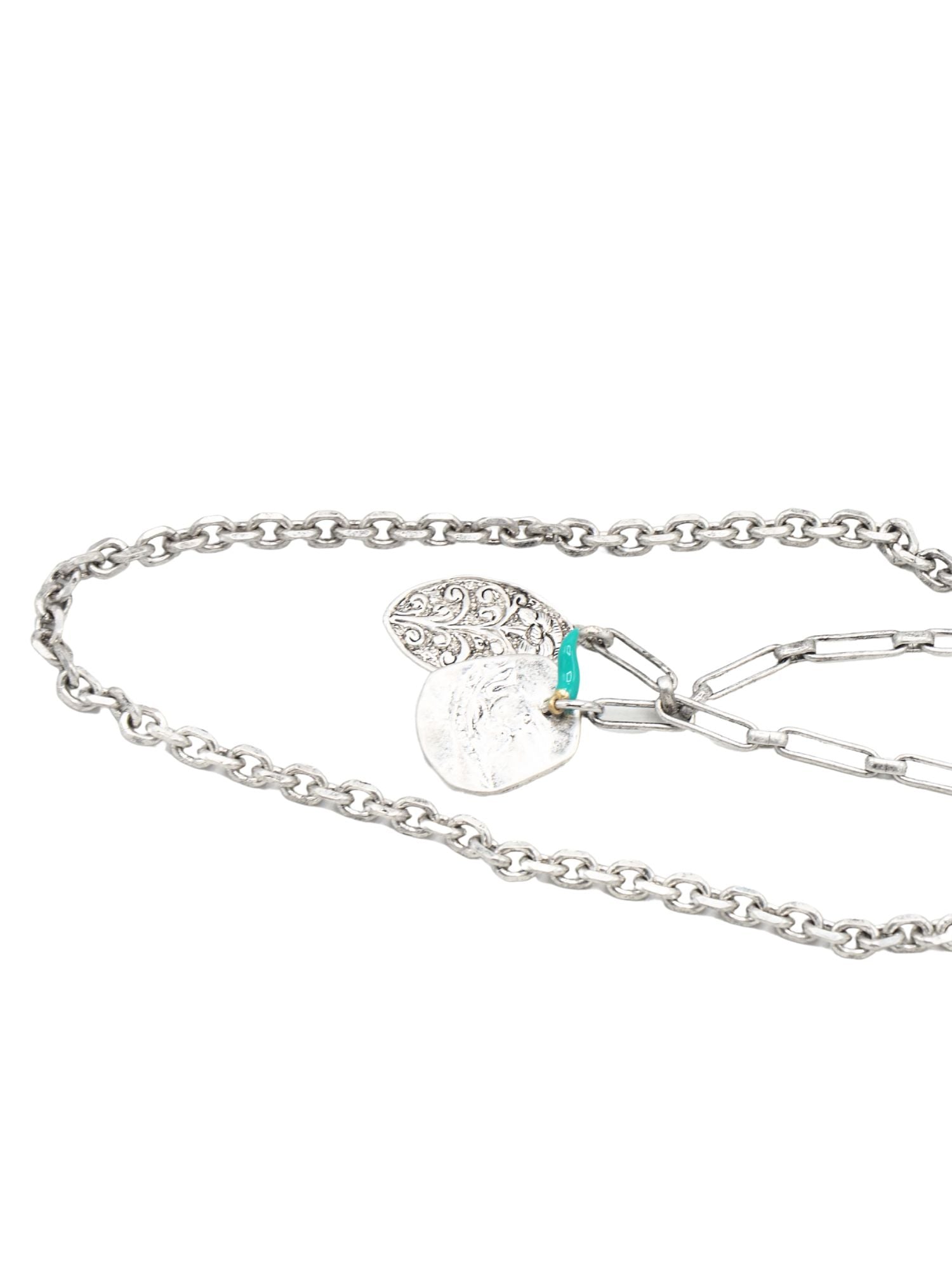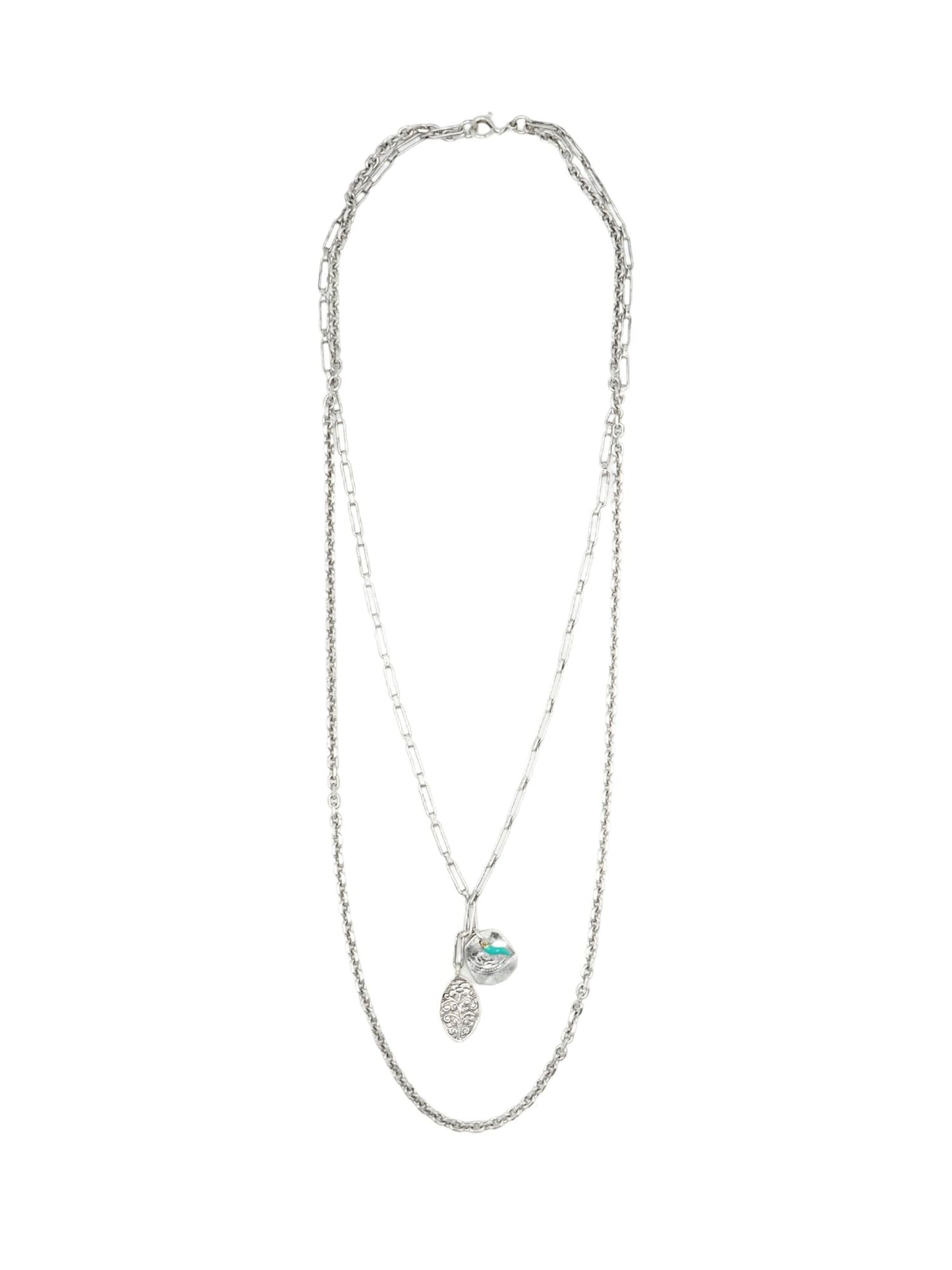 Collar largo, realizado con dos cadenas finas a diferente altura, con colgantes de placa y una guindilla de color.