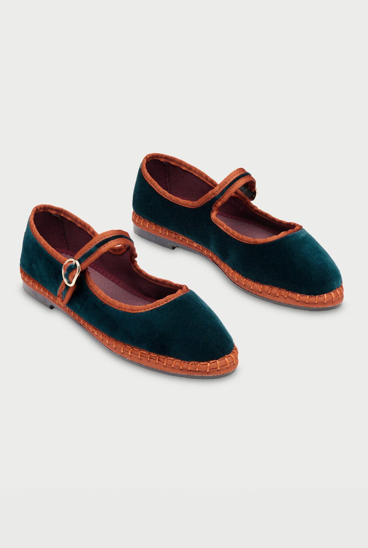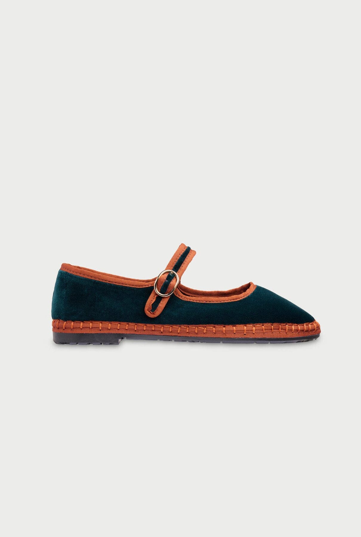 Mary Jane de terciopelo en color verde oscuro con ribete naranja y cierre de hebilla.