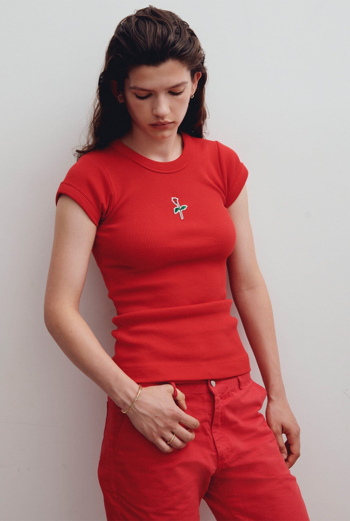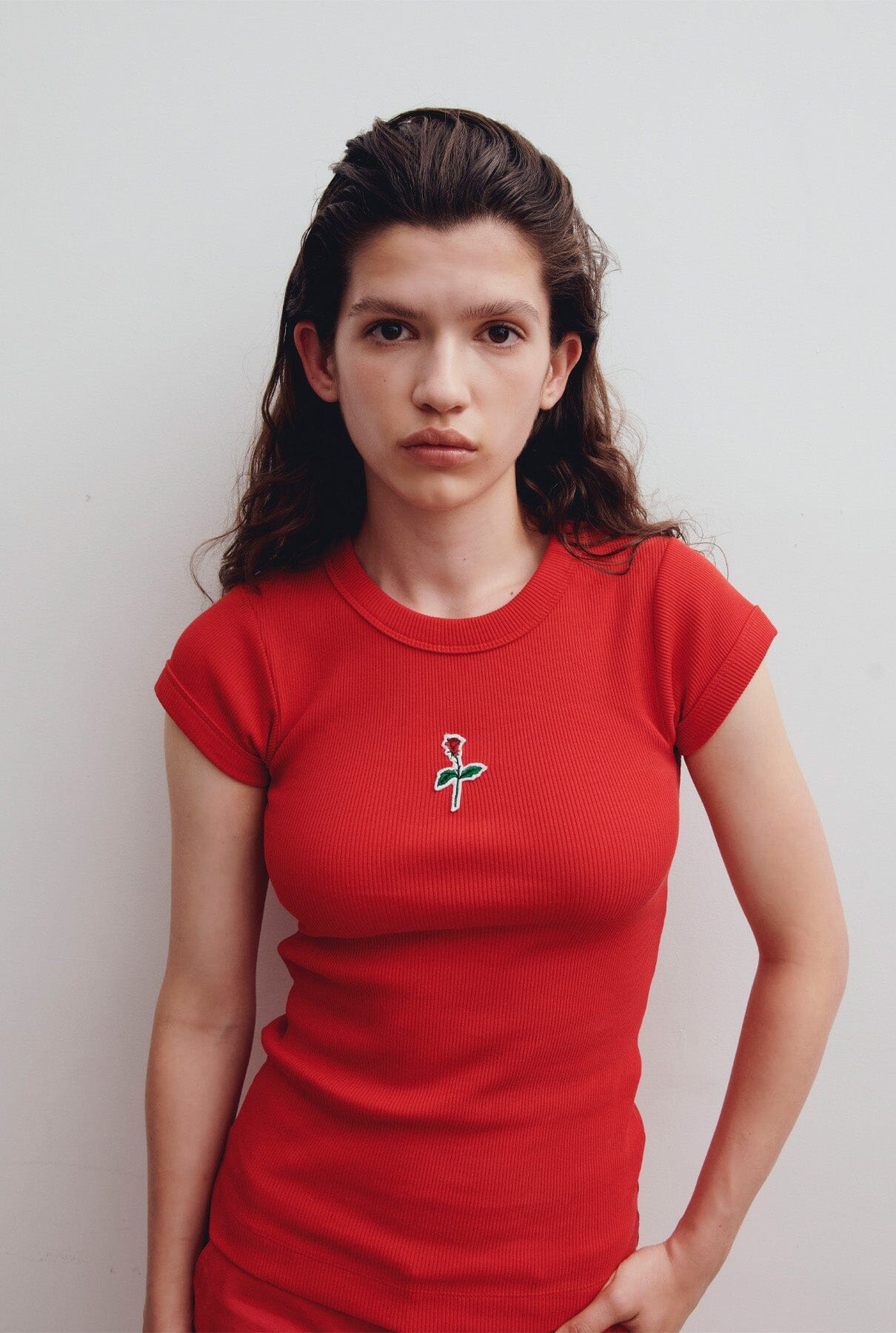 Camiseta corta Yconic de canalé en color rojo. Parche con el logo de Ynesuelves Rose bordado en la parte delantera. Ajustado.