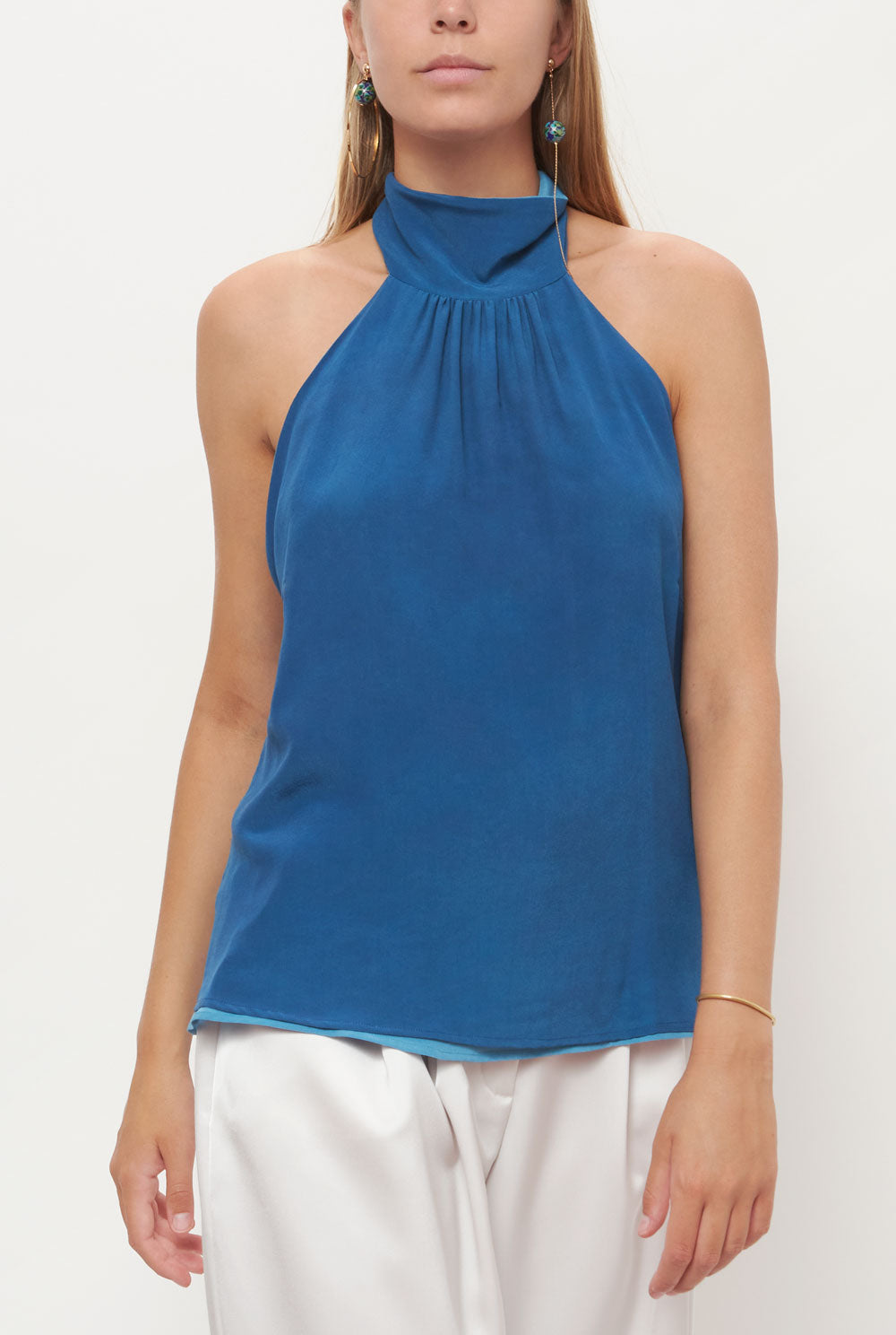 El top Halter es un top reversible de dos tonos que se ata alrededor del cuello, lo que lo convierte en dos tops en uno. Confeccionado 100% en crepe de seda.