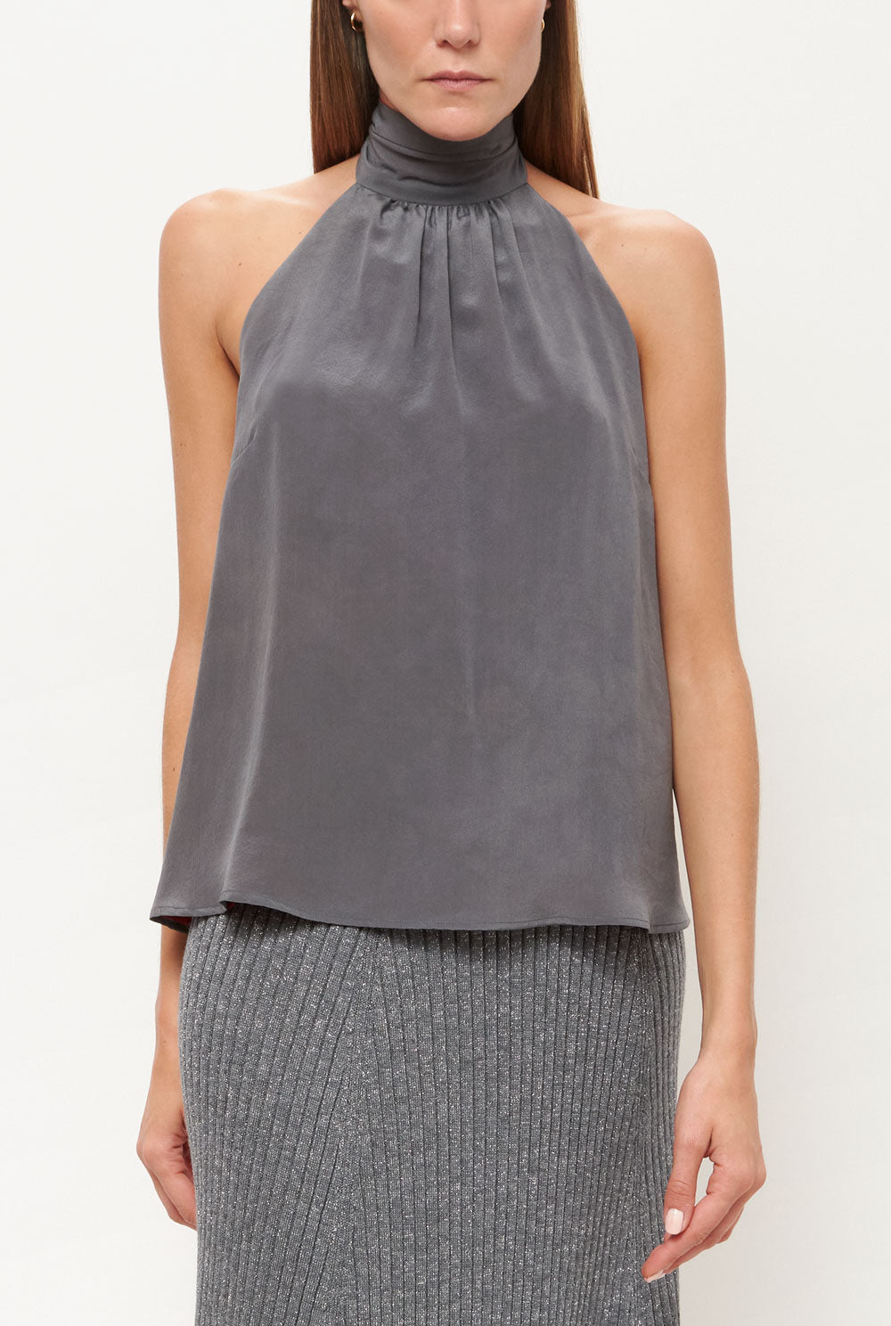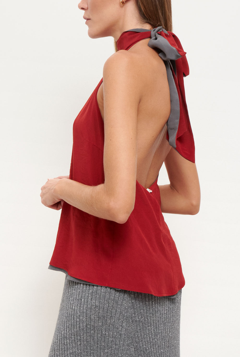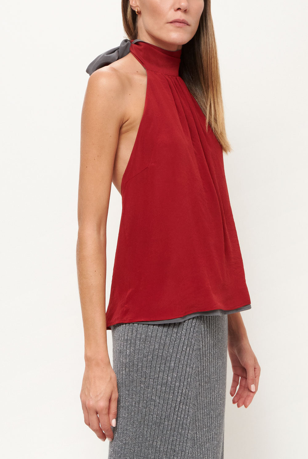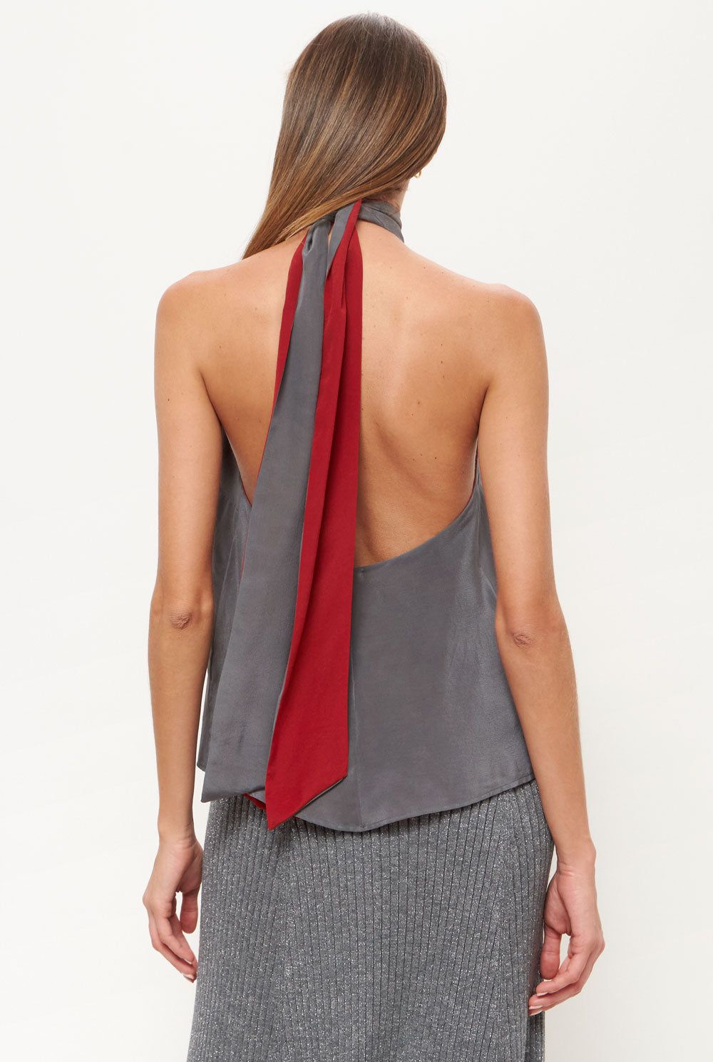 El top Halter es un top reversible de dos tonos que se ata alrededor del cuello, lo que lo convierte en dos tops en uno. Confeccionado 100% en crepe de seda.