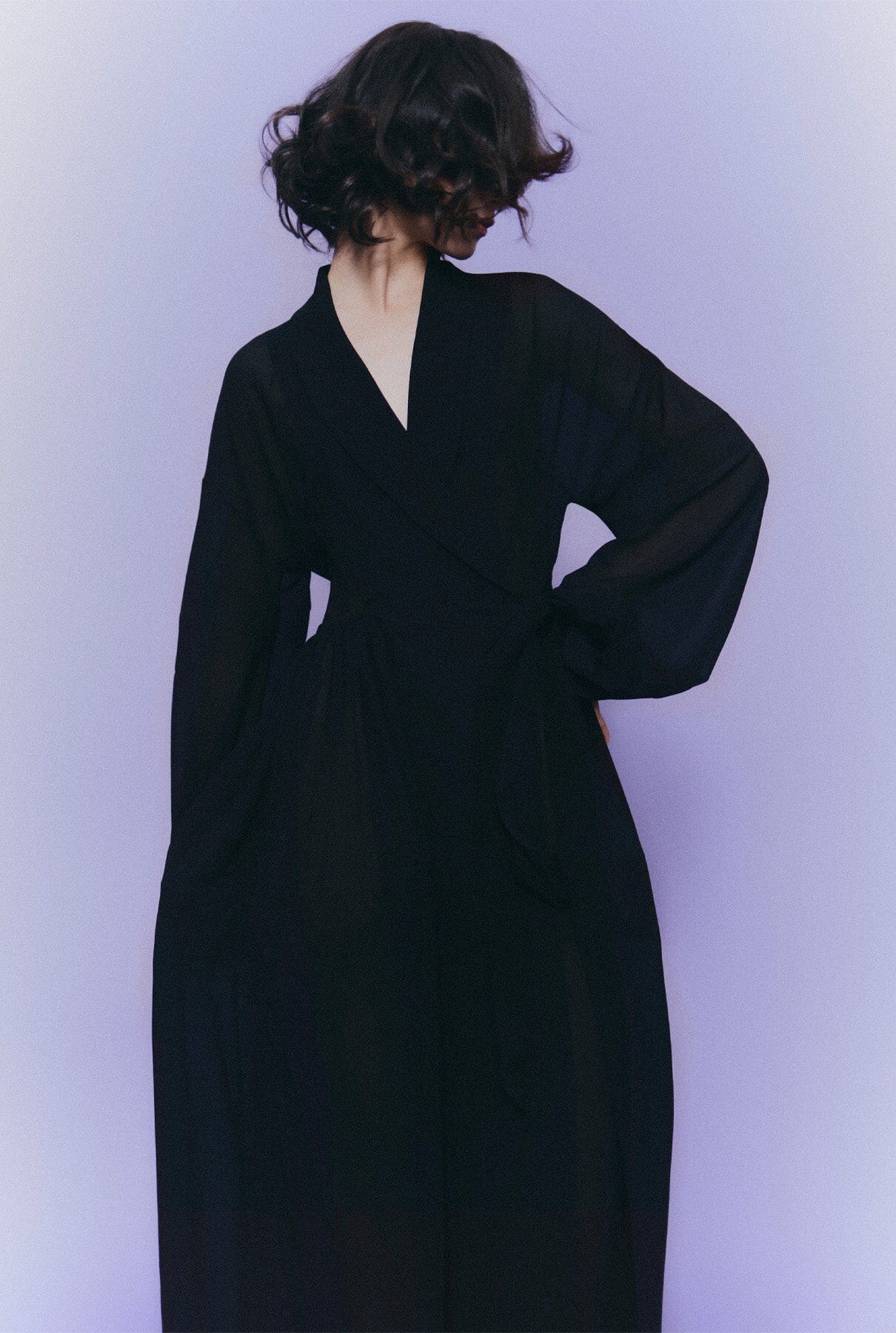 VESTIDO CAMISA CRUZADO CON CORTE EN LA CINTURA, MANGAS LARGAS ABULLONADAS Y FALDA CON VOLUMEN. ESCOTE EN V CON SOLAPA DE ESMOQUIN QUE CONDUCE A UN LAZO DE GROSGRAIN EN CONTRASTE. PARA SOPORTAR EL VOLUMEN, EL VESTIDO TIENE REFUERZOS INTERNOS DE CRIN