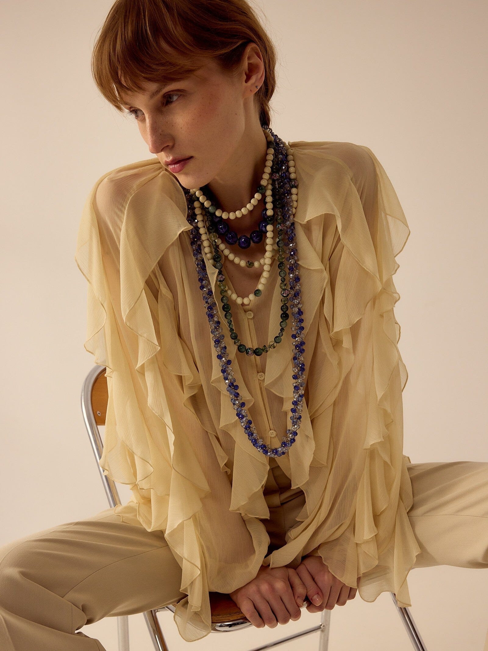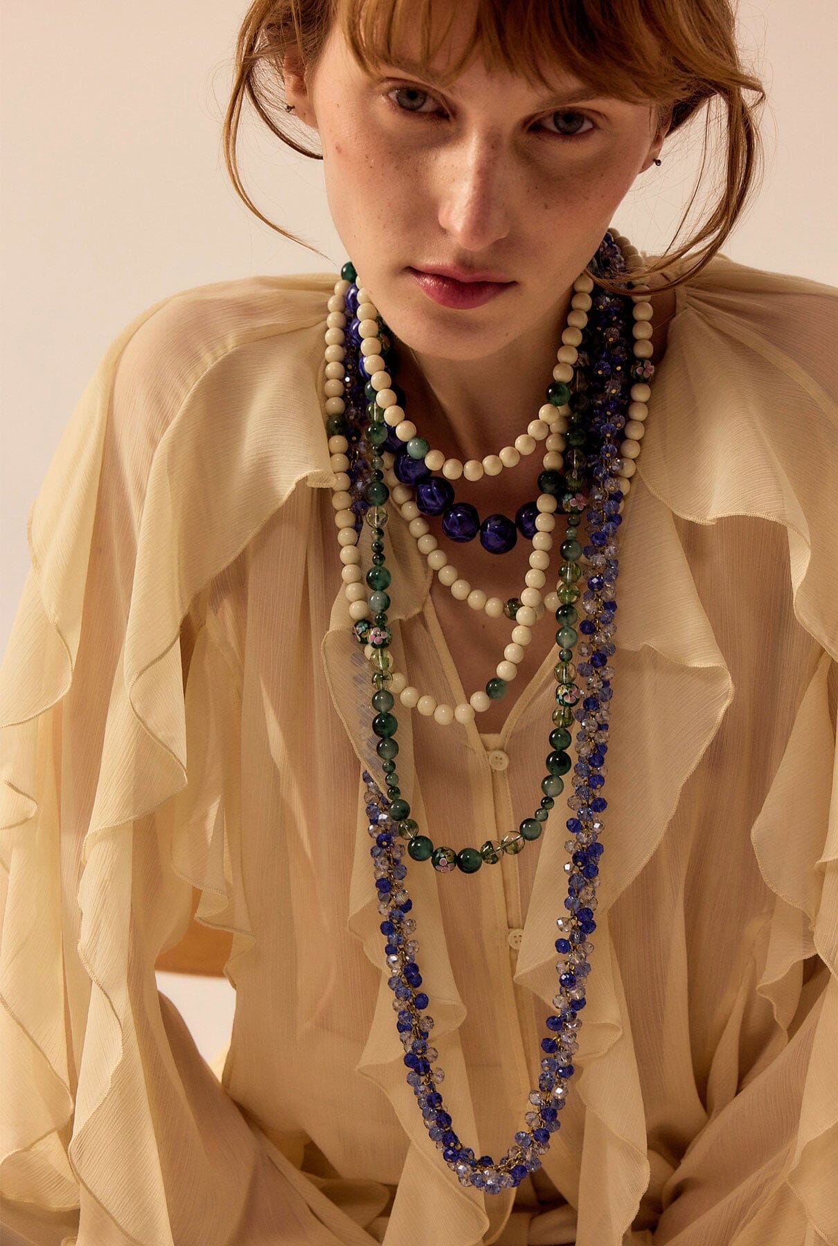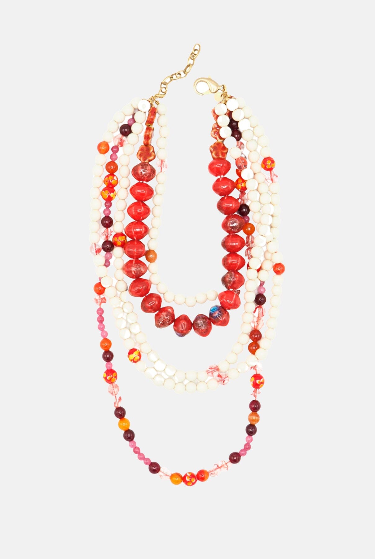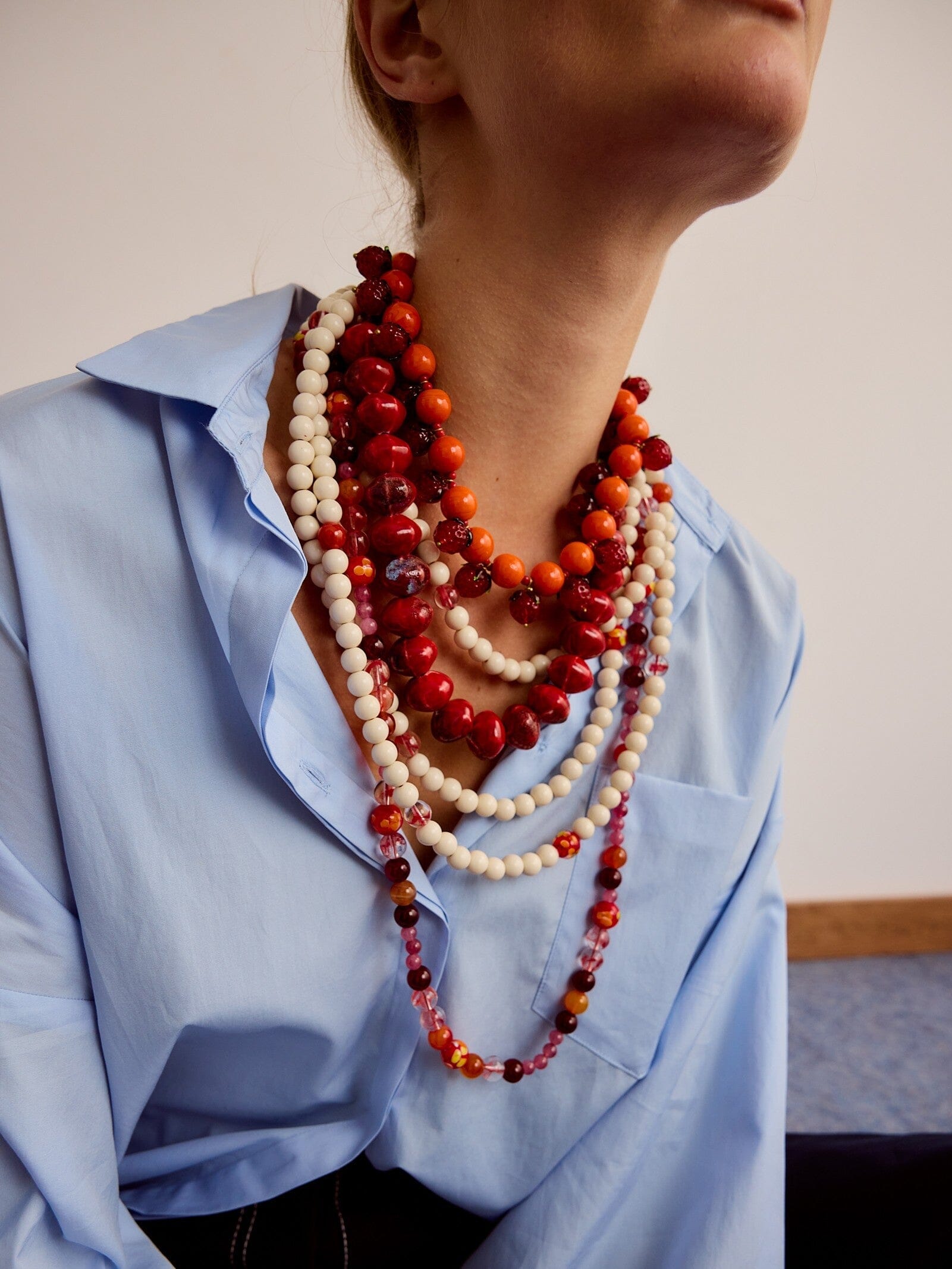 Long XL necklace with bib effect, made with several strips of different shapes, textures and colours.