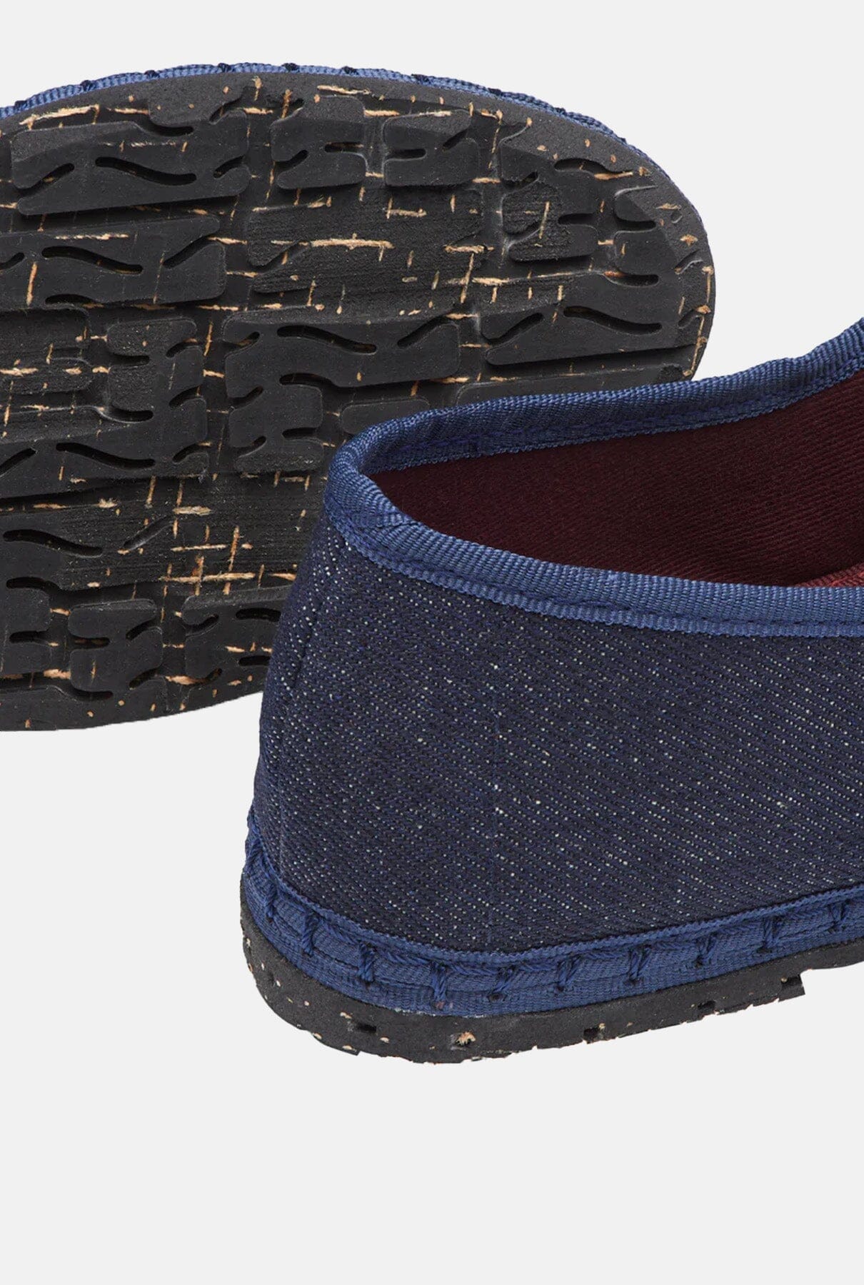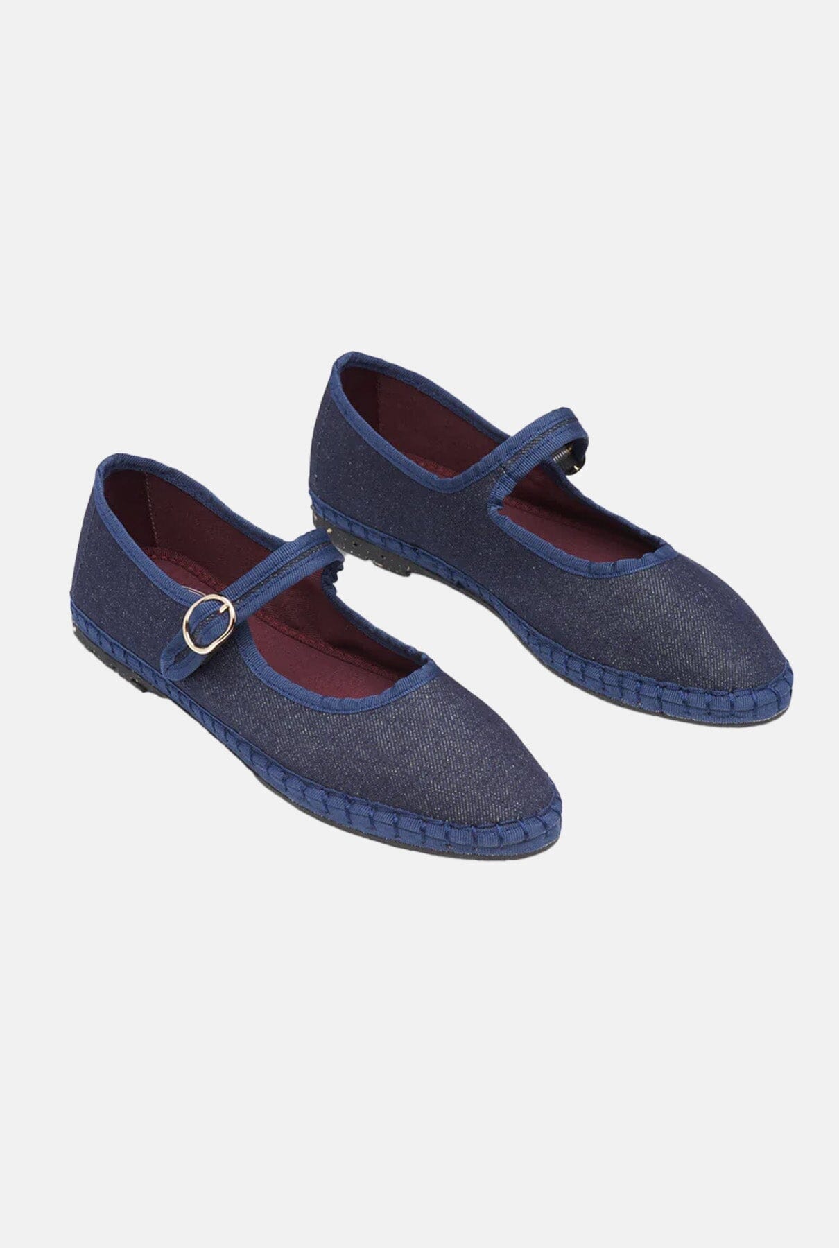 Mercedita denim de algodón con ribete azul marino y cierre con hebilla. El exterior del zapato es 100% algodón, y el interior del zapato es 100% algodón ecológico con tratamiento antibacteriano. La suela está hecha de caucho procedente de neumáticos de bicicleta reciclados.