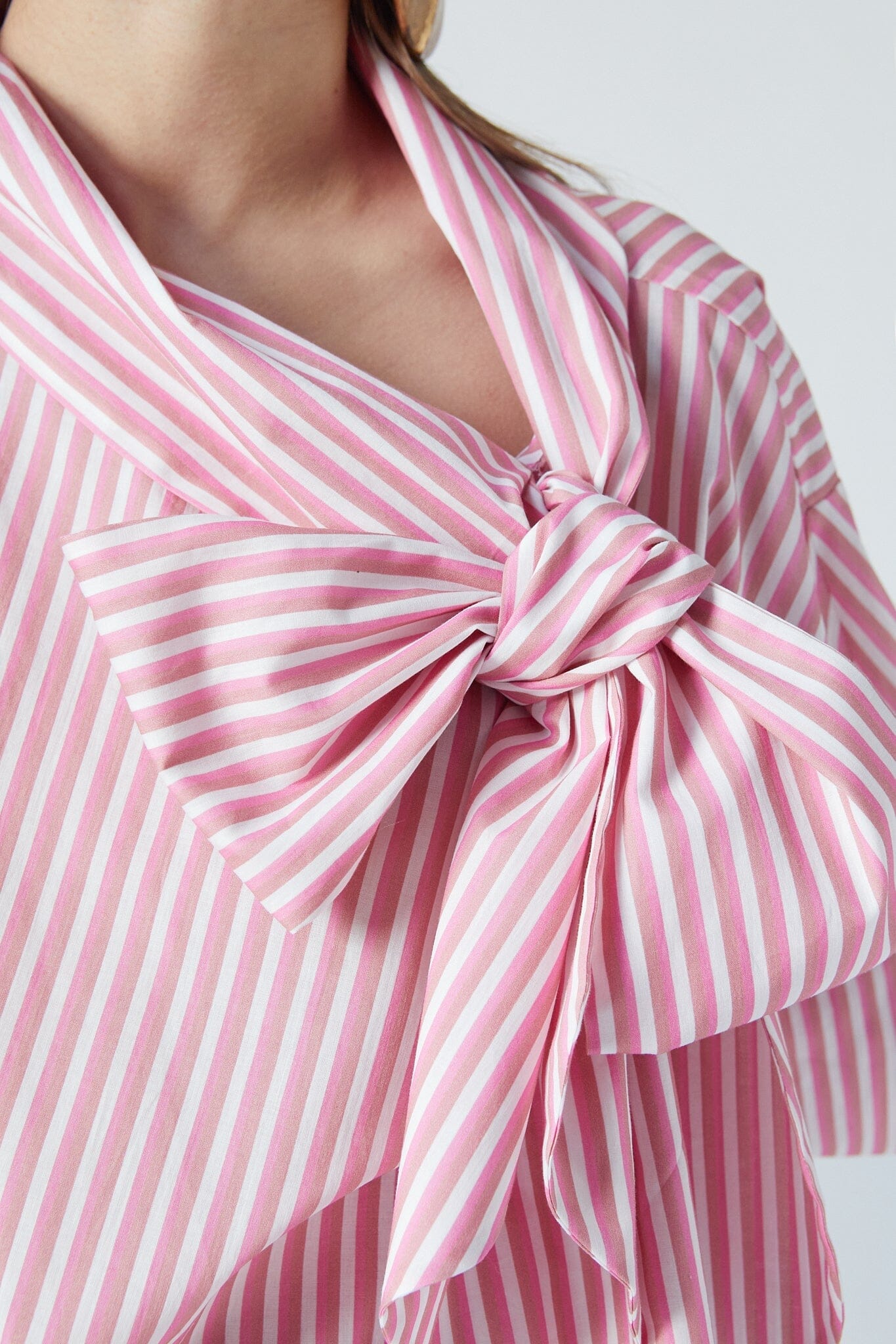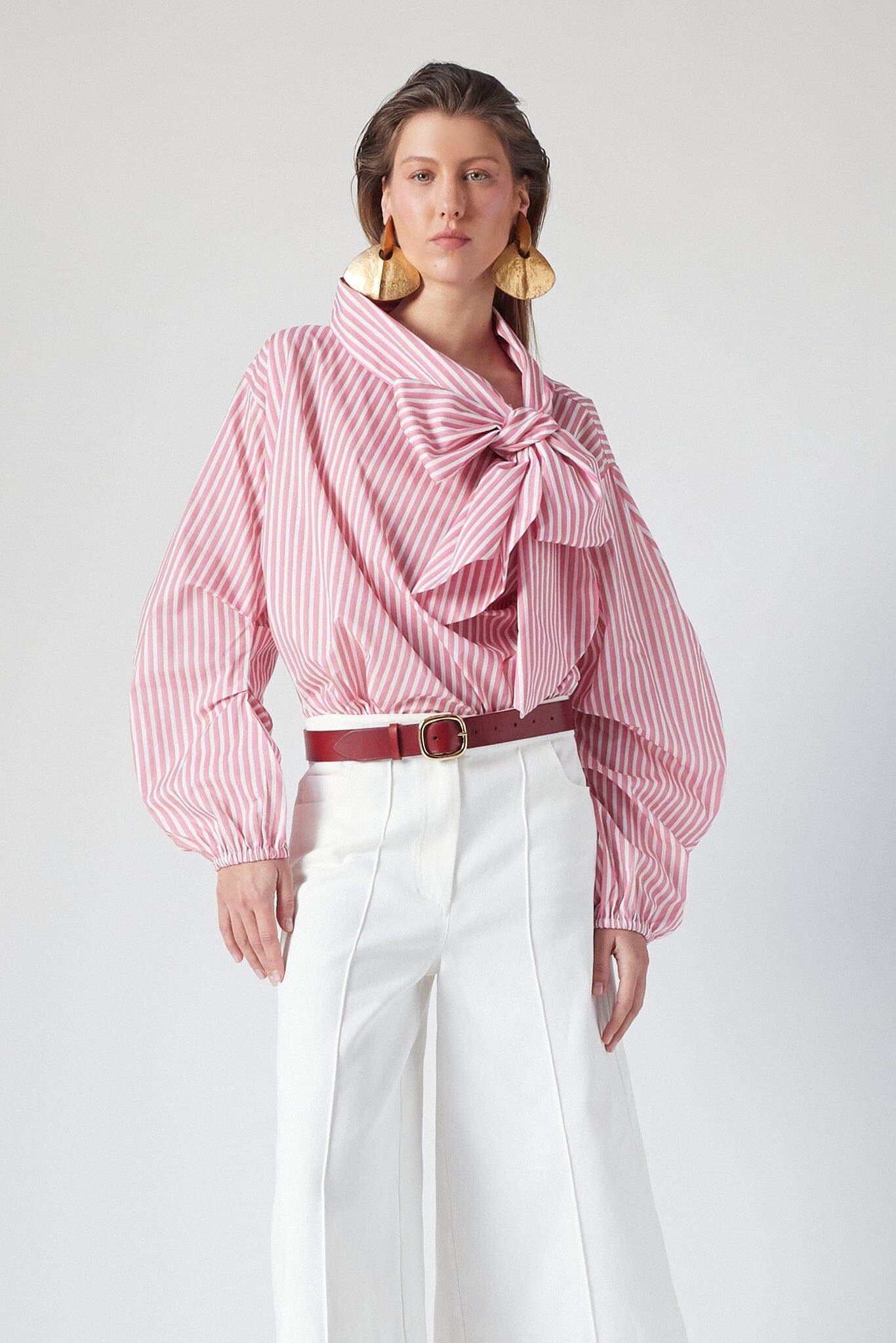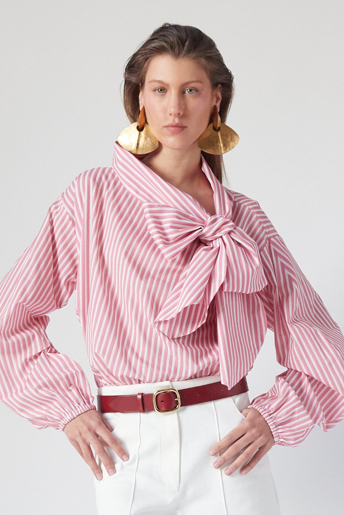 Esta sofisticada blusa de manga larga, confeccionada en un tejido rosa y rojo Tela a rayas, presenta un lazo impresionante y puños y bajo elásticos.