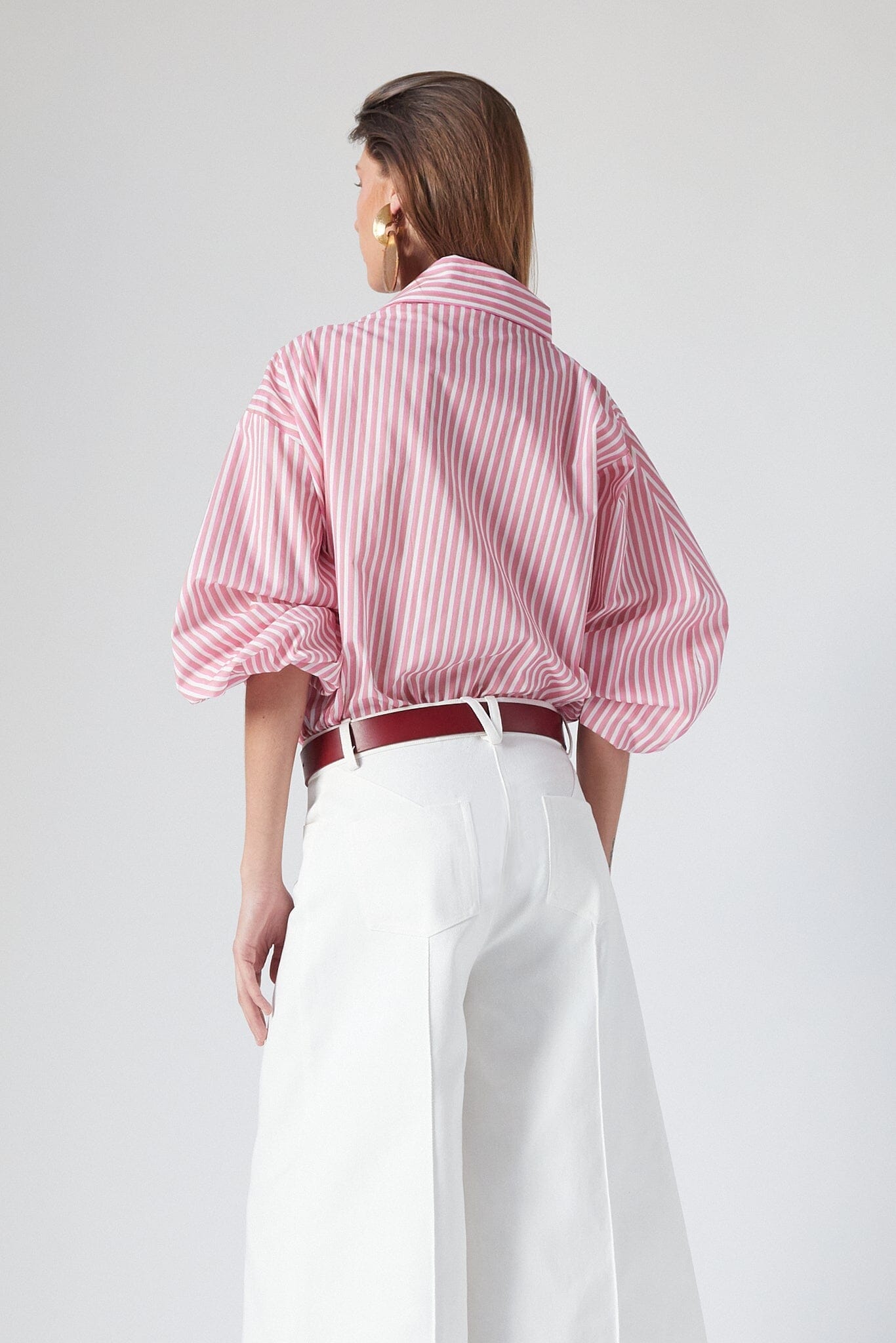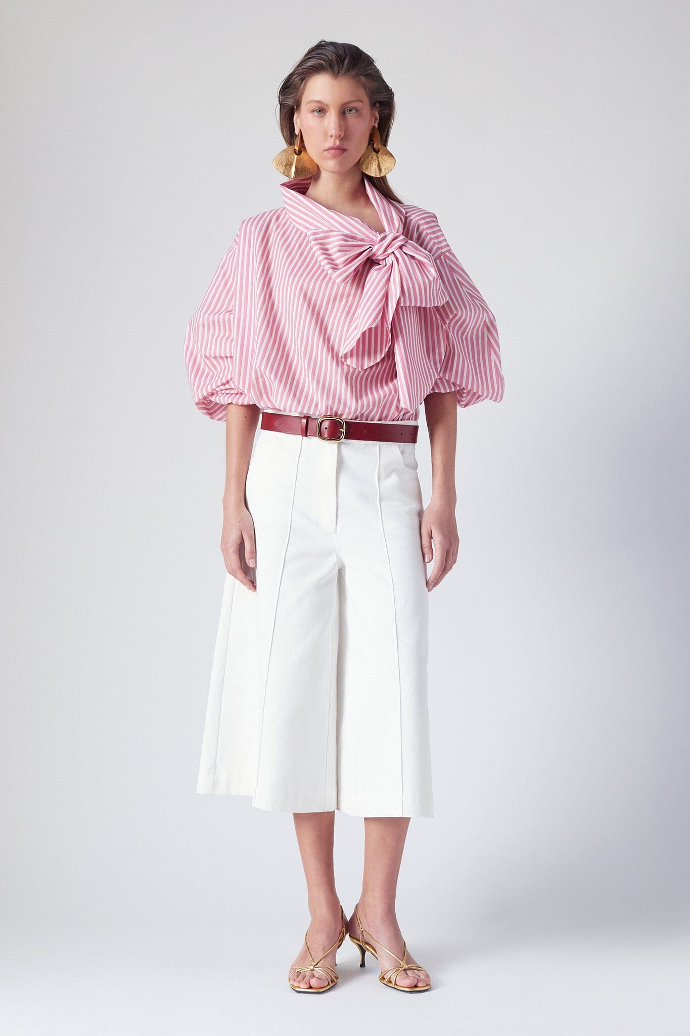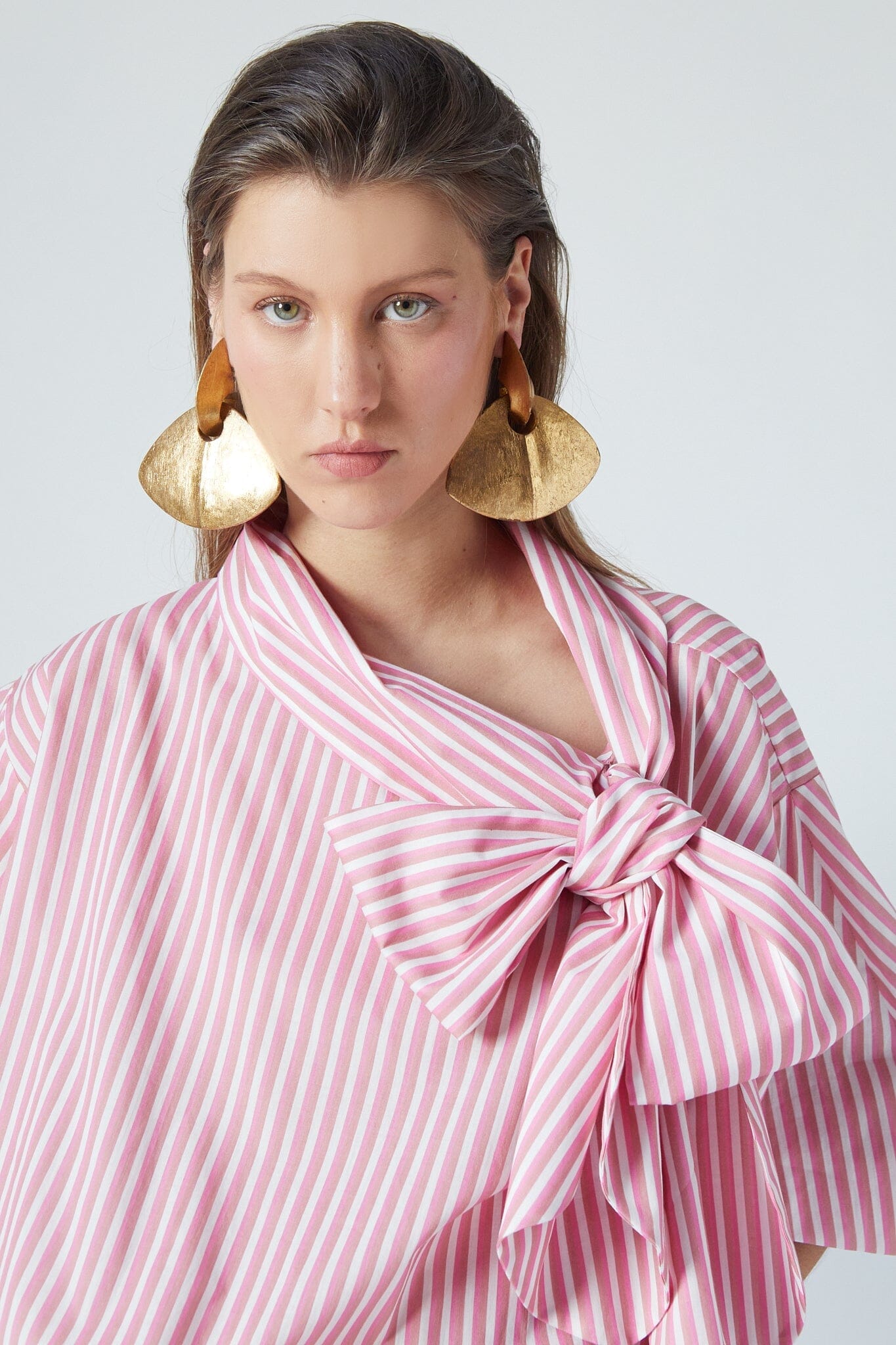 Esta sofisticada blusa de manga larga, confeccionada en un tejido rosa y rojo Tela a rayas, presenta un lazo impresionante y puños y bajo elásticos.