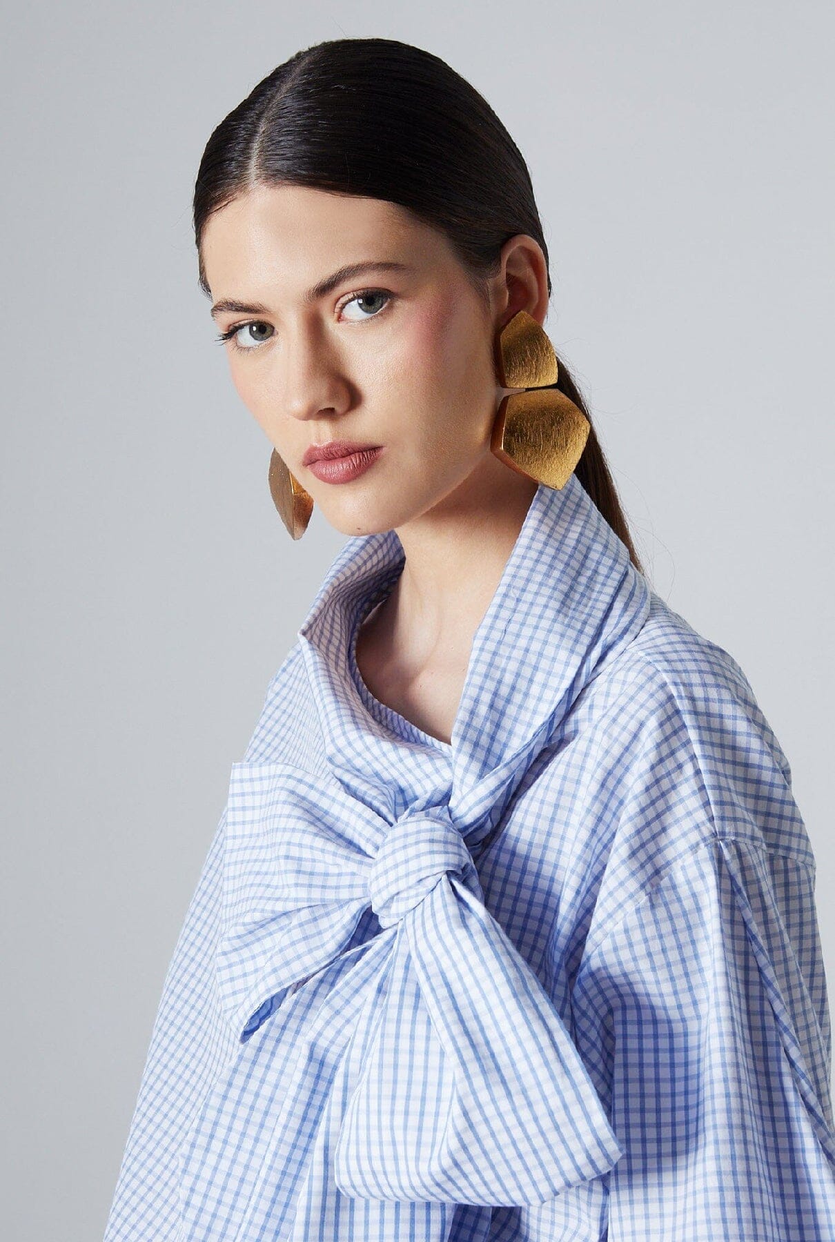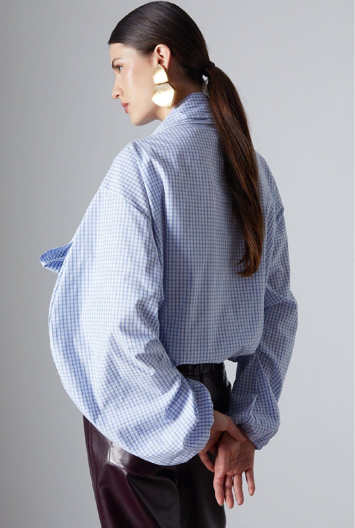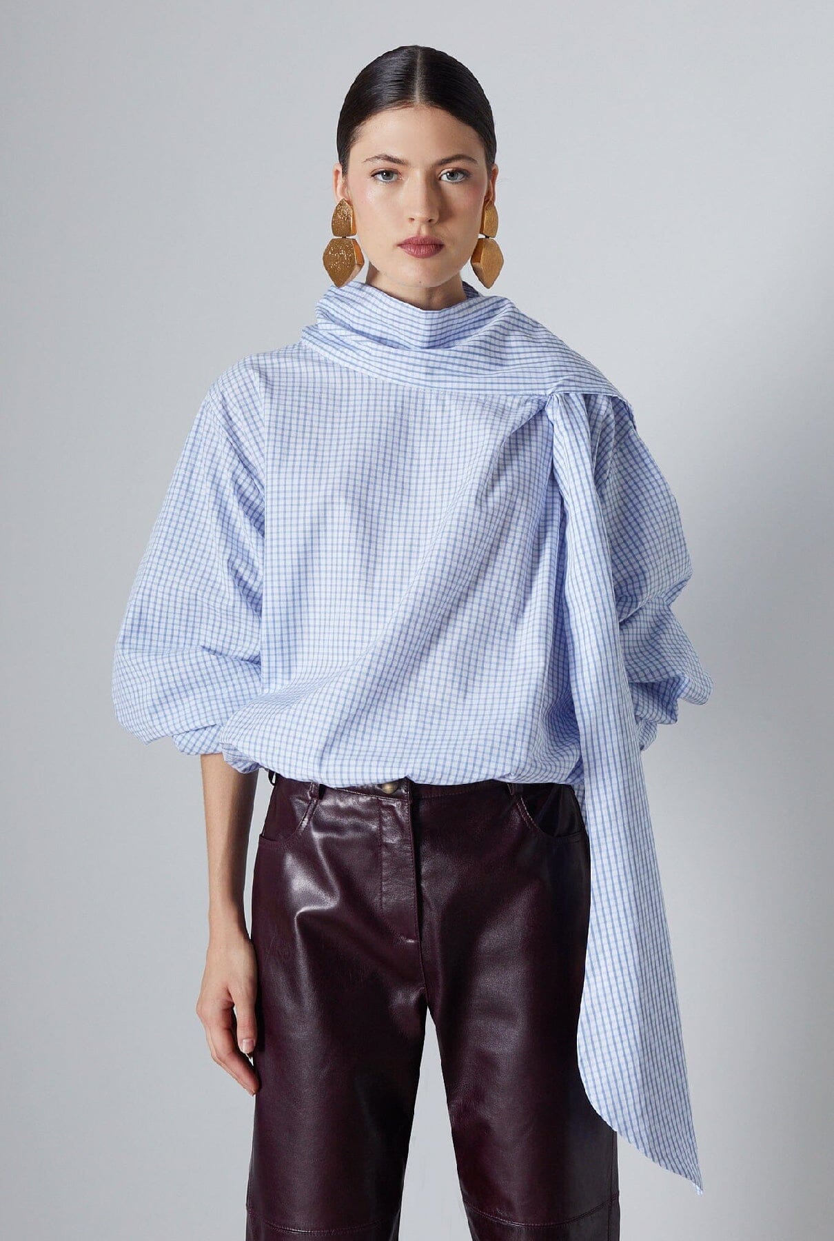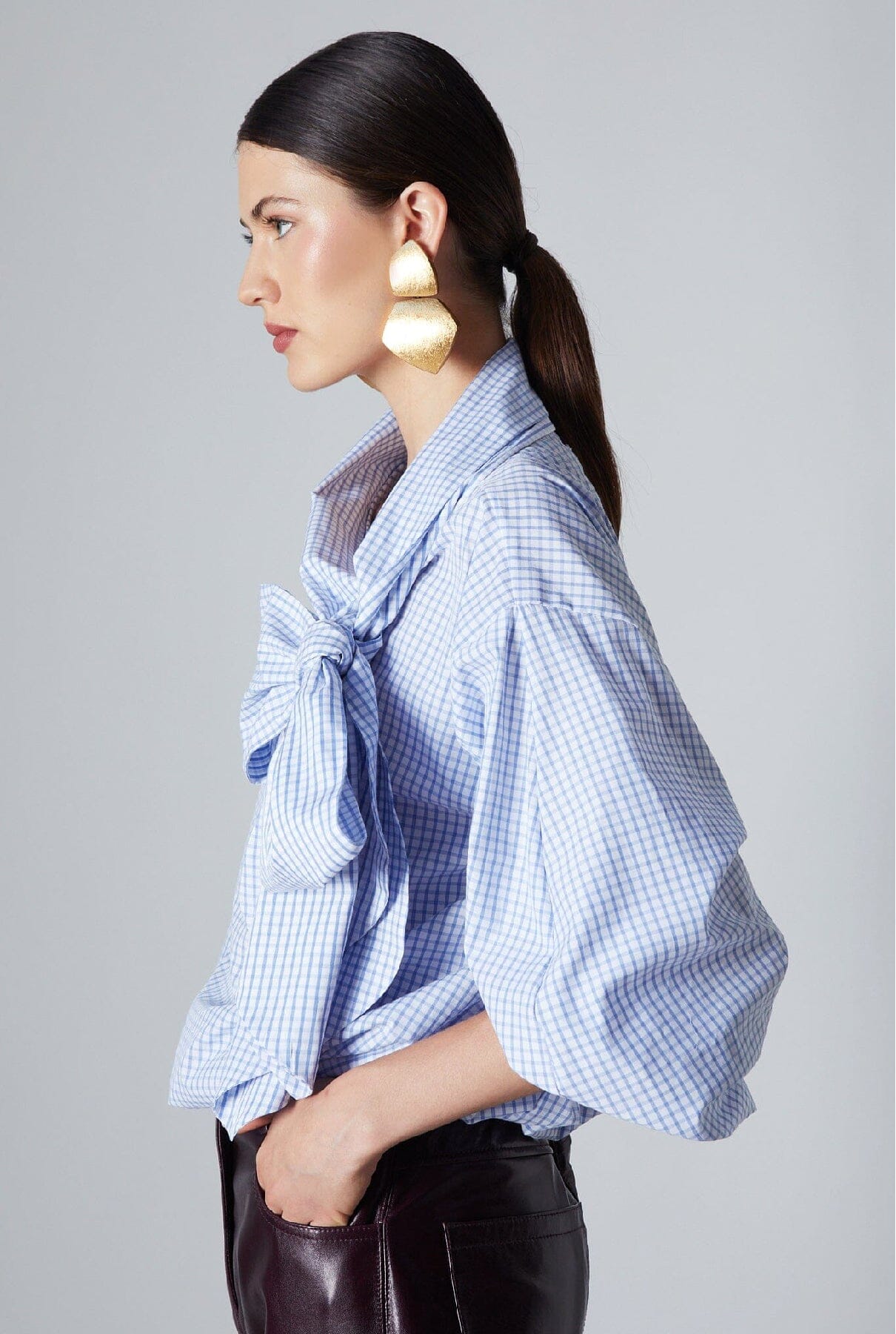 Presentamos la nueva blusa Sadie: una sofisticada blusa de manga larga confeccionada en una tela a cuadros de color azul claro con un impresionante lazo y puños y bajo elásticos.