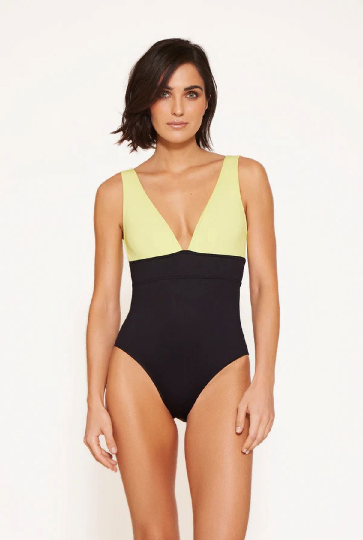 Jersey bicolor con triángulos envolventes y tirantes anchos.