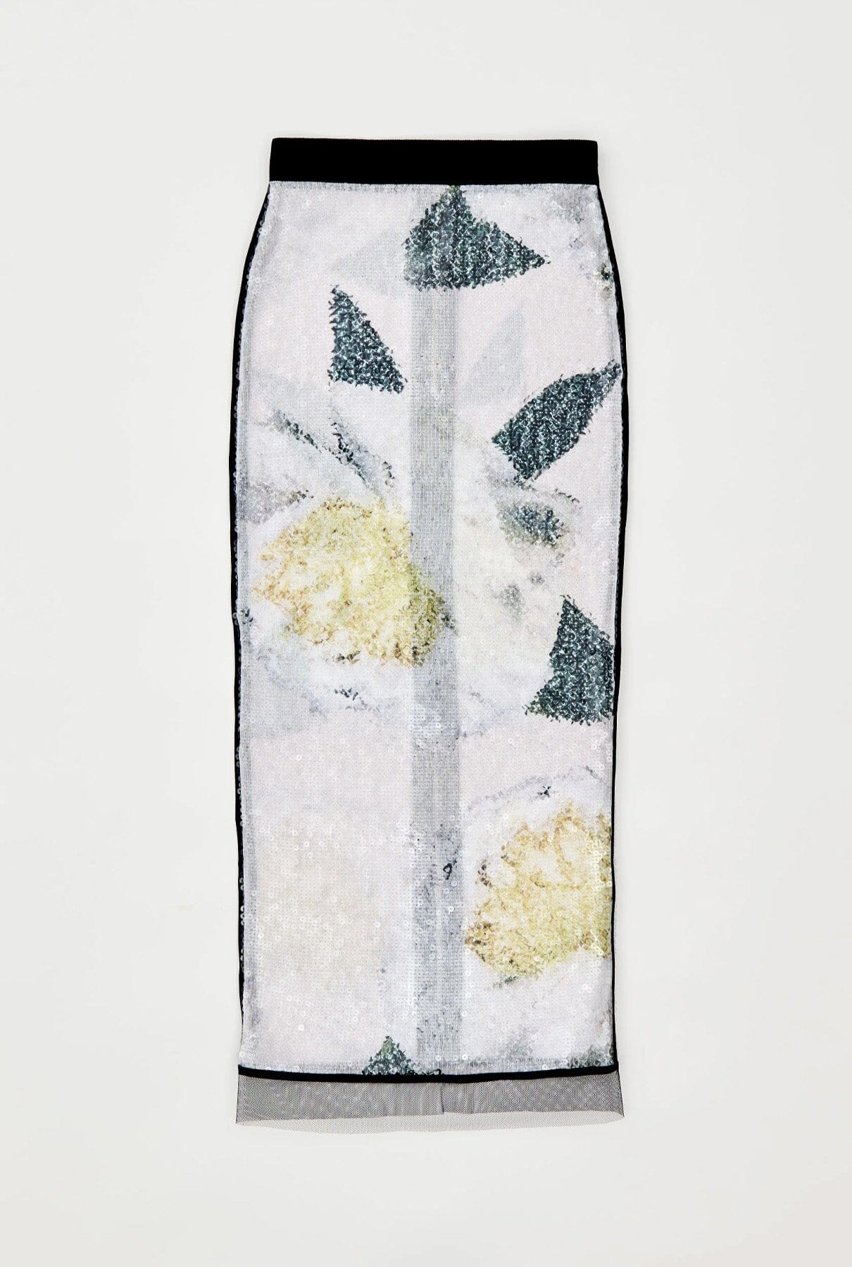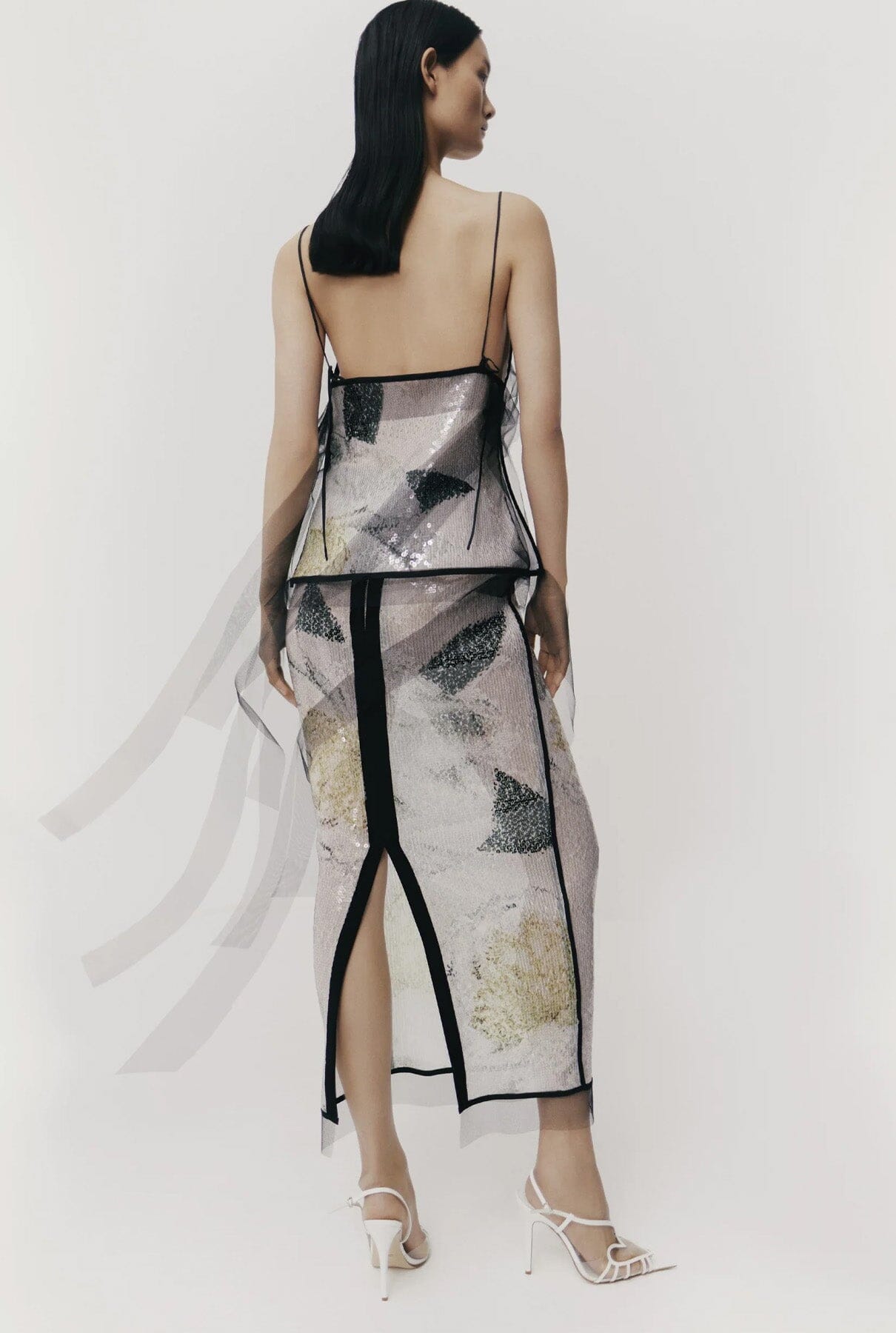 FALDA LÁPIZ CON LENTEJUELAS ESTAMPADA TRANSPARENTE, TERMINADA CON MÚLTIPLES TUBERÍAS NEGRAS EN CONTRASTE. CINTURA DE GROSGRAIN CON CREMALLERA DE CORAZÓN DE METAL EN LA ESPALDA. FONDO ADORNADO CON UNA TIRA DE TUL NEGRO.