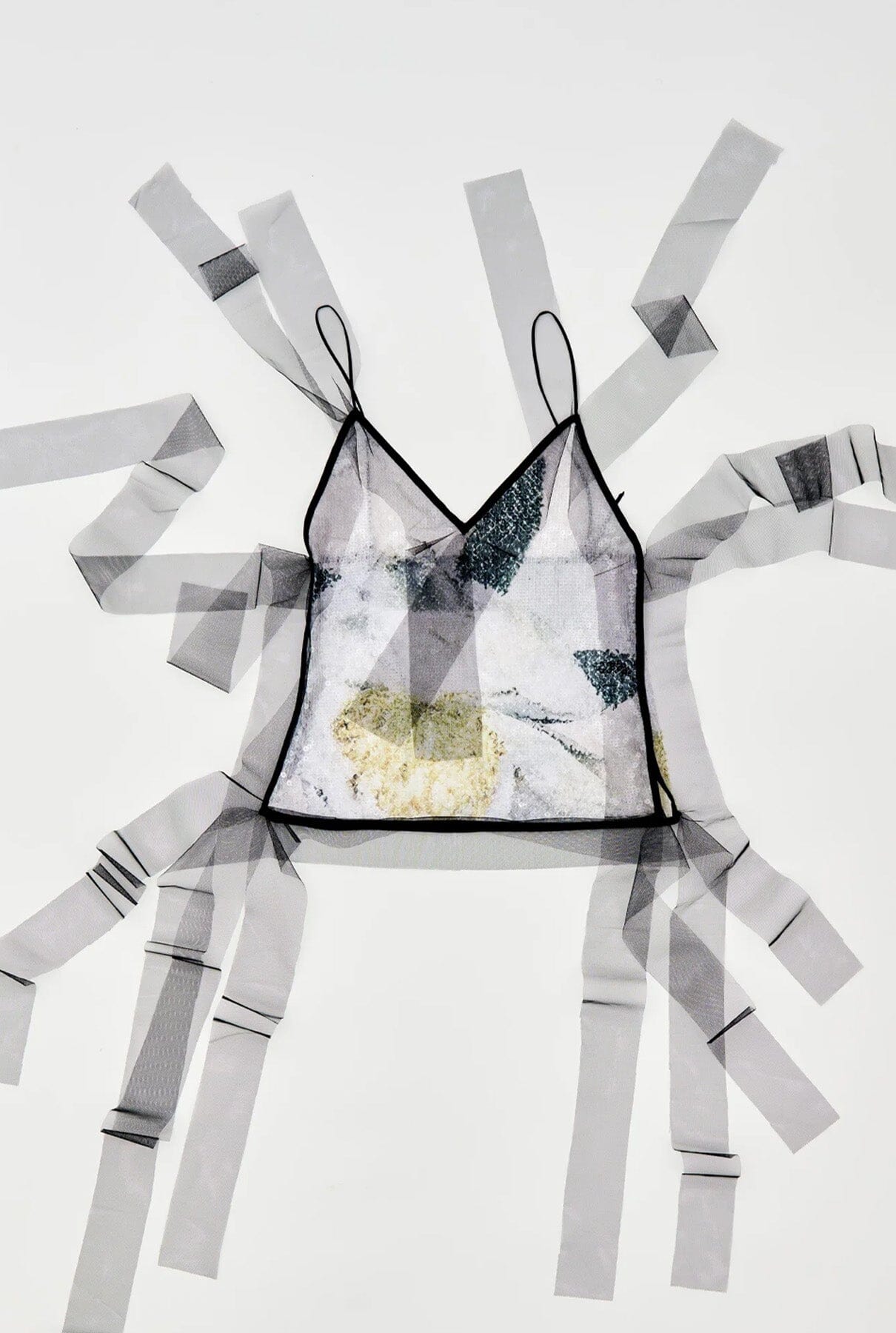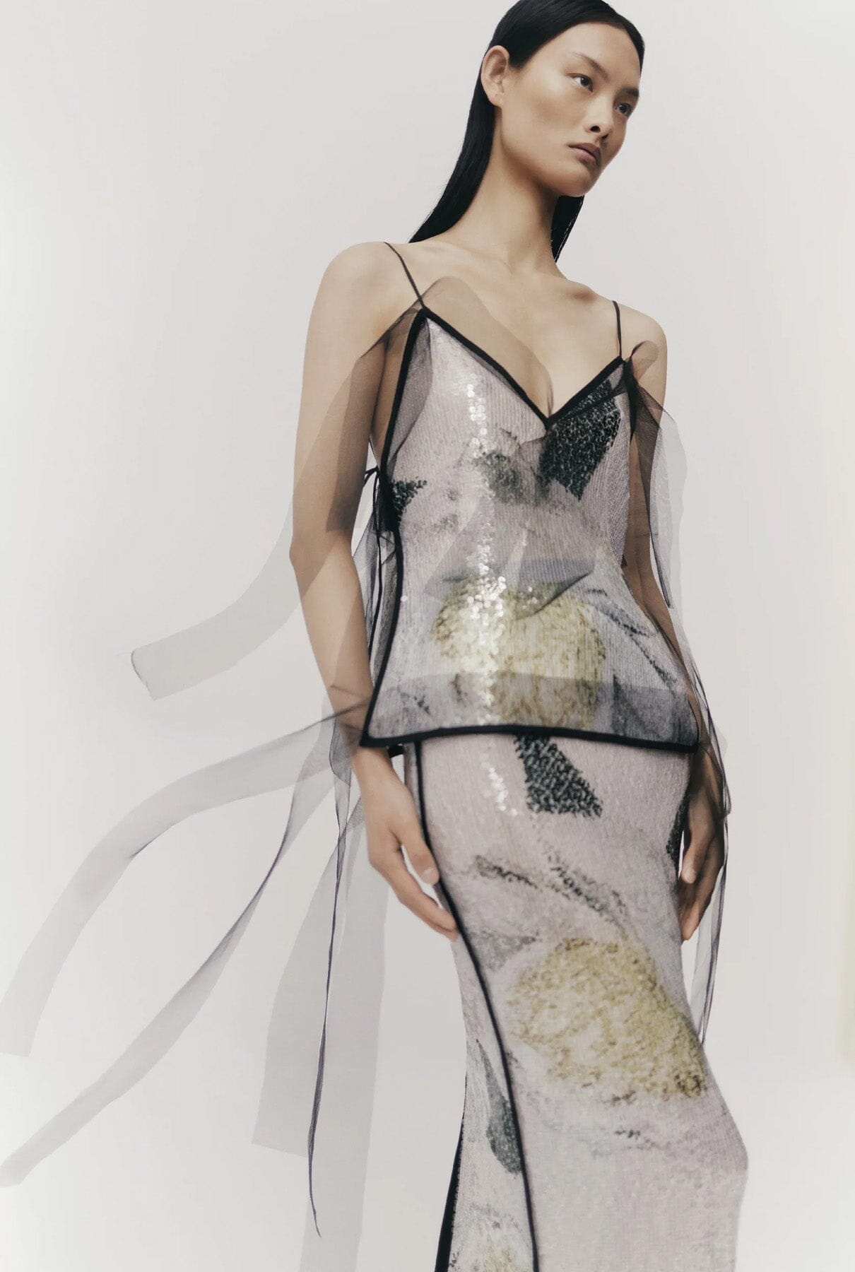 TOP DE LENTEJUELAS ESTAMPADAS TRANSPARENTES, ESCOTE EN V, REMATADO CON MÚLTIPLES VIVOS EN CONTRASTE NEGRO Y TIRAS DE TUL QUE ADORNAN LA PIEZA.