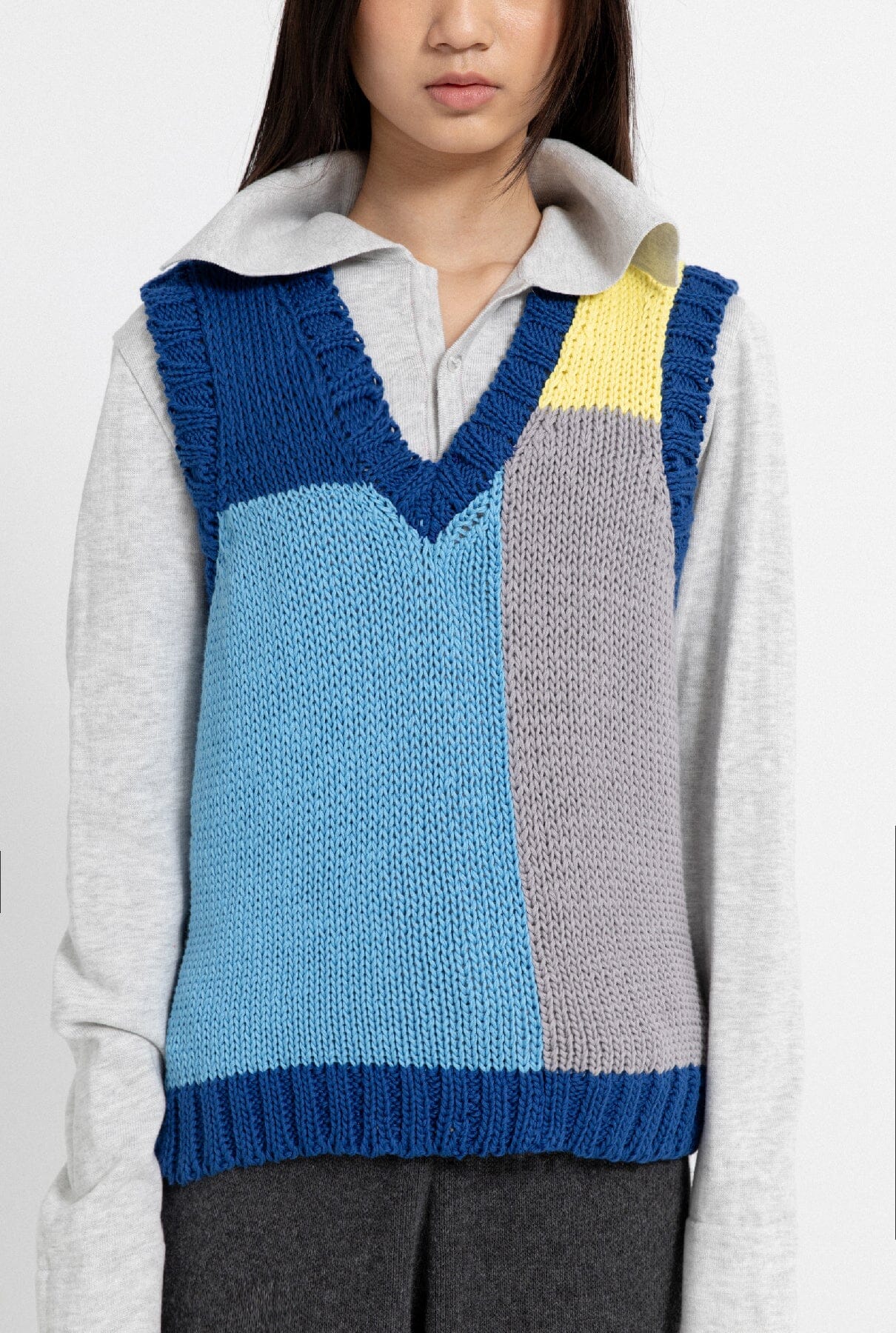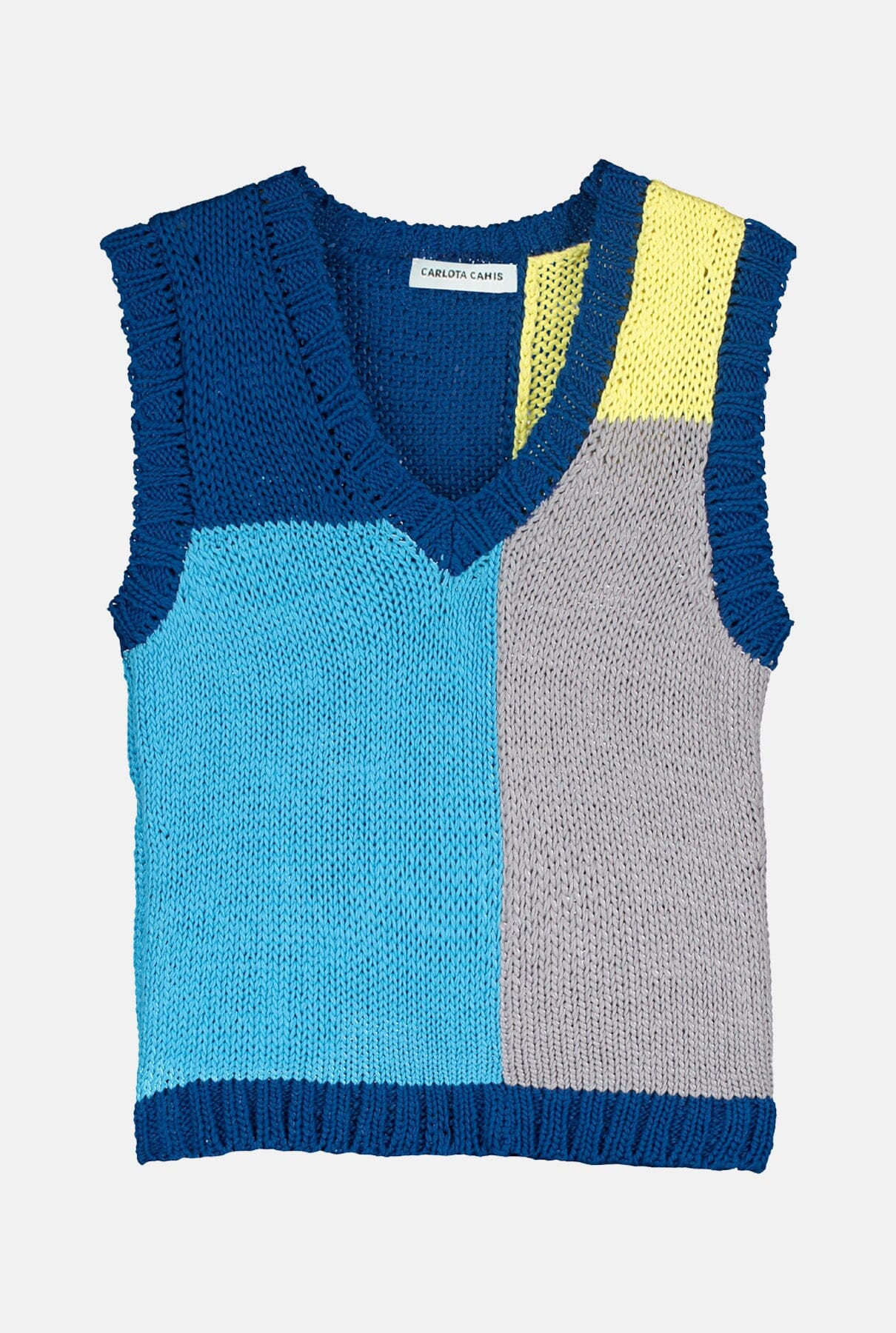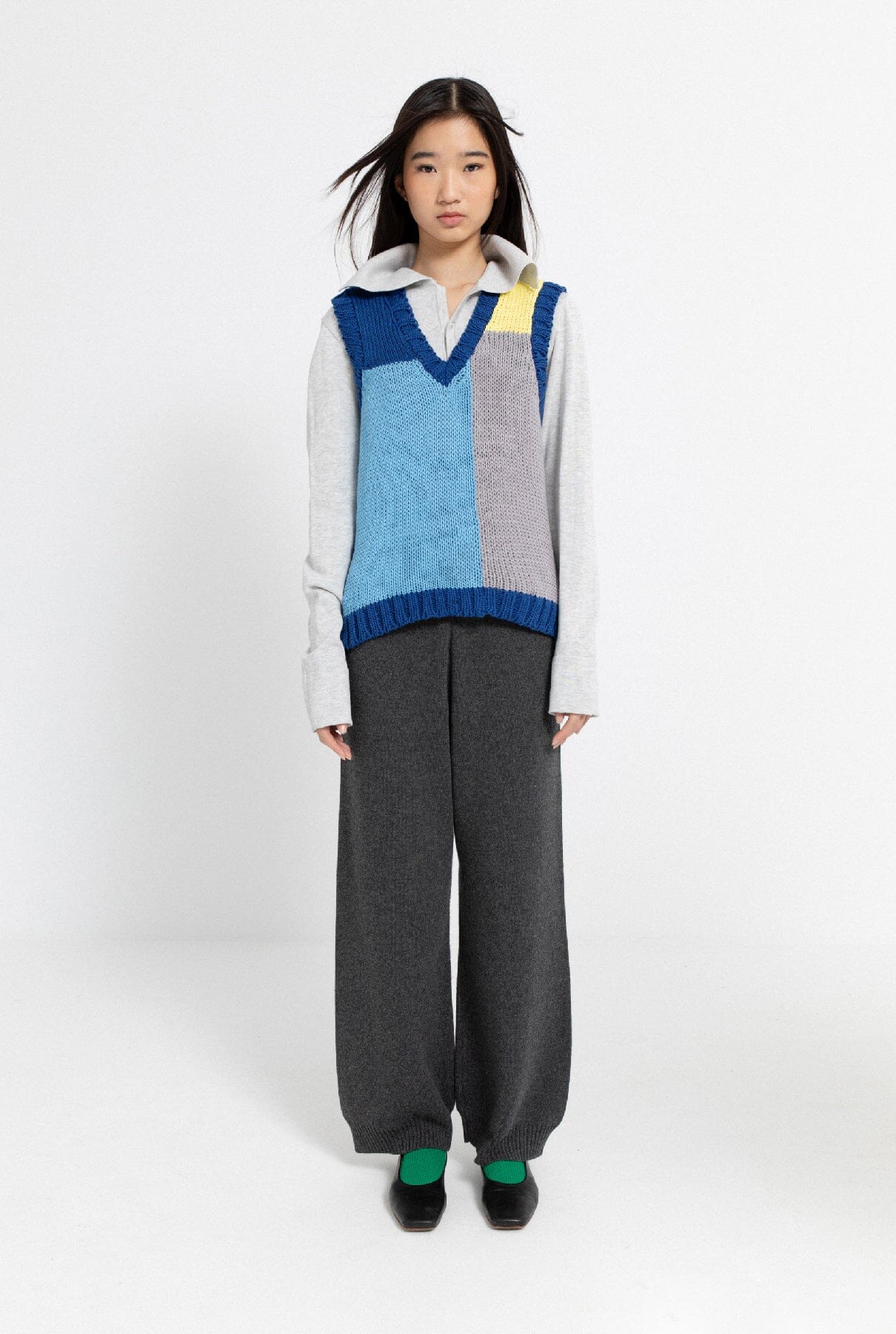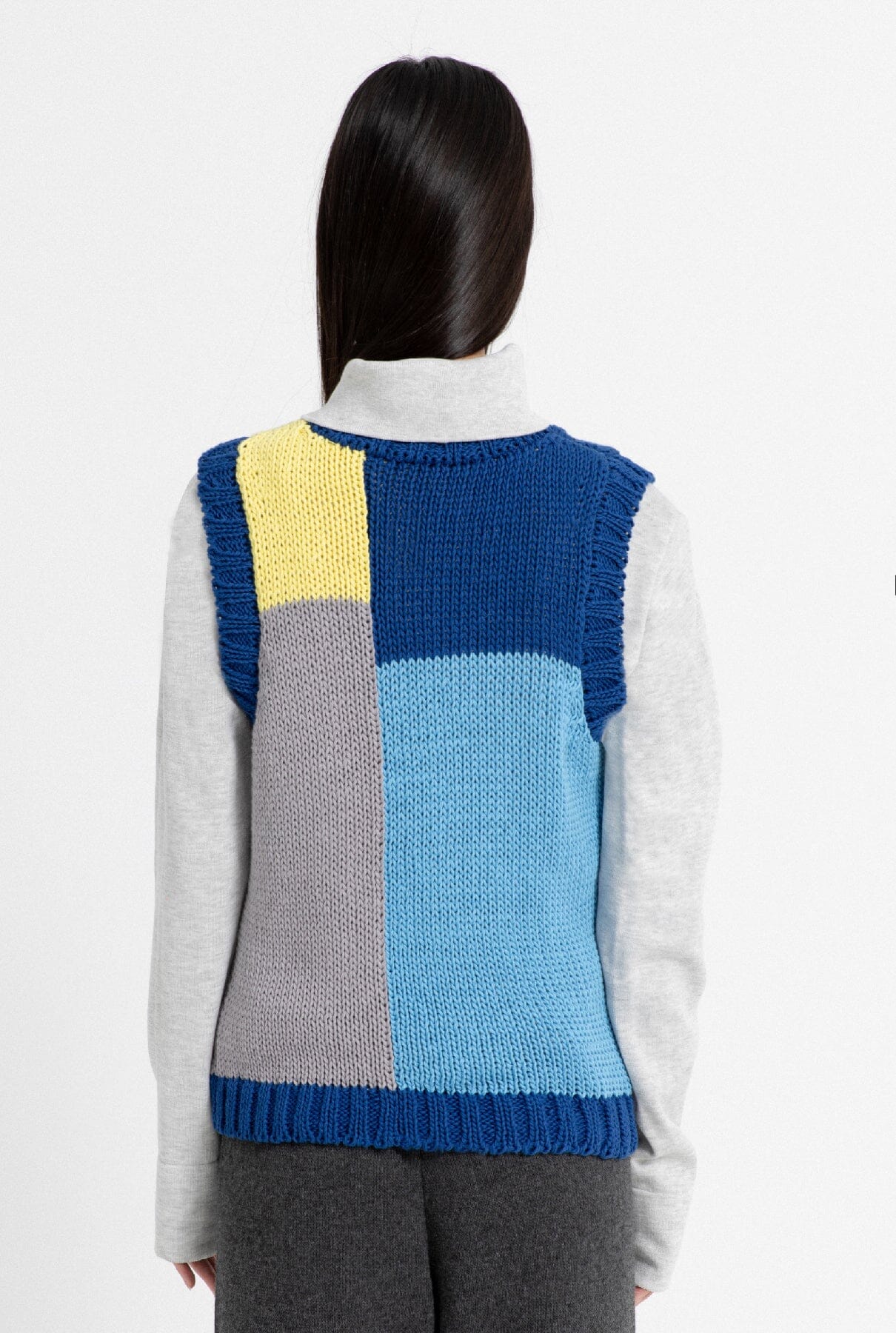 Chaleco de patchwork con escote en pico. Todos los acabados son acanalados. Tejido a mano.
