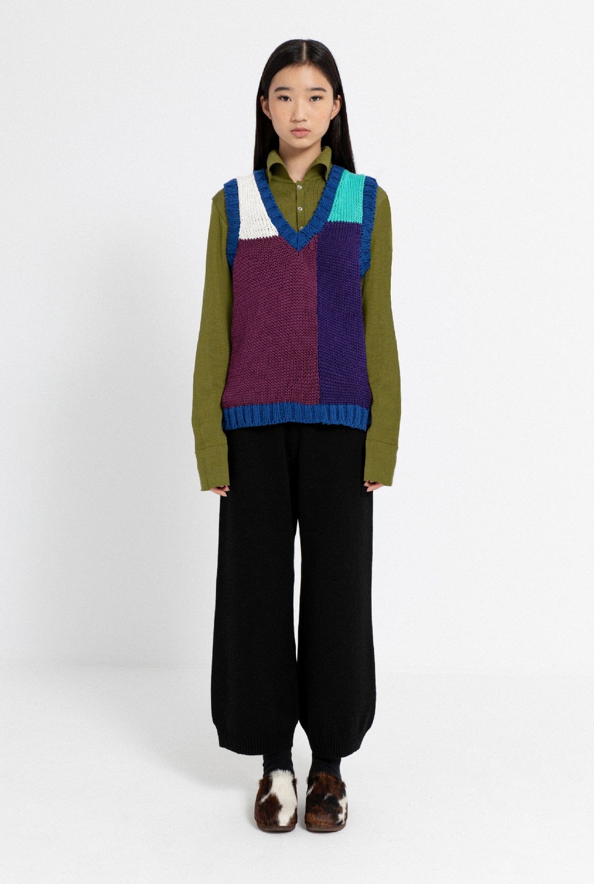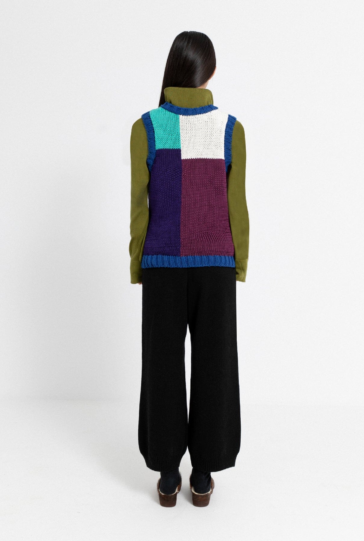 Chaleco de patchwork con escote en pico. Todos los acabados son acanalados. Tejido a mano.