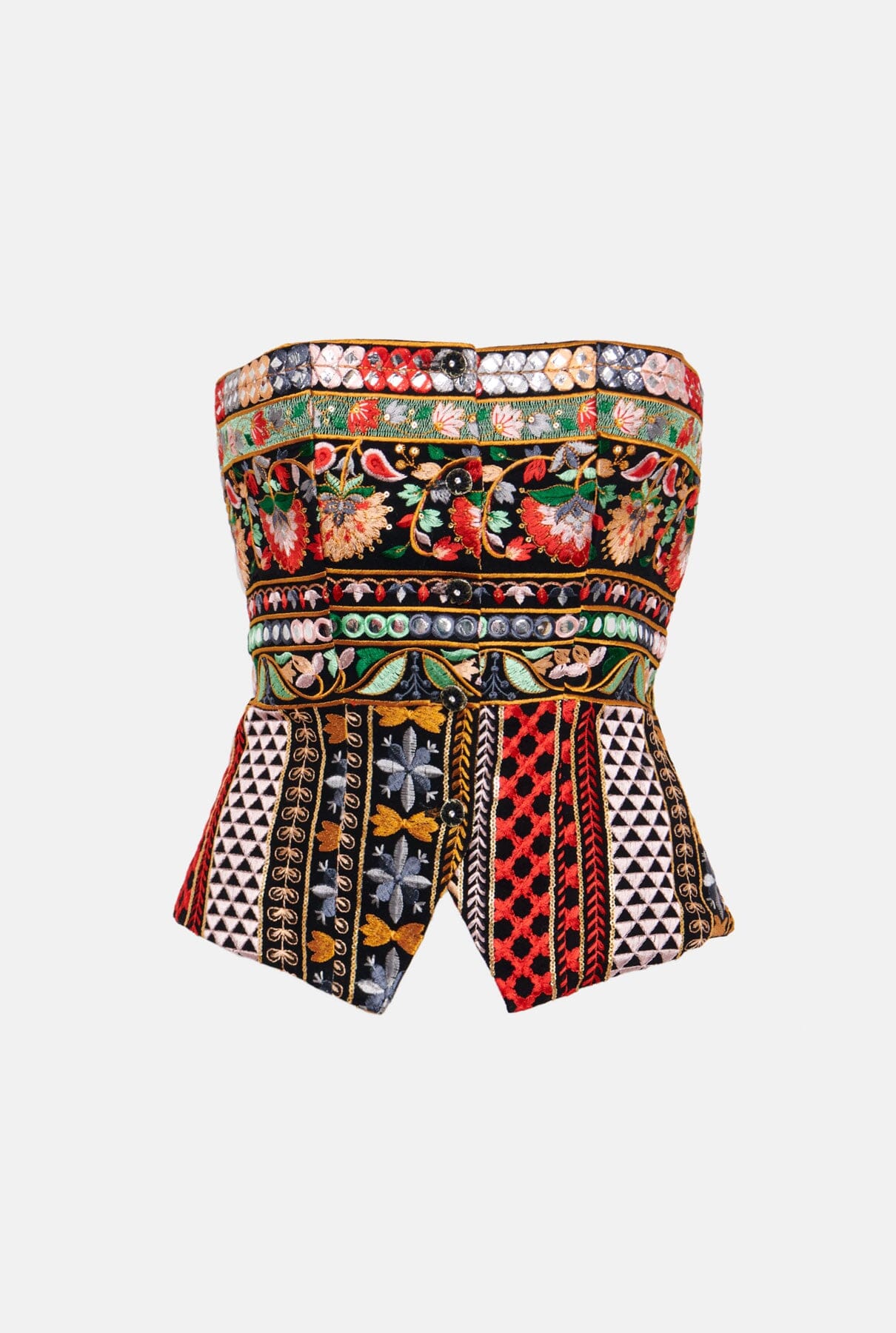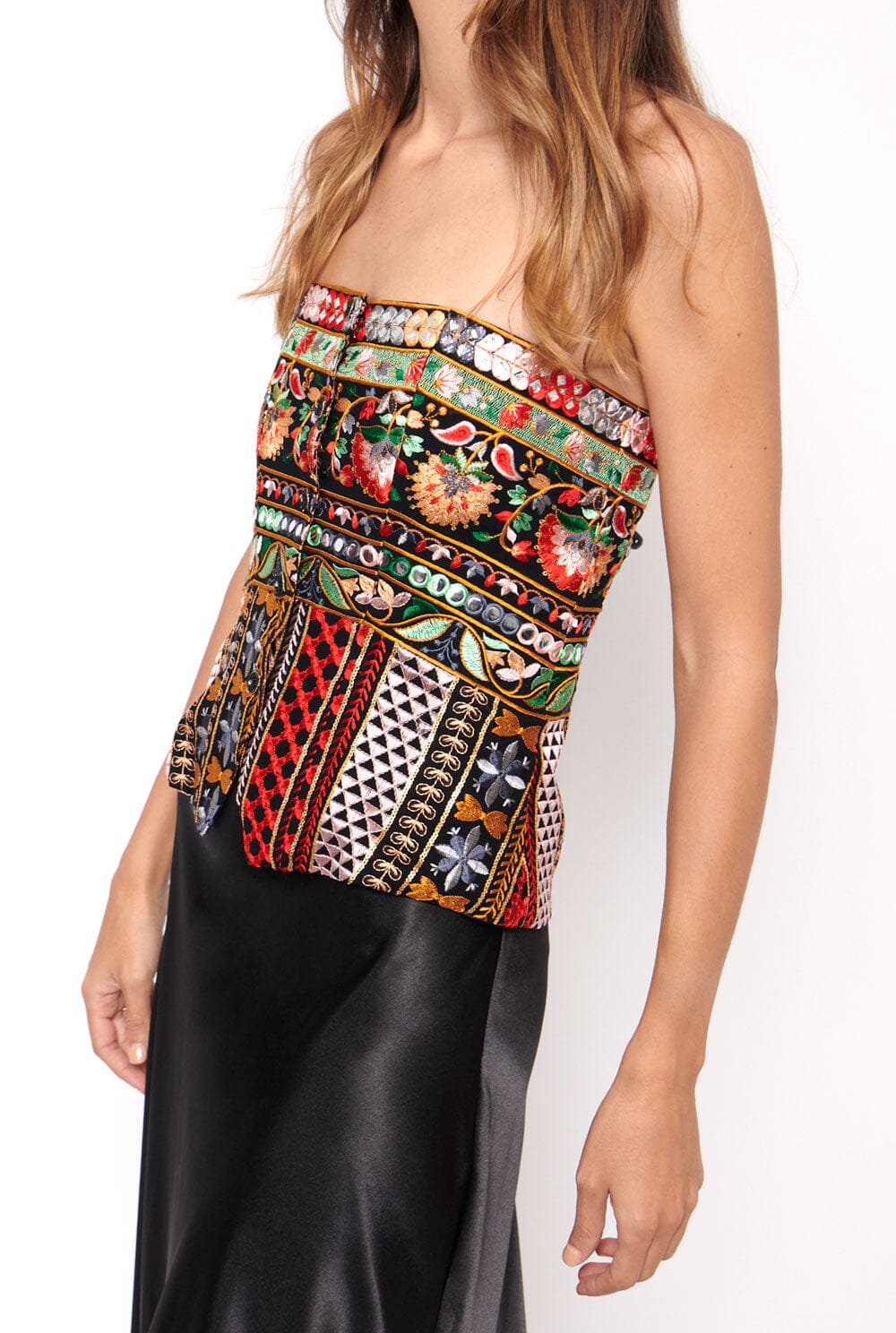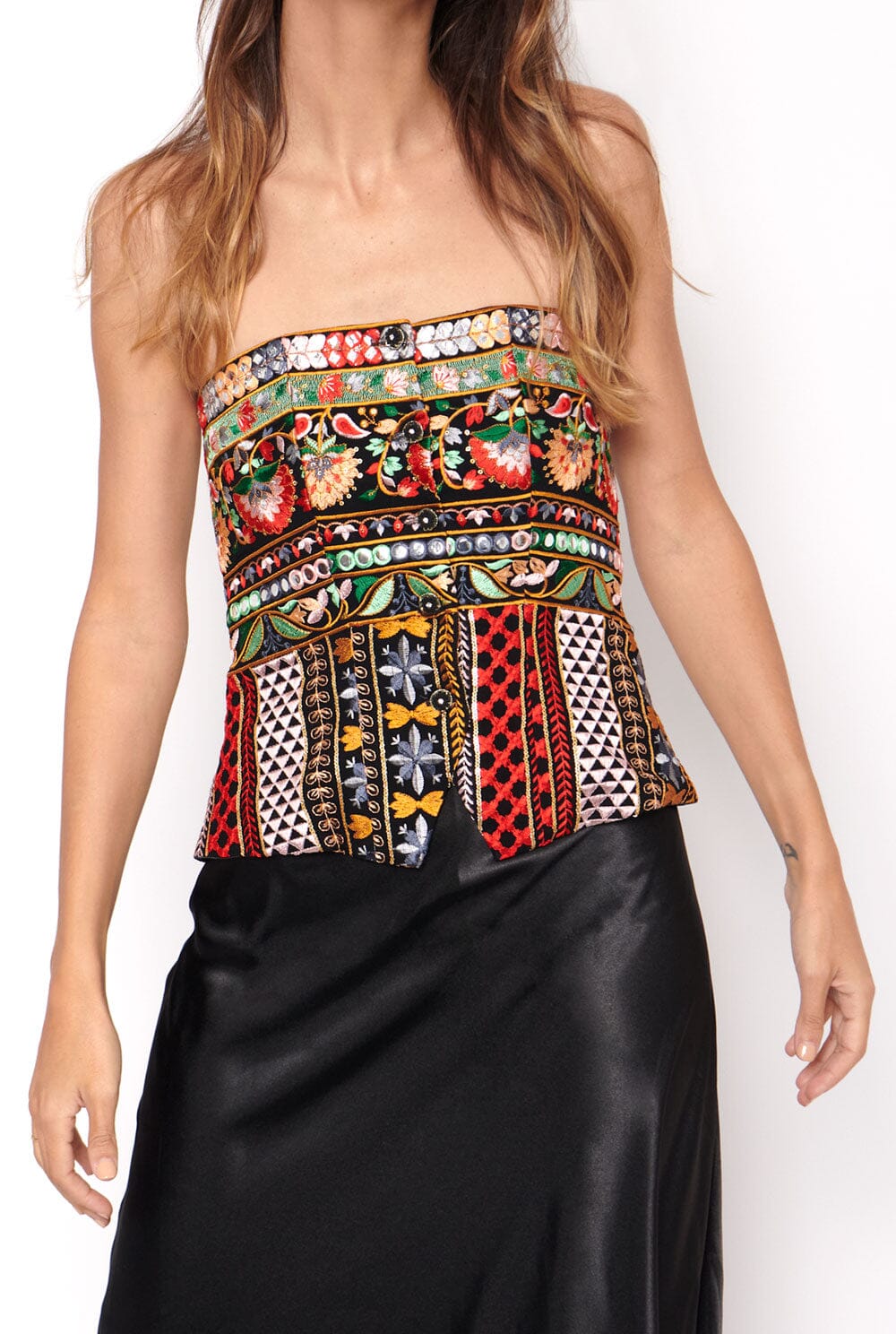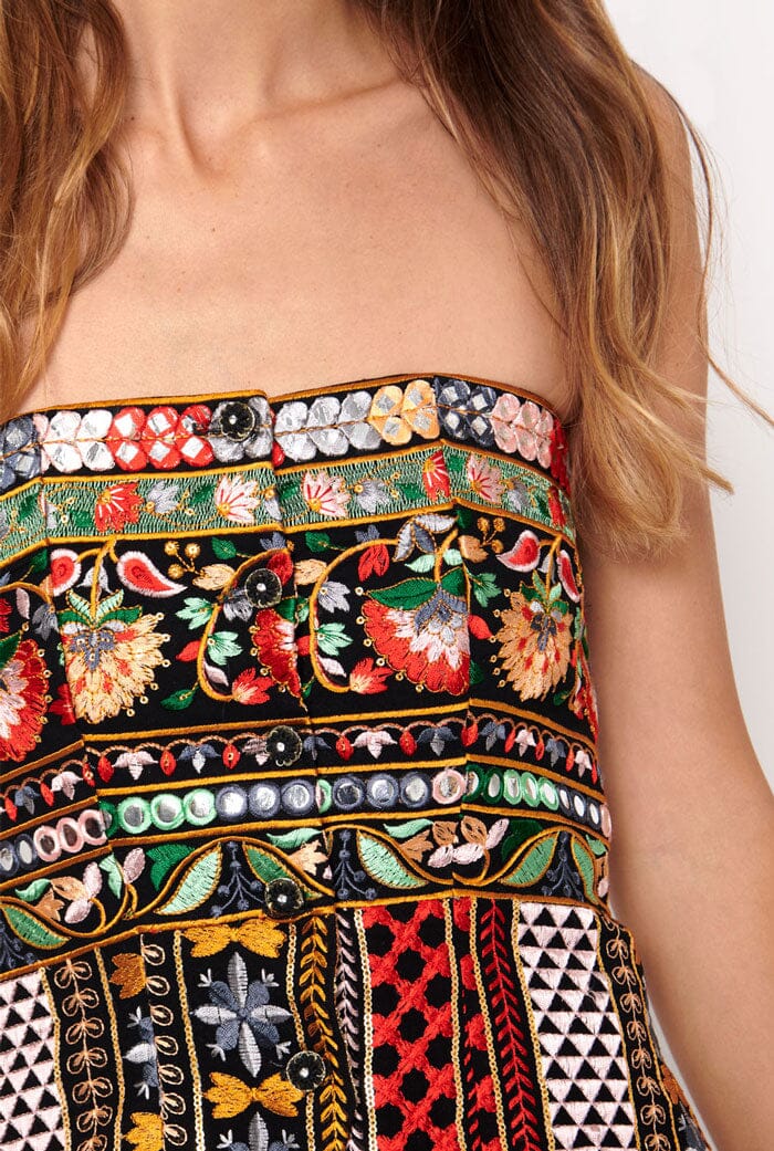 Este diseño de LD está confeccionado en un georgette bordado de rayas con cenefa floral. Modelo con hombros descubiertos y cierre frontal con botones joya. Forrado en raso negro. Limpieza en seco.
