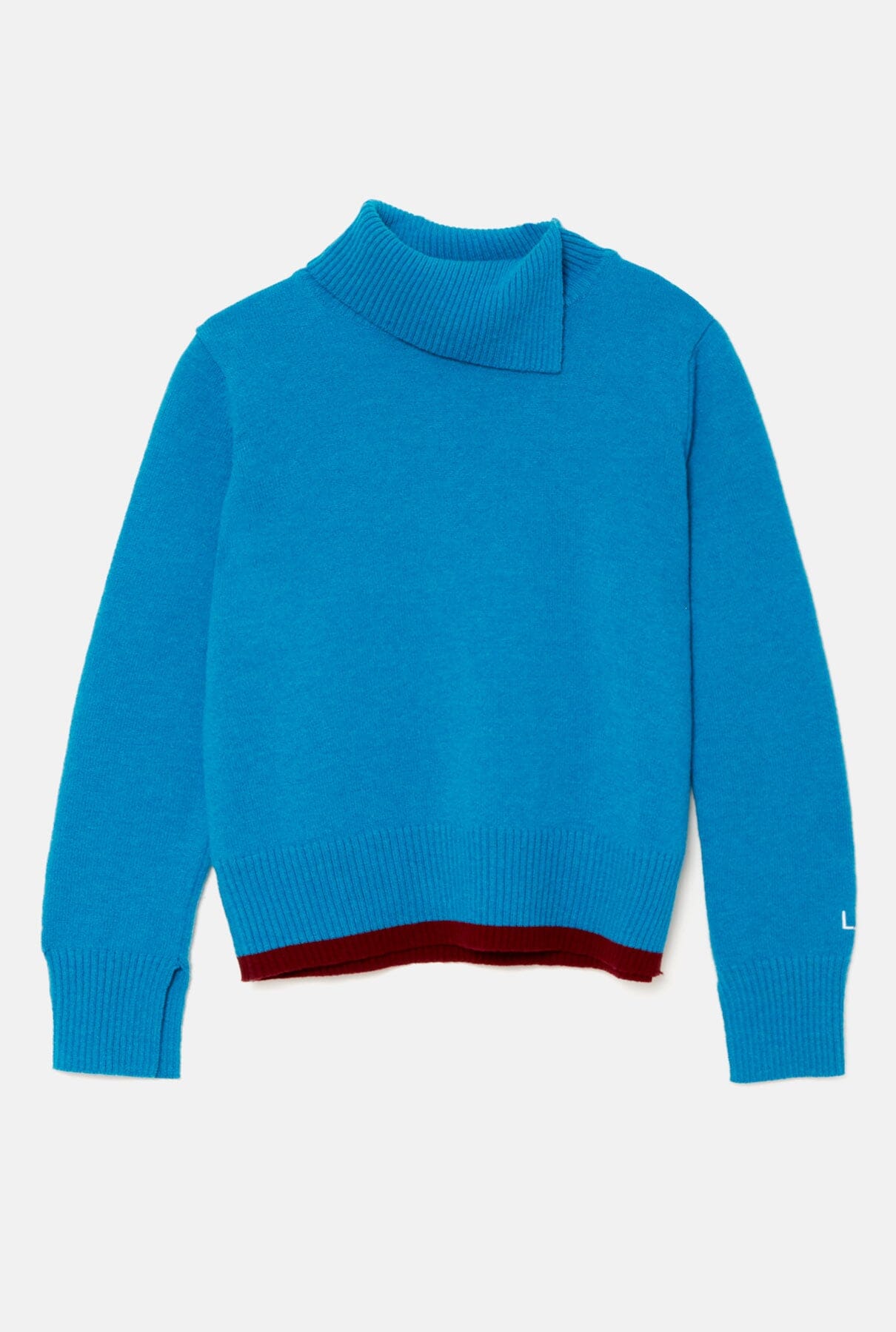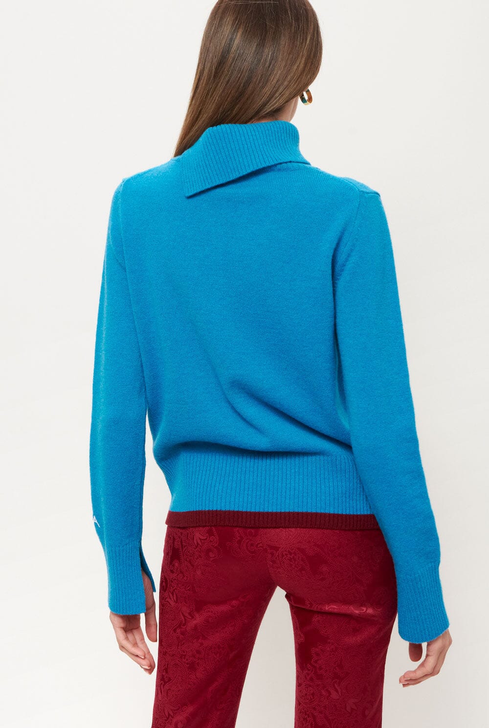El suéter Silvia Turquoise tiene puños recortados y una franja de color burdeos en el panel de contraste. Las mangas están diseñadas intencionalmente para ser un poco más largas que los suéteres habituales. Por último, encontrarás el bordado del logo de la marca en el puño izquierdo. Está fabricado en España en suave lana de cordero con una silueta ligeramente holgada y tiene un cuello de tortuga abierto y ribetes anchos de canalé. Este es un colorido punto diario ideal para agregar a tu guardarropa este invierno. Diseñado por Laia Alén.
