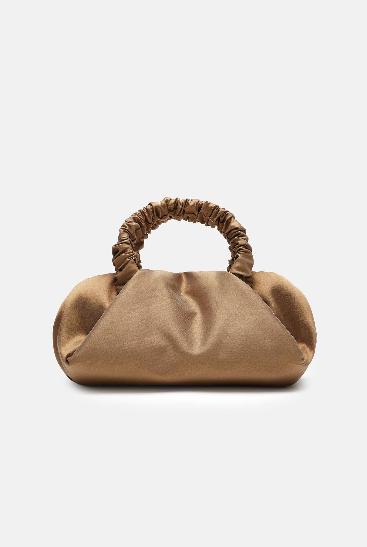 Crafted from luxurious and smooth silk-satin, the Sita Bag is a soft pochette with ruffle handles and a button closure.