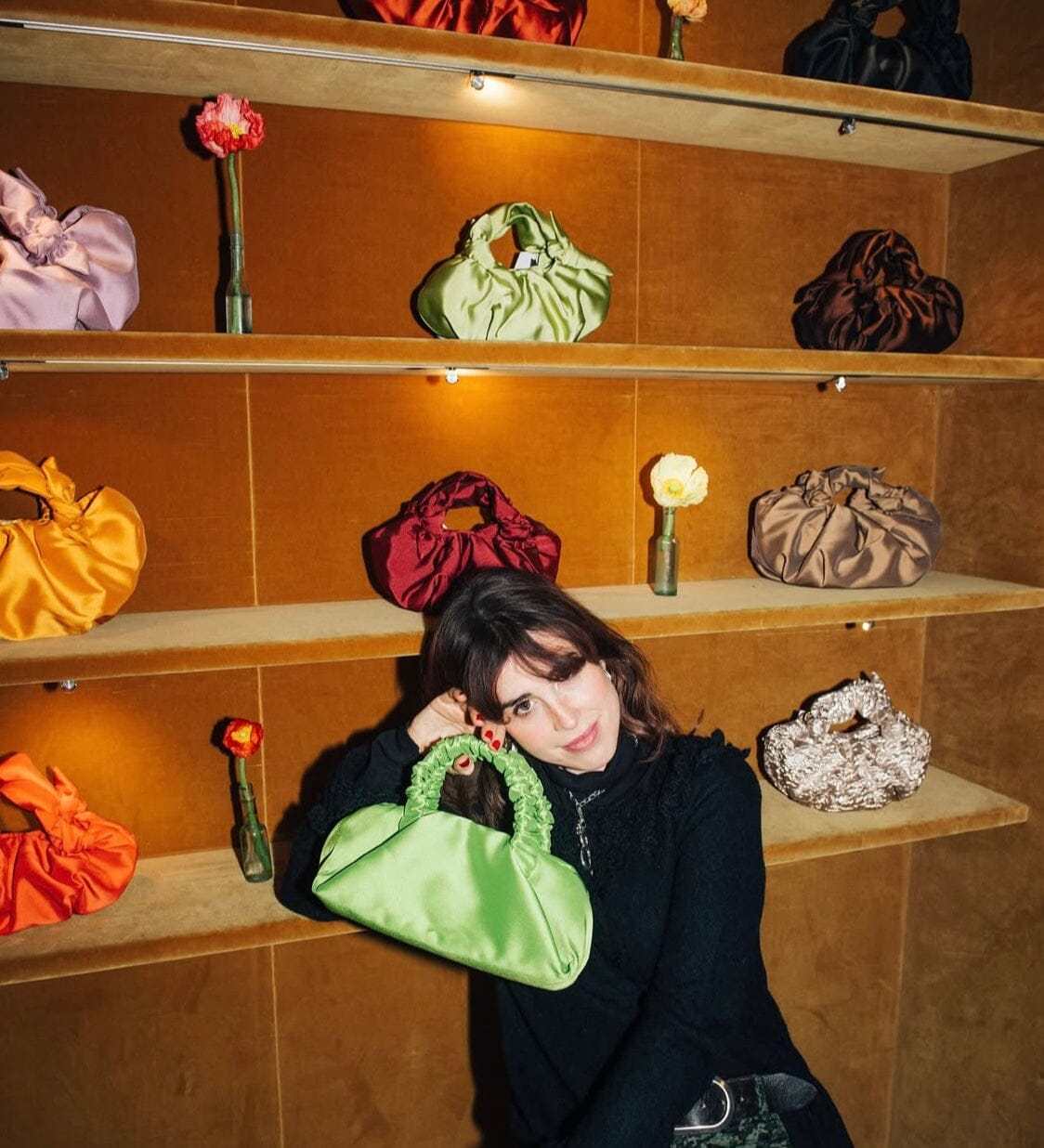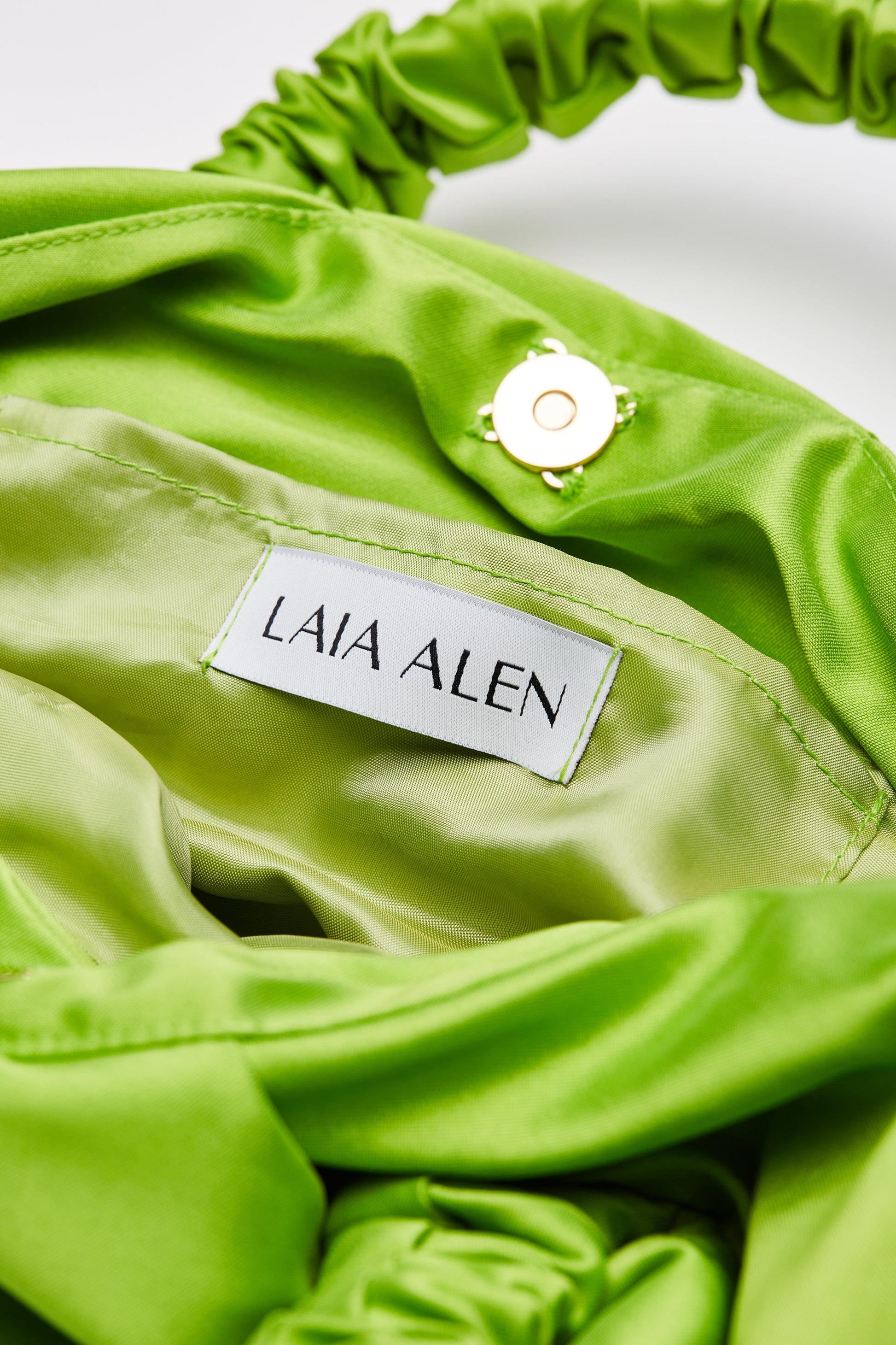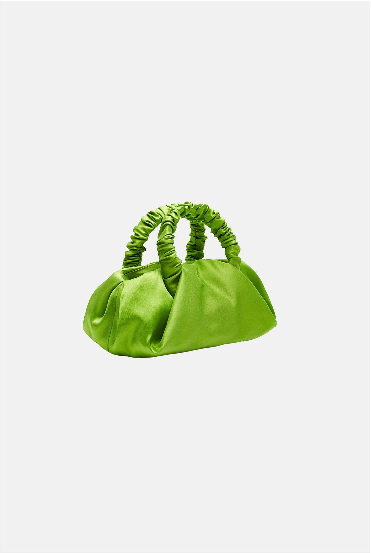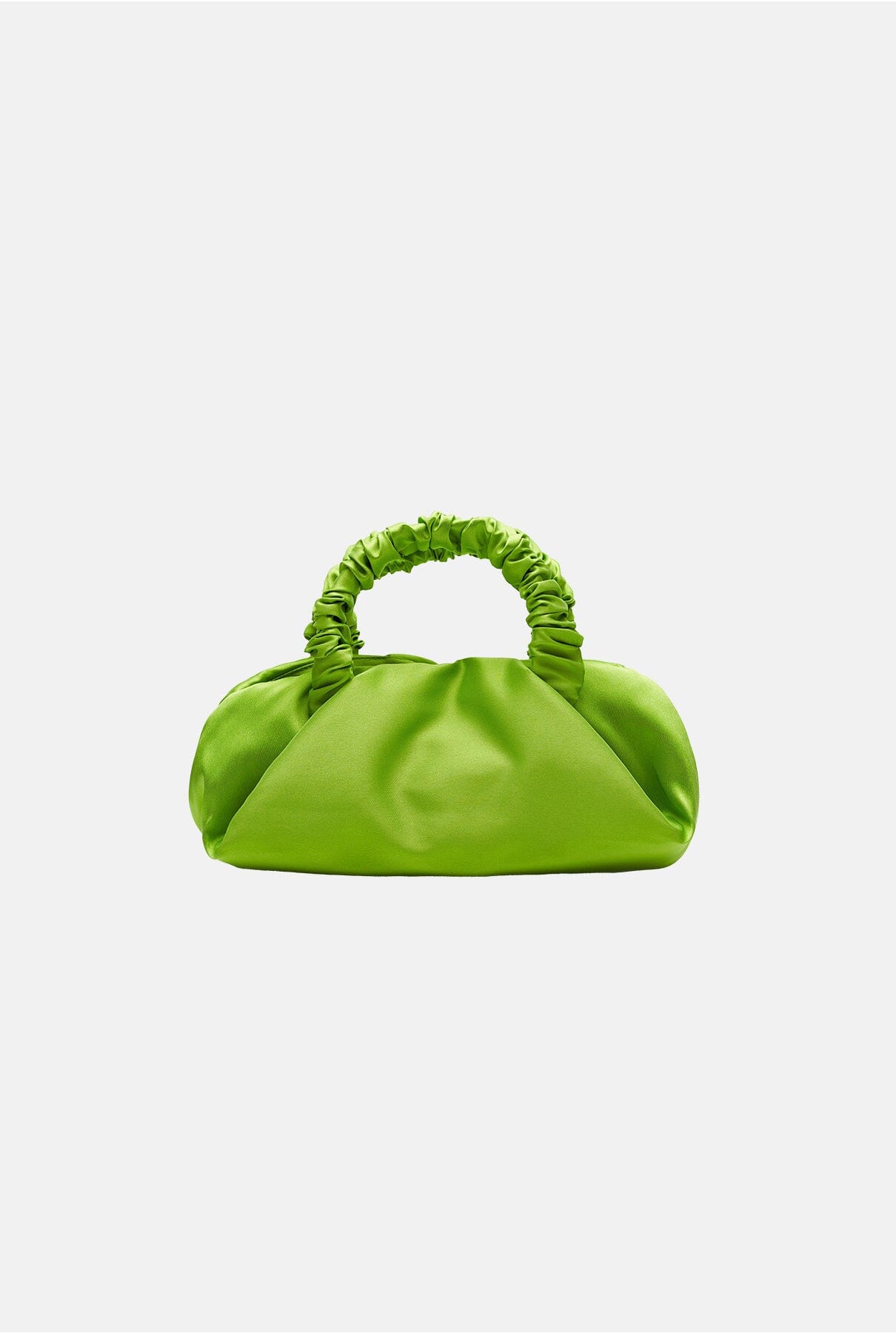 Crafted from luxurious and smooth silk-satin, the Sita Bag is a soft pochette with ruffle handles and a button closure.
