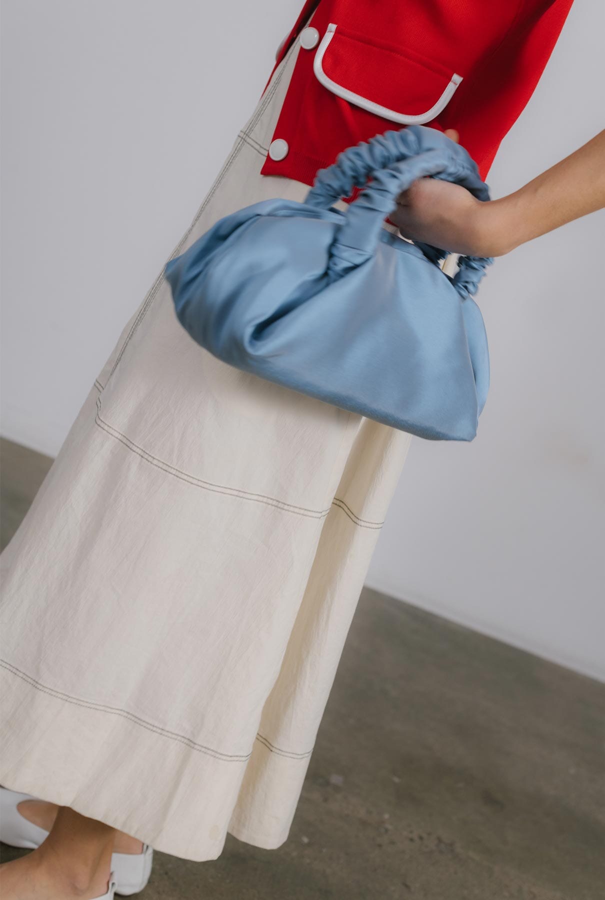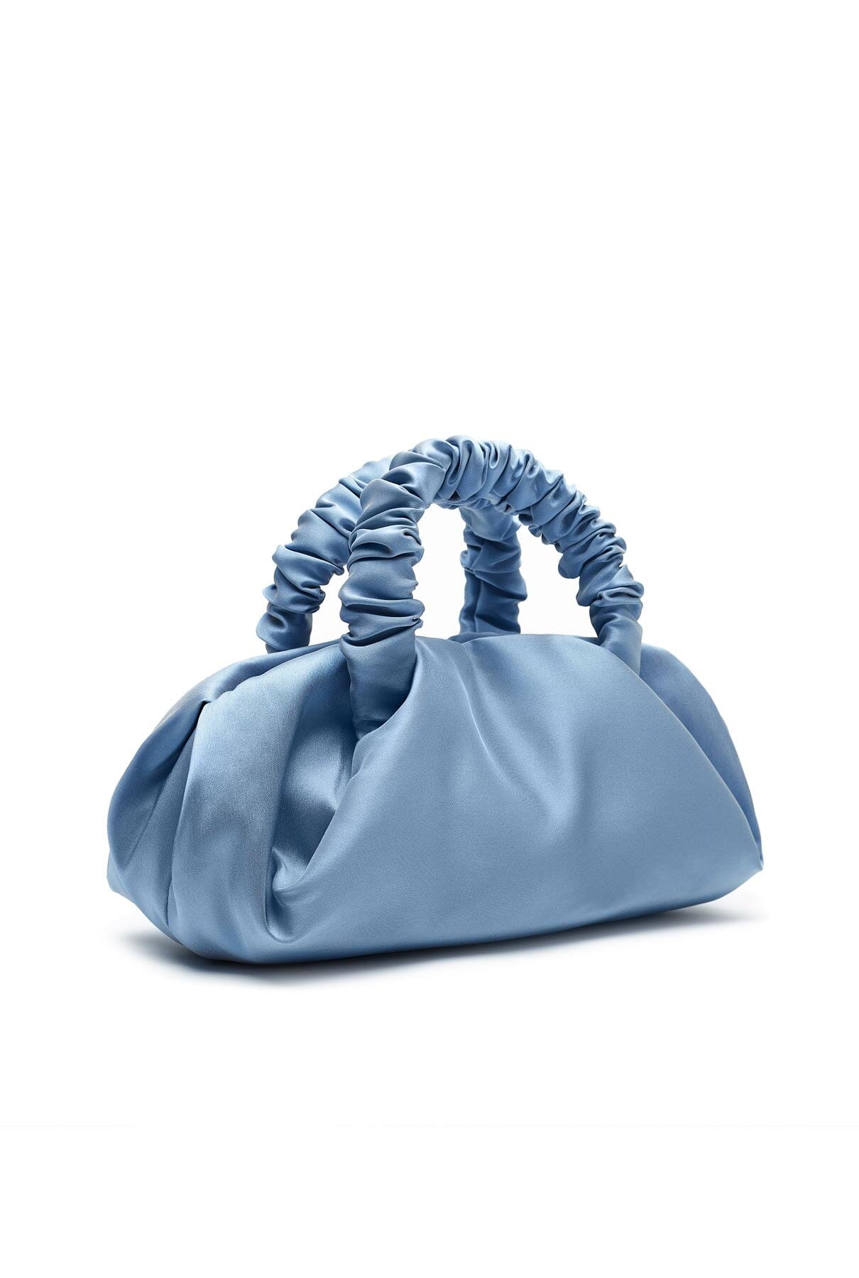 Crafted from luxurious and smooth silk-satin, the Sita Bag is a soft pochette with ruffle handles and a button closure.