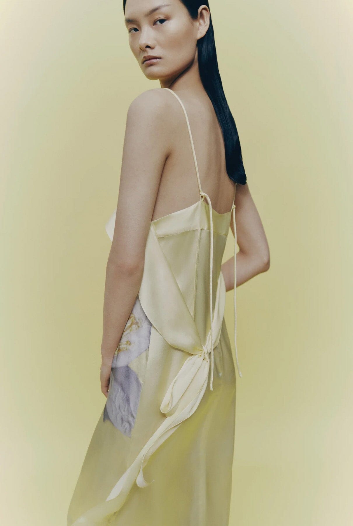 VESTIDO LEGGING, DE TIRANTES FINOS AJUSTABLES, ESTAMPADO CON MOTIVO FLORAL DE PEONÍA. EL VESTIDO ESTÁ CONFECCIONADO DEL DENTRO FUERA, HACIENDO VISIBLES LAS PINCHAS Y LA VISTA DEL ESCOTE, QUE A SU VEZ SE ALONGA DECORANDO EL FRENTE DE LA PRENDA.