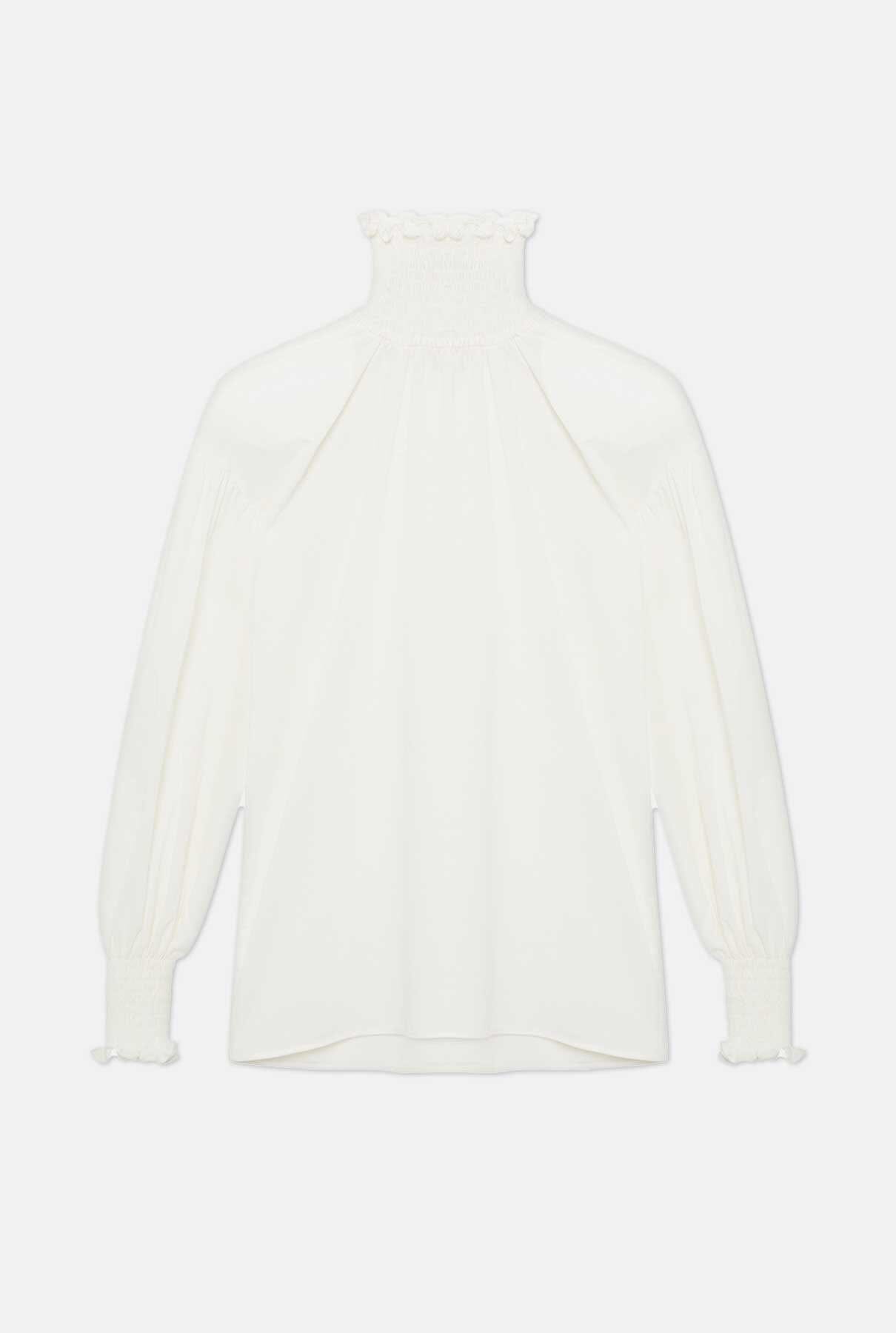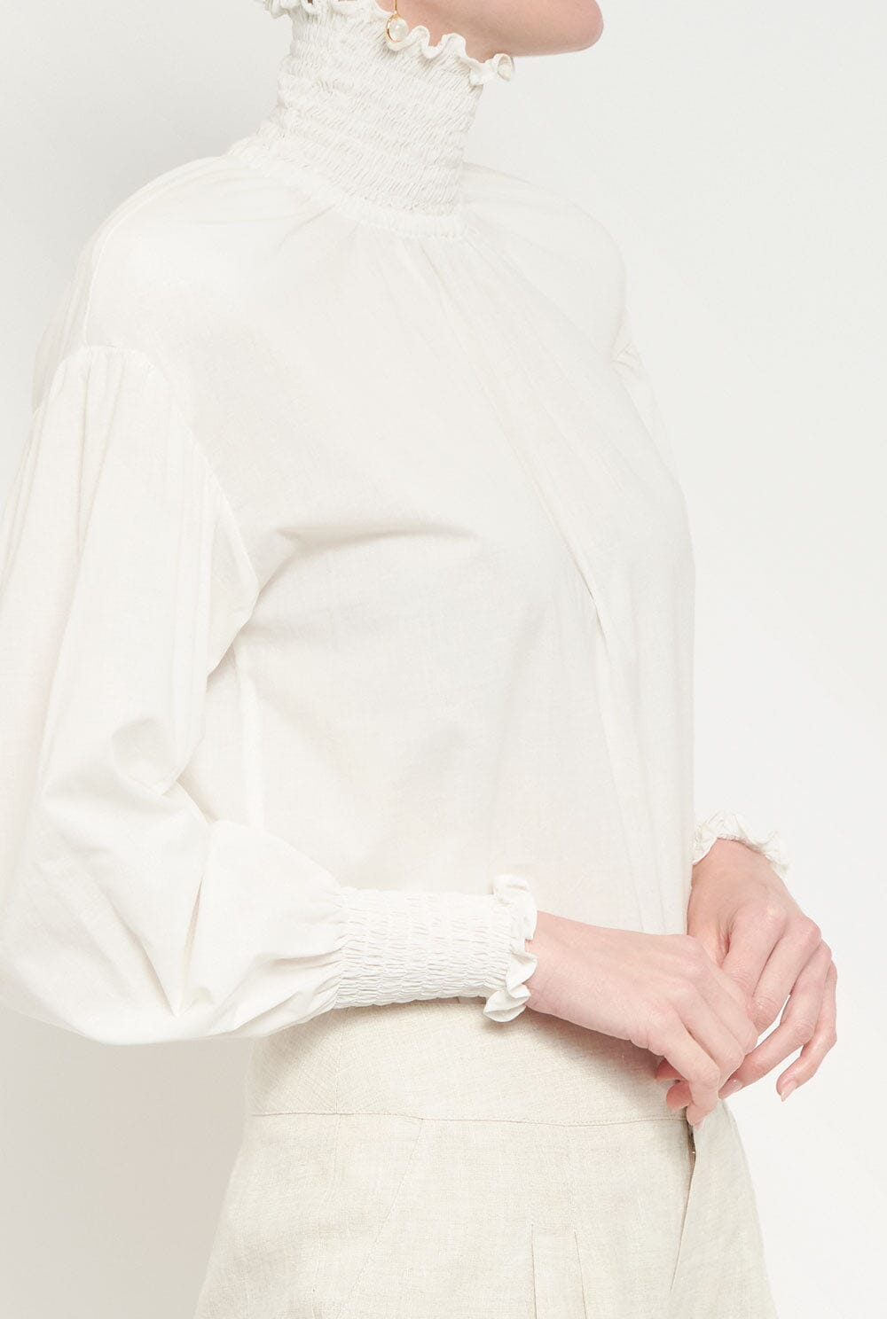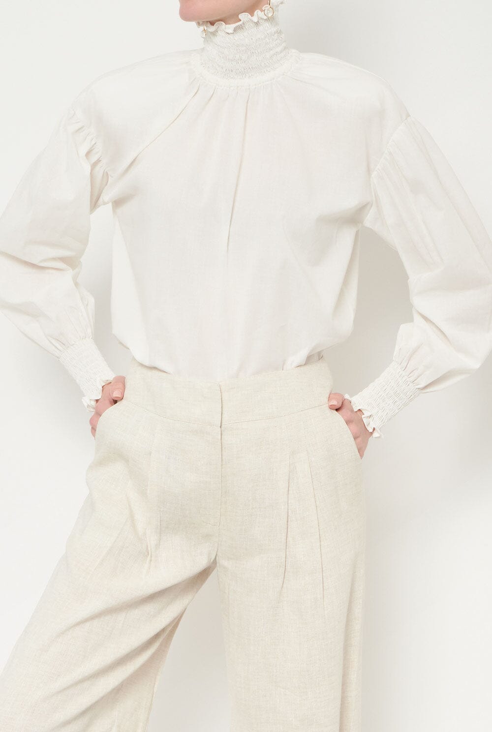 Camisa de manga larga en color crudo, con cuello alto y puños con fruncido elástico. Confeccionada en algodón 100% orgánico. Diseñada por Julise Magon.