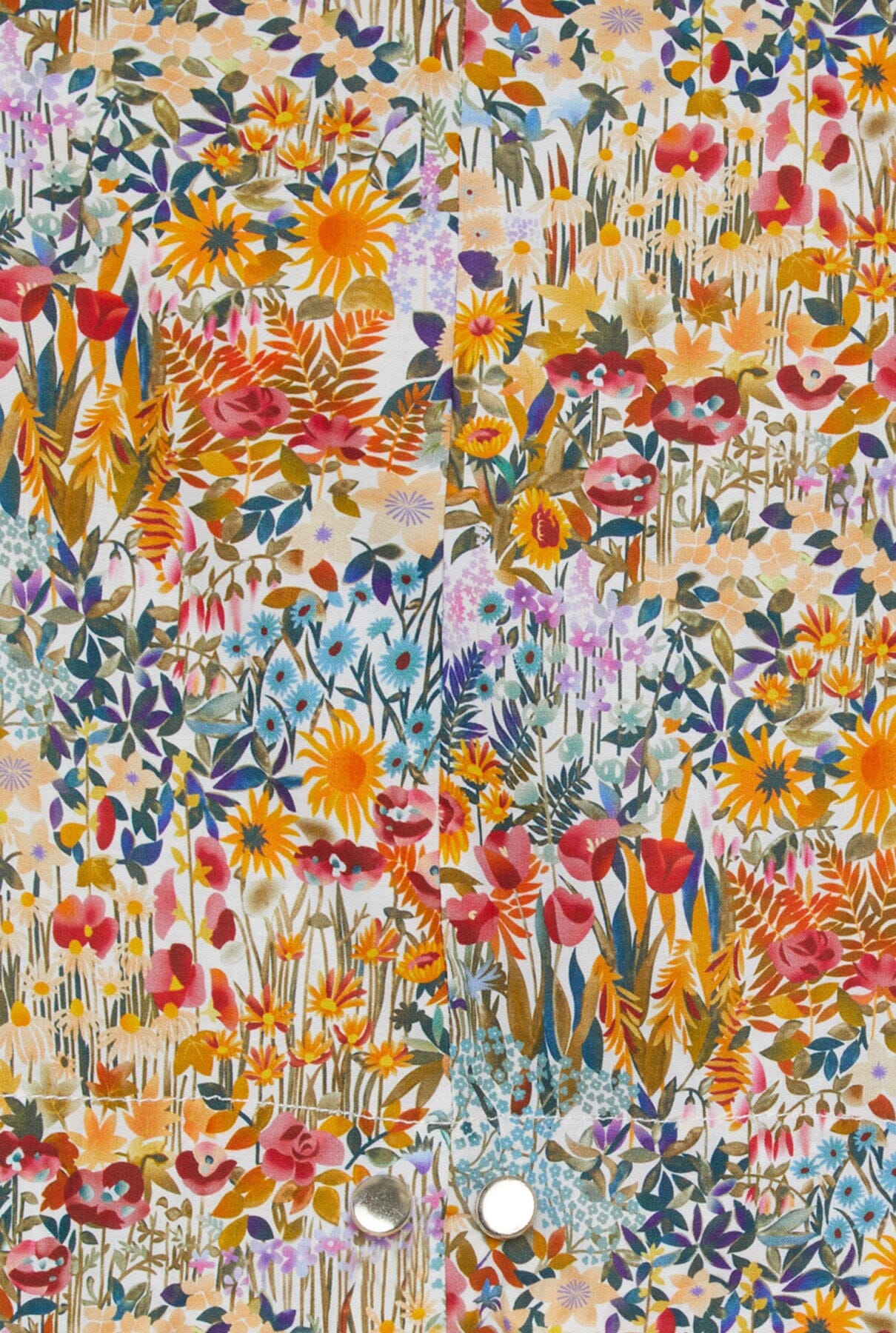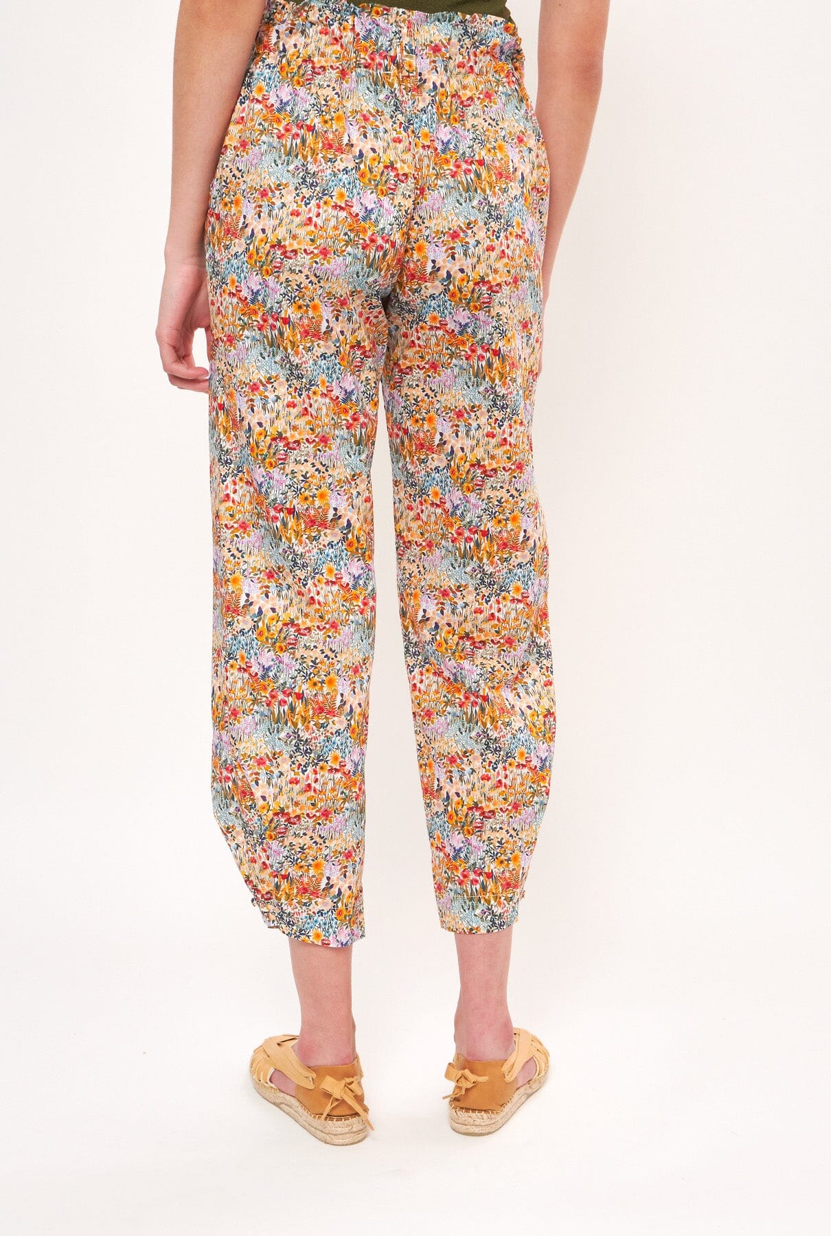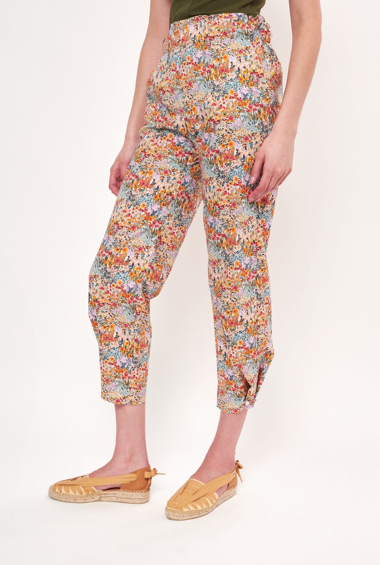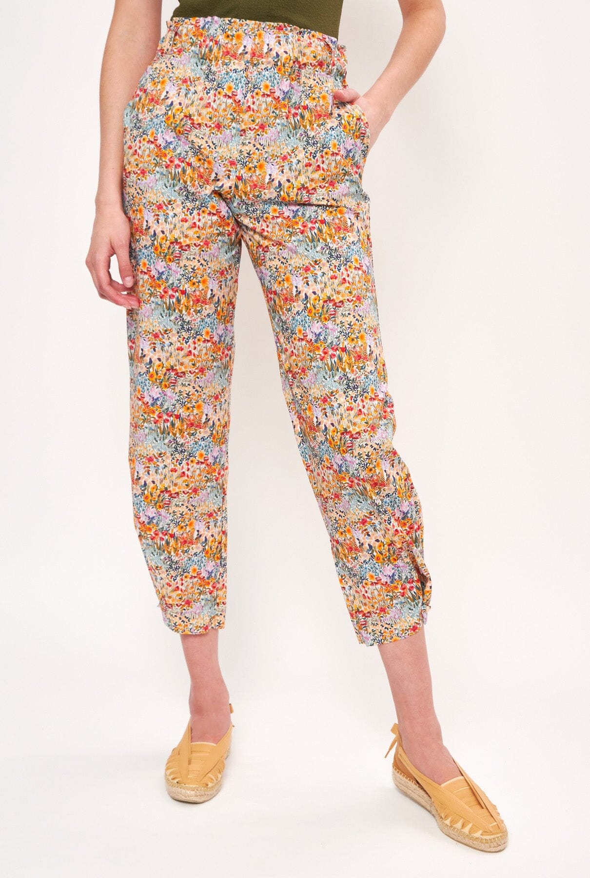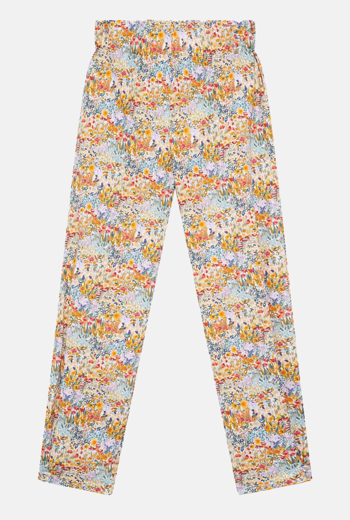 Pantalón estampado en tejido de algodón multiflores de colores. Cómoda cintura elástica para un mejor ajuste. El detalle de botones en el bajo permite llevarlos completamente sueltos al estar desabrochados, creando un efecto pantalón recto o más entallado, y con una forma ligeramente abullonada al abotonarlos. Con bolsillos y trabillas para cinturón. Para un look completo te sugerimos combinarlos con una camisa Marieta, un top Miru o Pam.