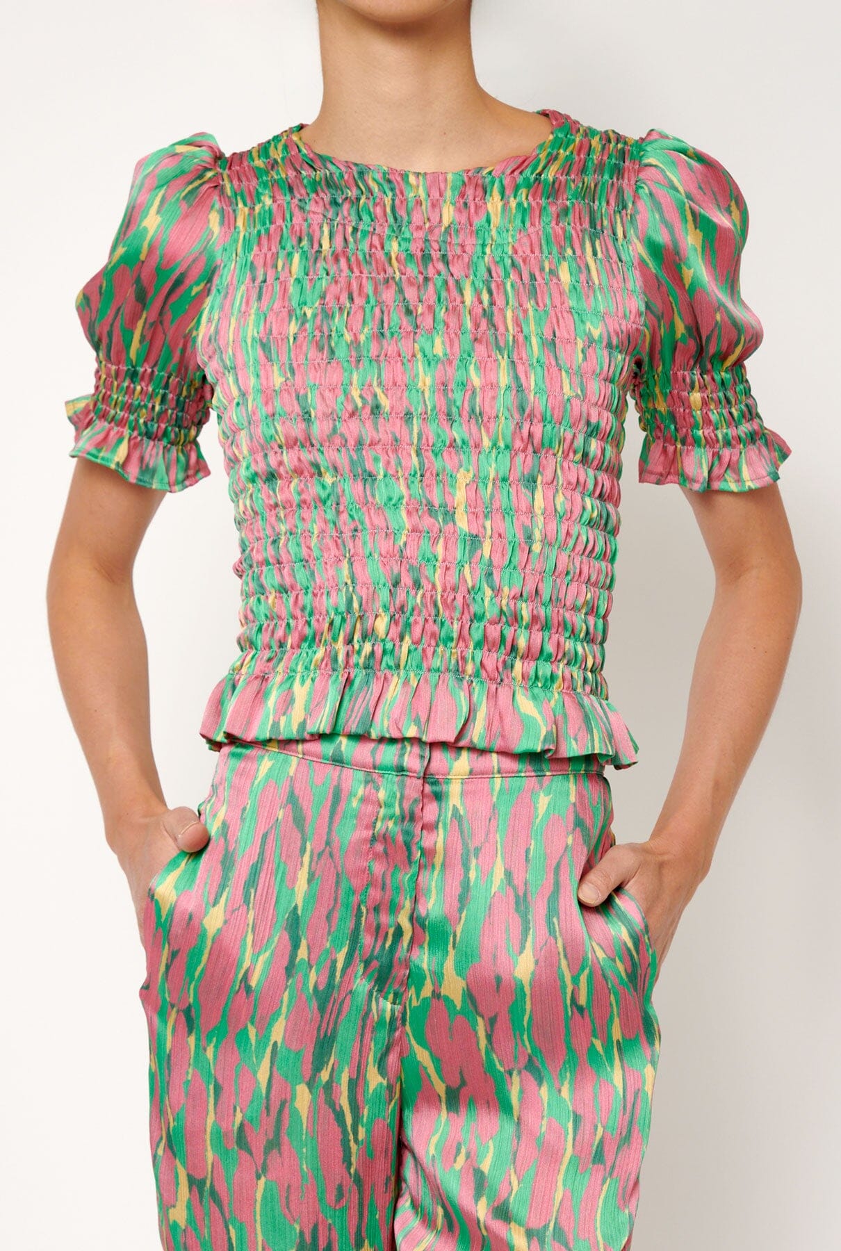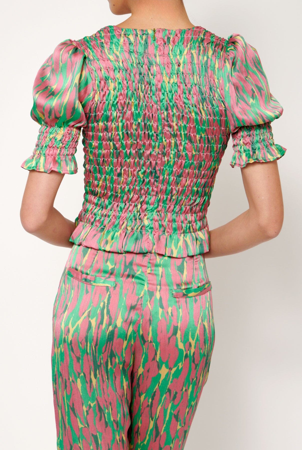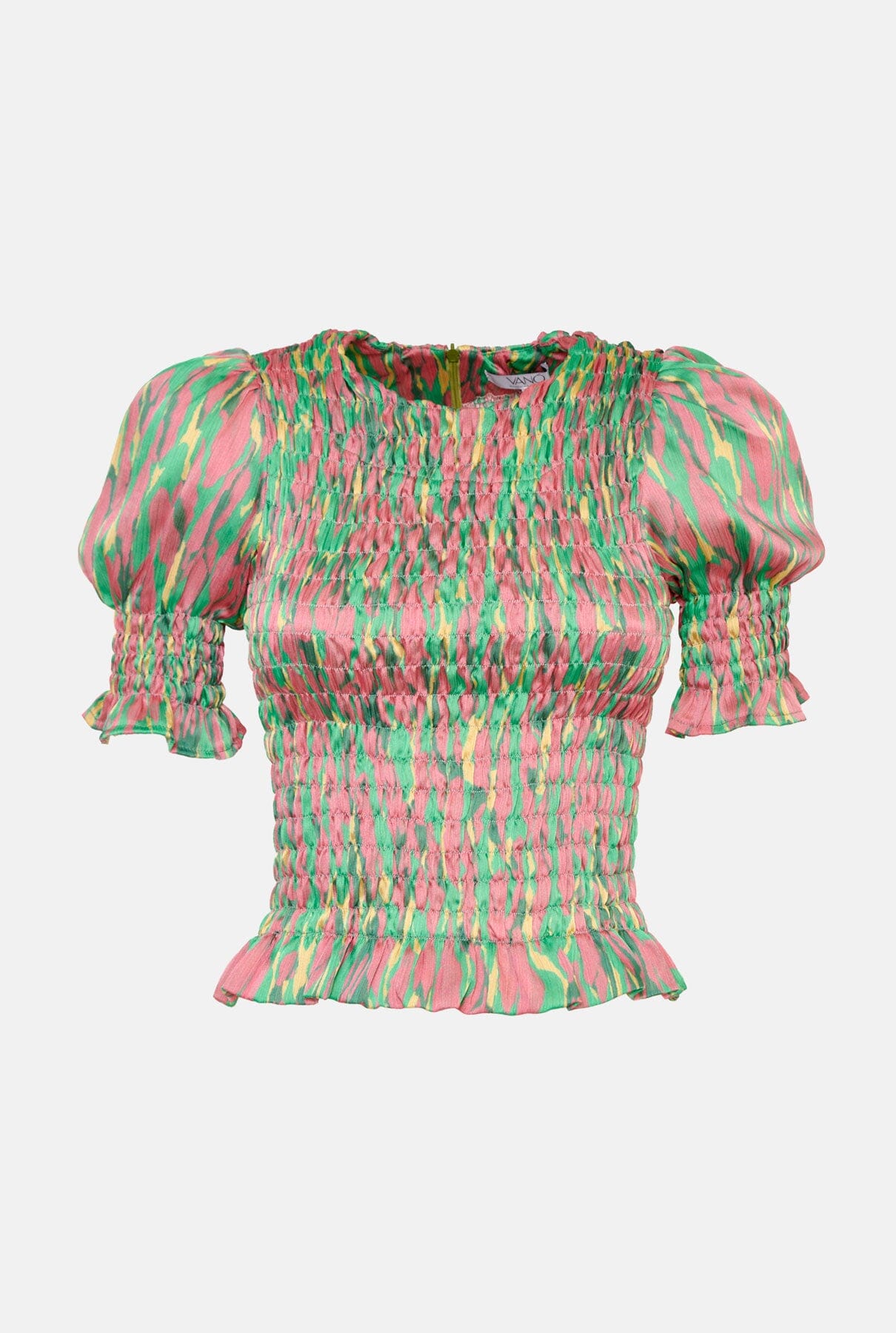 Top de manga corta con cuerpo fruncido que se adapta a diferentes tipos de cuerpo. Mangas cortas con pequeños frunces y cierre en espalda con cremallera invisible.
