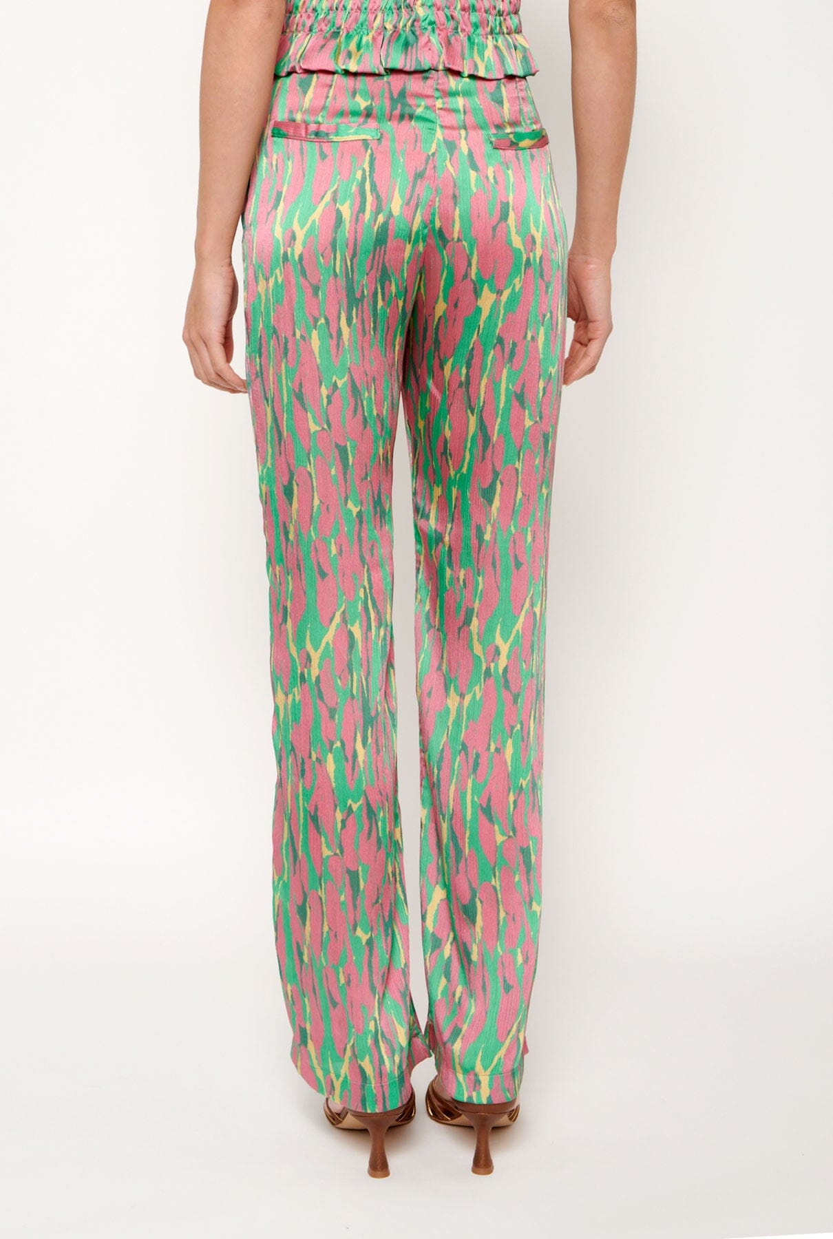 Pantalón estilo palazzo, cierre frontal con botón interior y cremallera en tejido estampado en rojo y beige. Bolsillos laterales en costura y detalle de falso bolsillo en espalda.