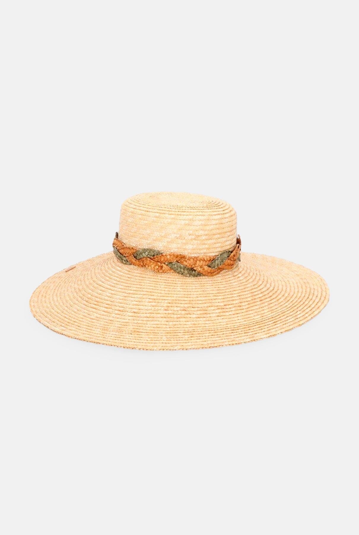 Sombrero de paja de trigo con trenza alrededor de la copa en color camel y oliva. Un sombrero diseñado tanto para el día a día como para cualquier evento especial.