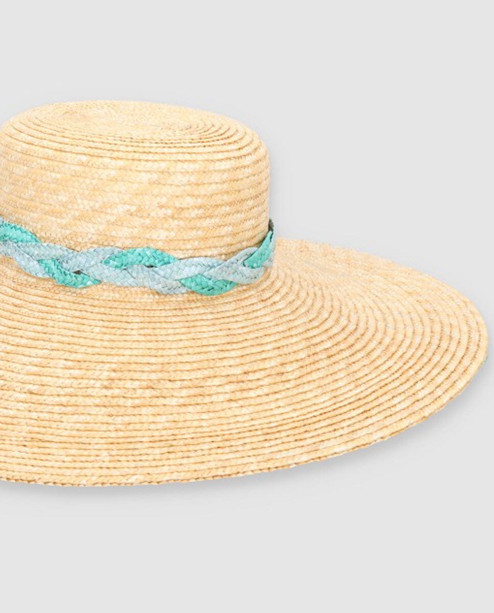 Sombrero de paja de trigo con trenza en la copa en turquesa y azul bebé. Un sombrero diseñado tanto para uso diario como para cualquier evento especial.