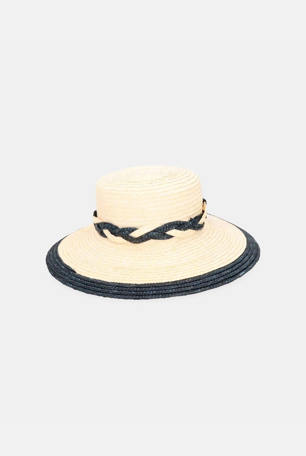 Sombrero de paja de trigo con trenza en la parte superior, en negro y blanco roto. El sombrero es blanco roto y tiene un acabado negro. Un sombrero diseñado tanto para uso diario como para cualquier evento especial.
