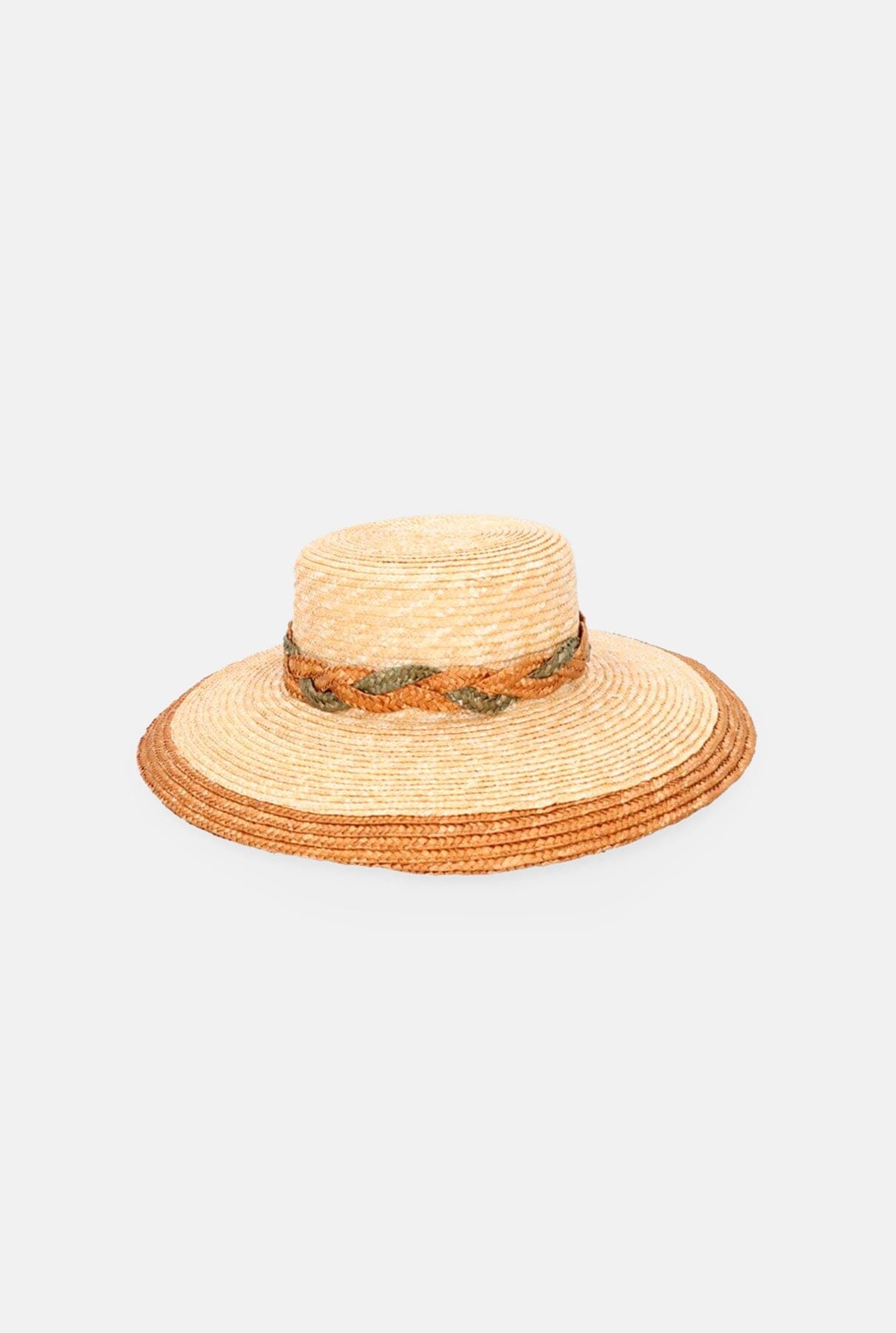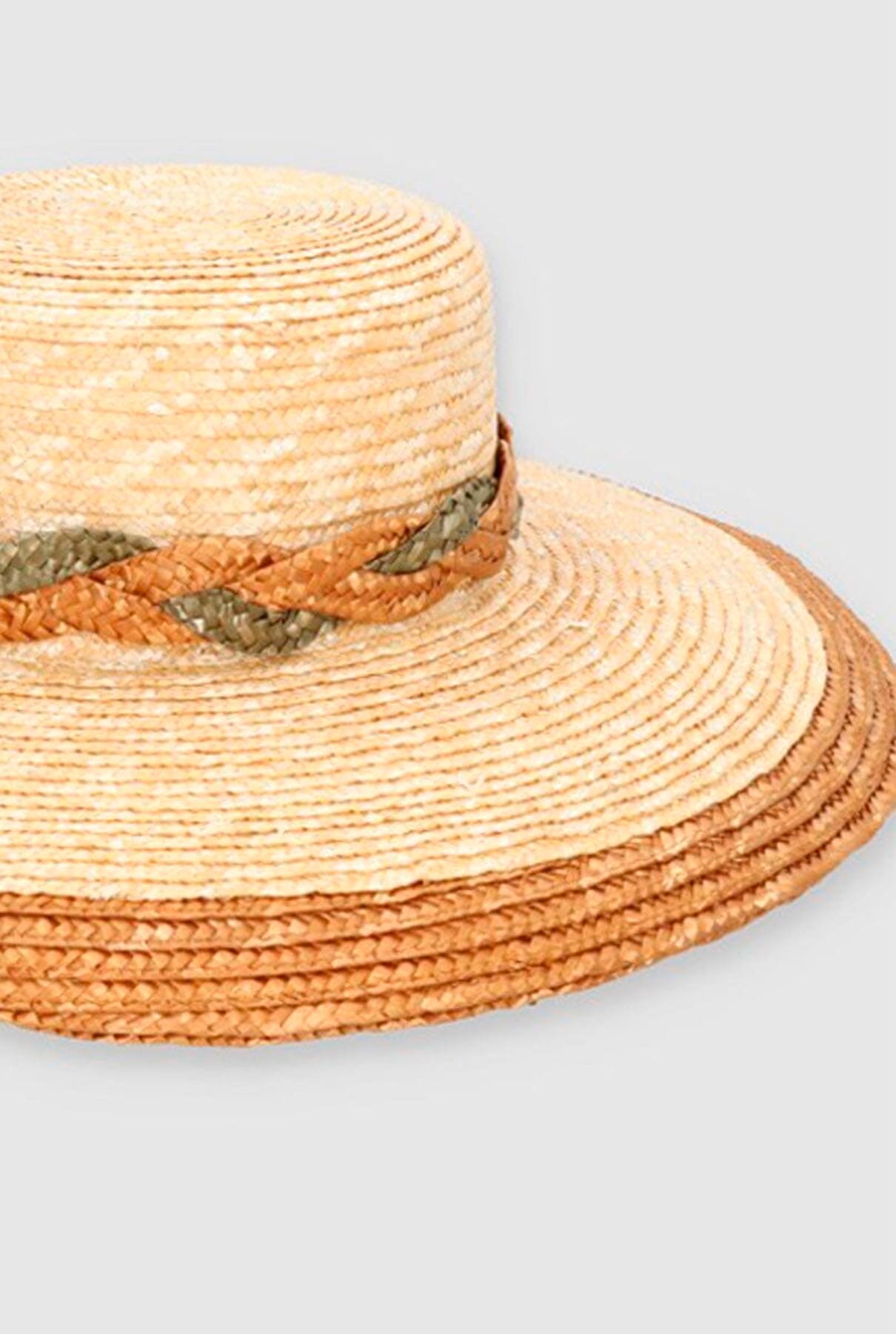 Sombrero de paja de trigo con trenza en la parte superior en tonos oliva y camel. Acabado en color camel. Un sombrero diseñado tanto para uso diario como para cualquier evento especial.