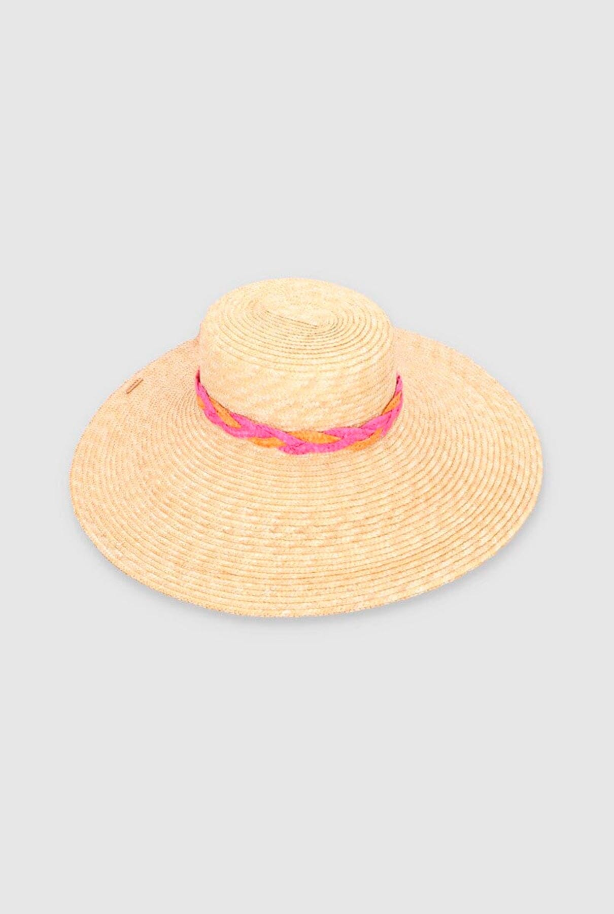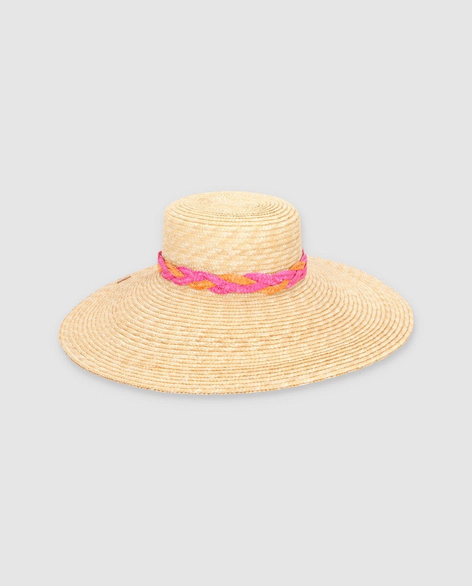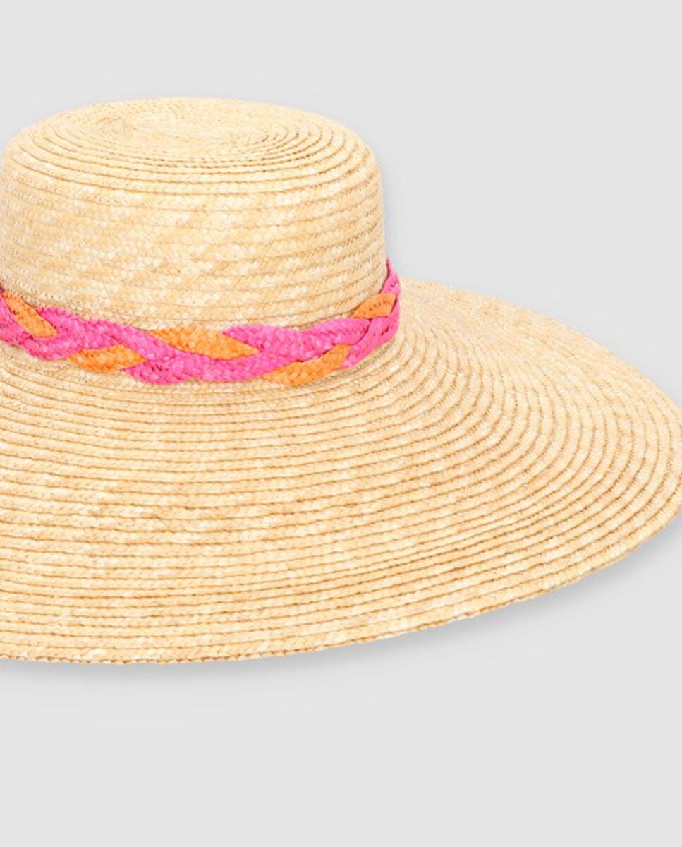 Sombrero de paja de trigo con trenza en la copa, en tonos fucsia y naranja. Un sombrero diseñado tanto para uso diario como para cualquier evento especial.