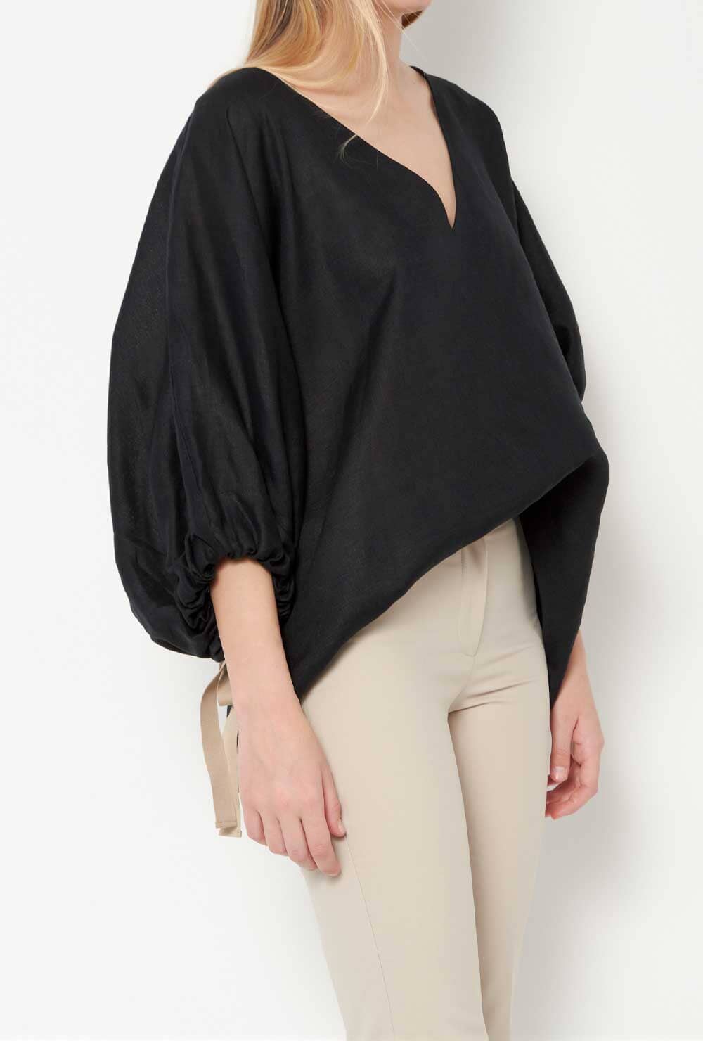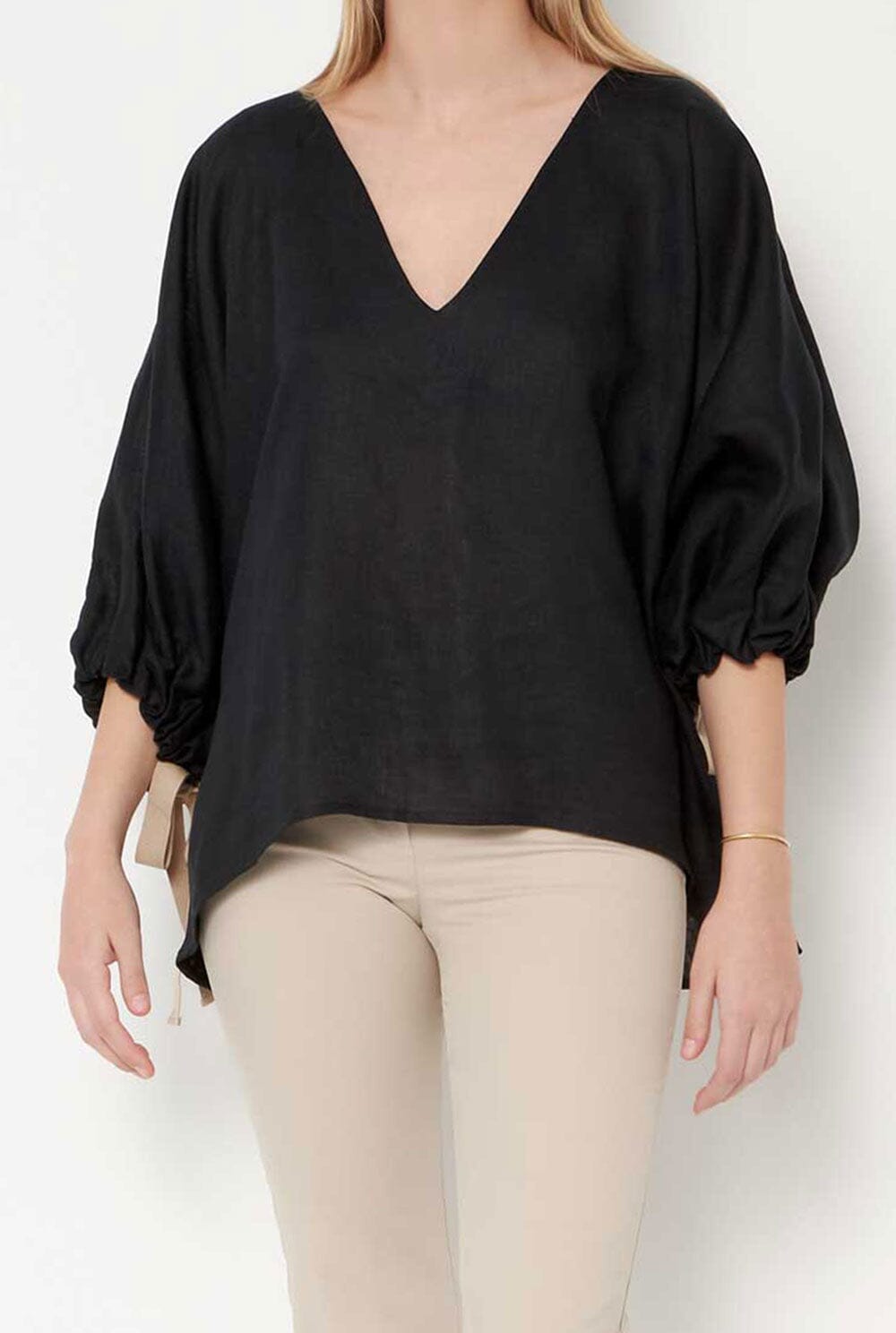 Camisa de lino con escote en pico. Tiene mangas de murciélago con cinta de color en contraste. Lavar a mano, planchar a baja temperatura, no secar en secadora, no usar lejía. Diseñado por Alava Brand